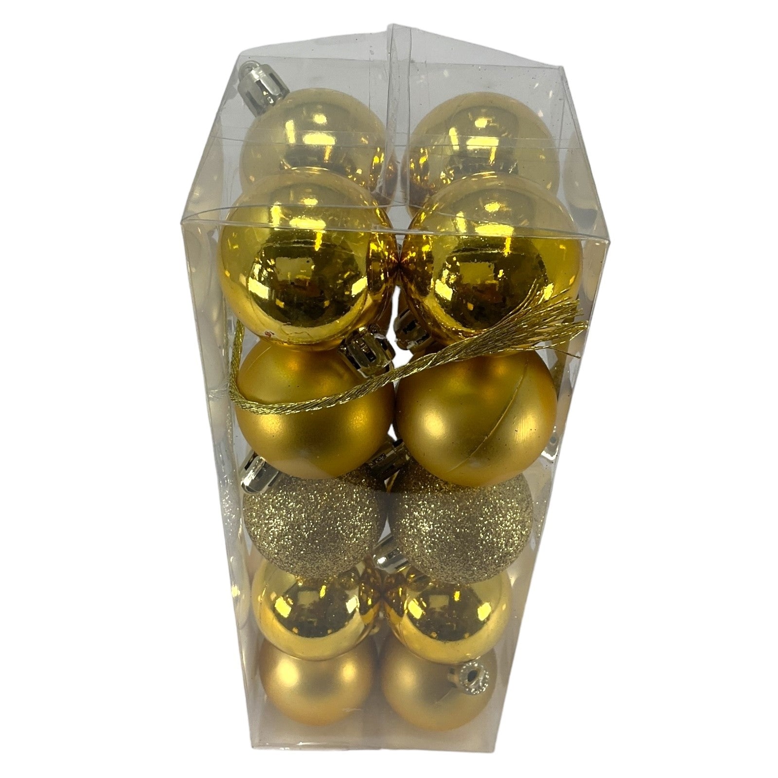 Shiny matte and glitter gold Christmas ball ornaments. 20 piece set. 1.5 Inch diameter. Made of shatterproof plastic.