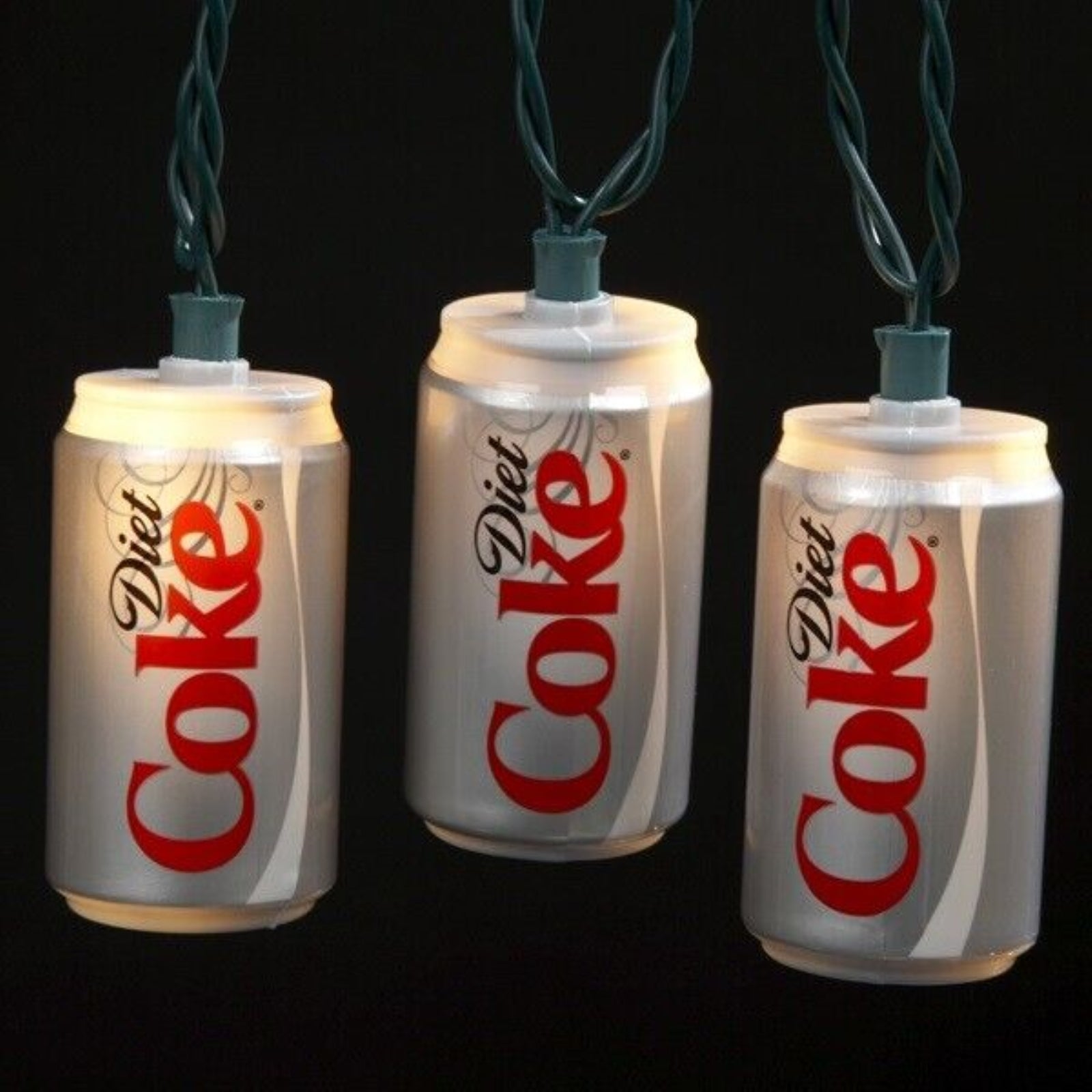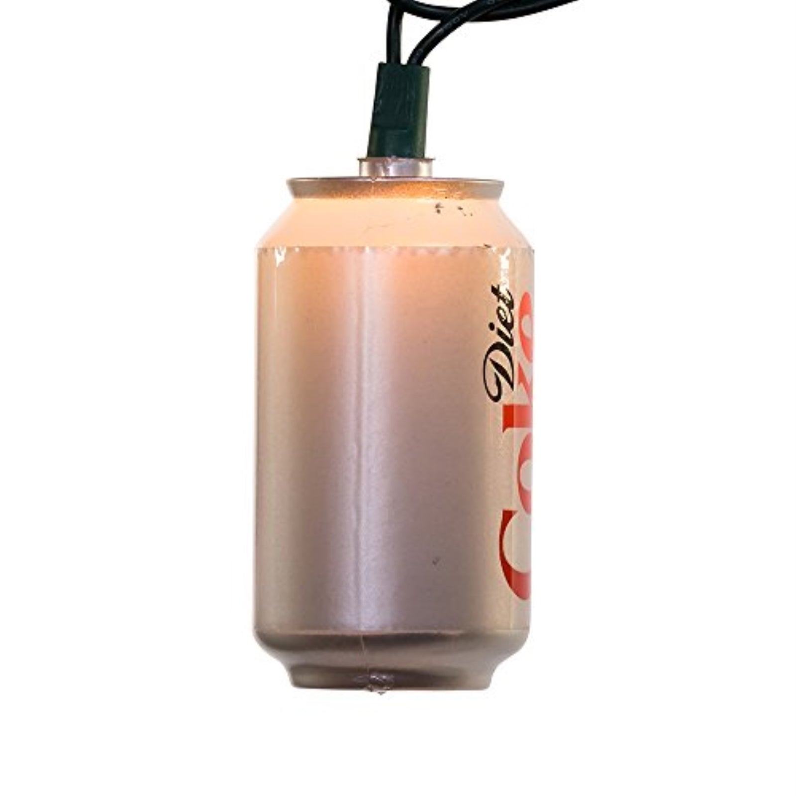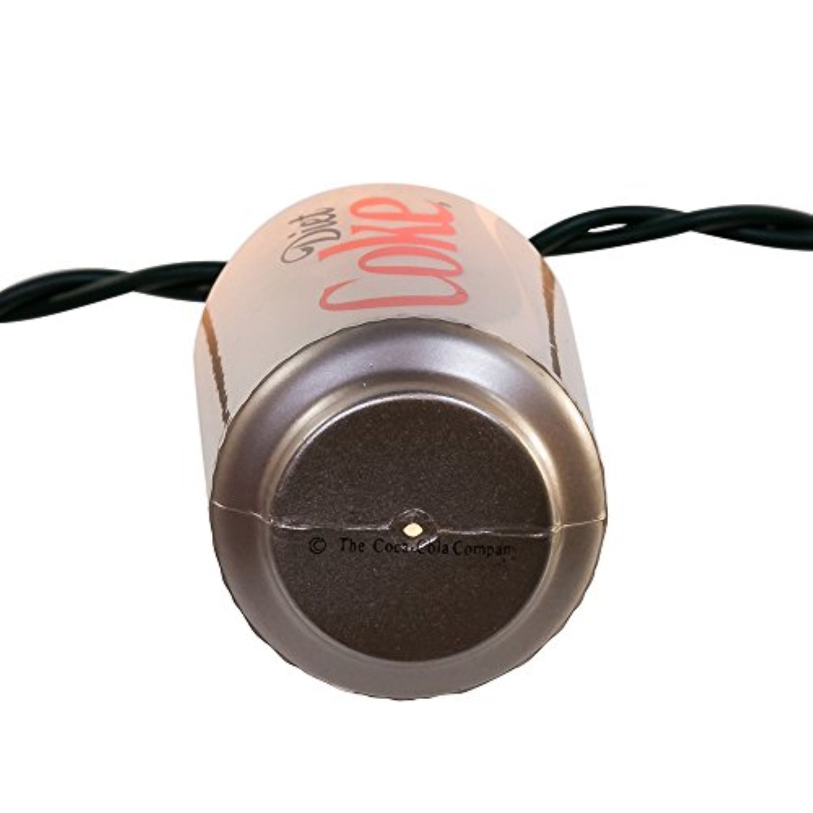 Diet Coke Cans Christmas Lights. Item includes 10 lights with 12 inch (30 cm) spacing. Approximately 30 inch long lead wire (76 cm). Made from plastic. Used 12V 0.08A incadescent bulbs. Comes with 4 spare bulbs and 2 replacement fuses. Indoor use only. Includes original manufacturers box and packaging. Made by Kurt Adler.