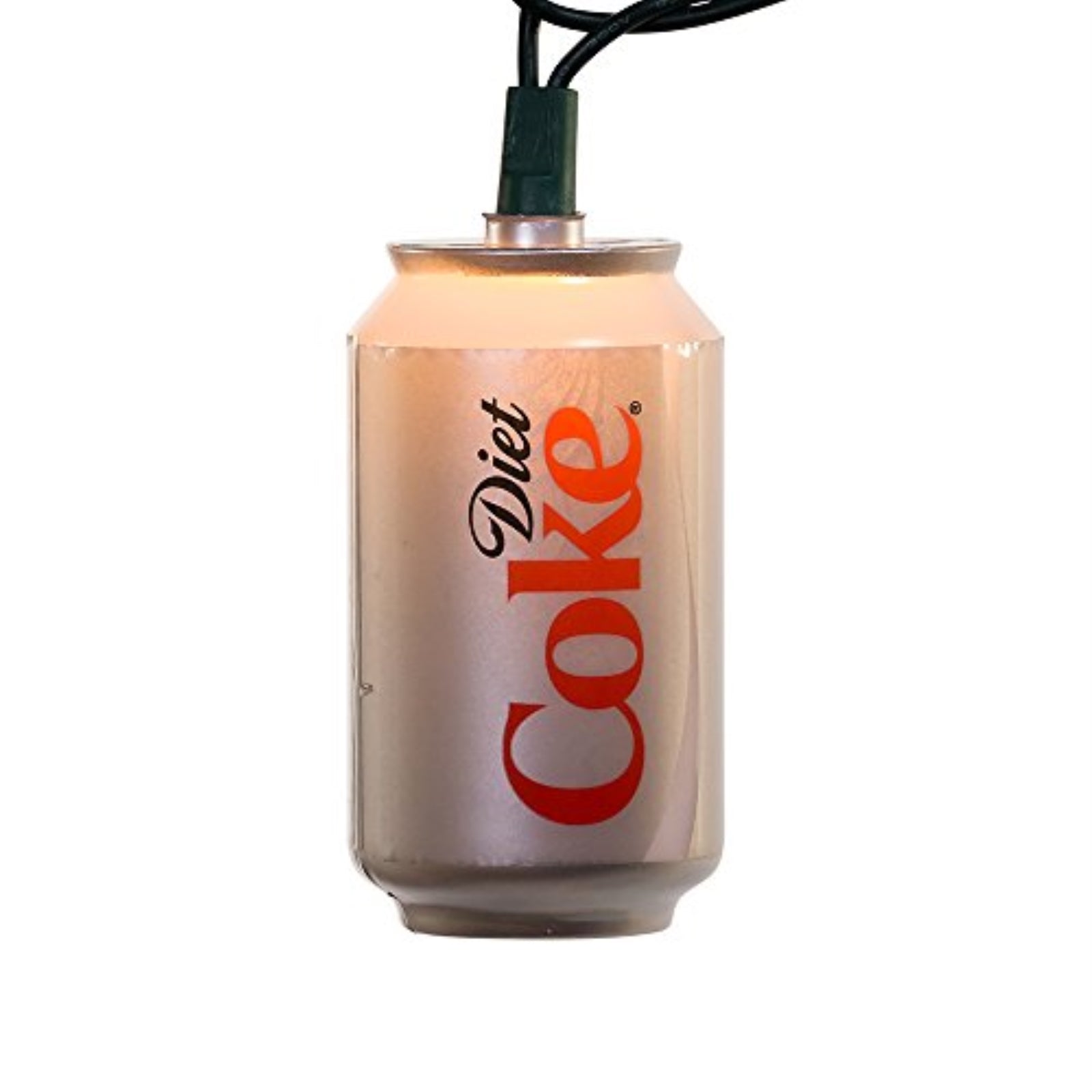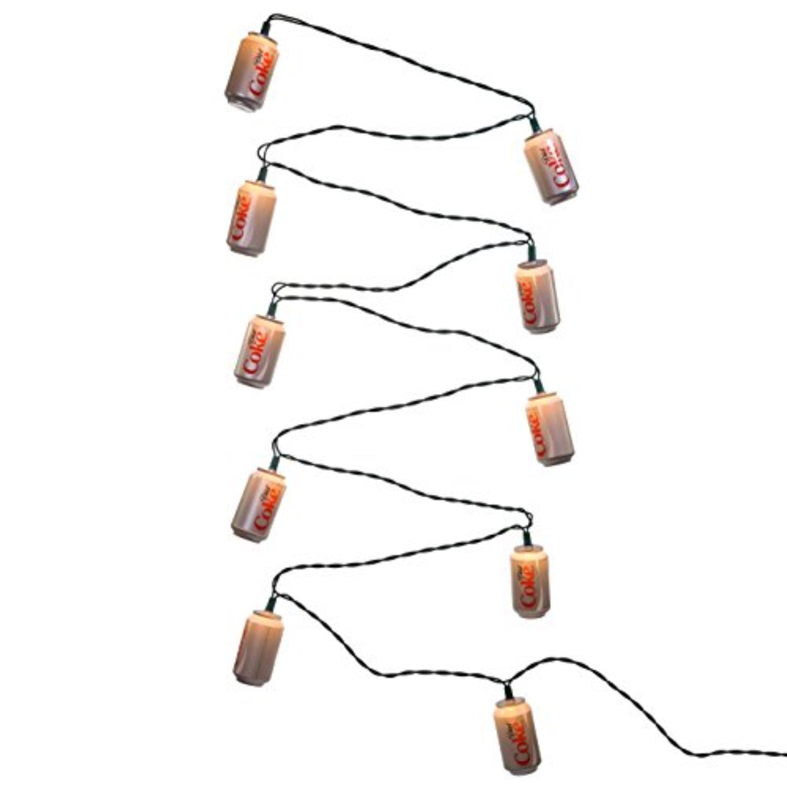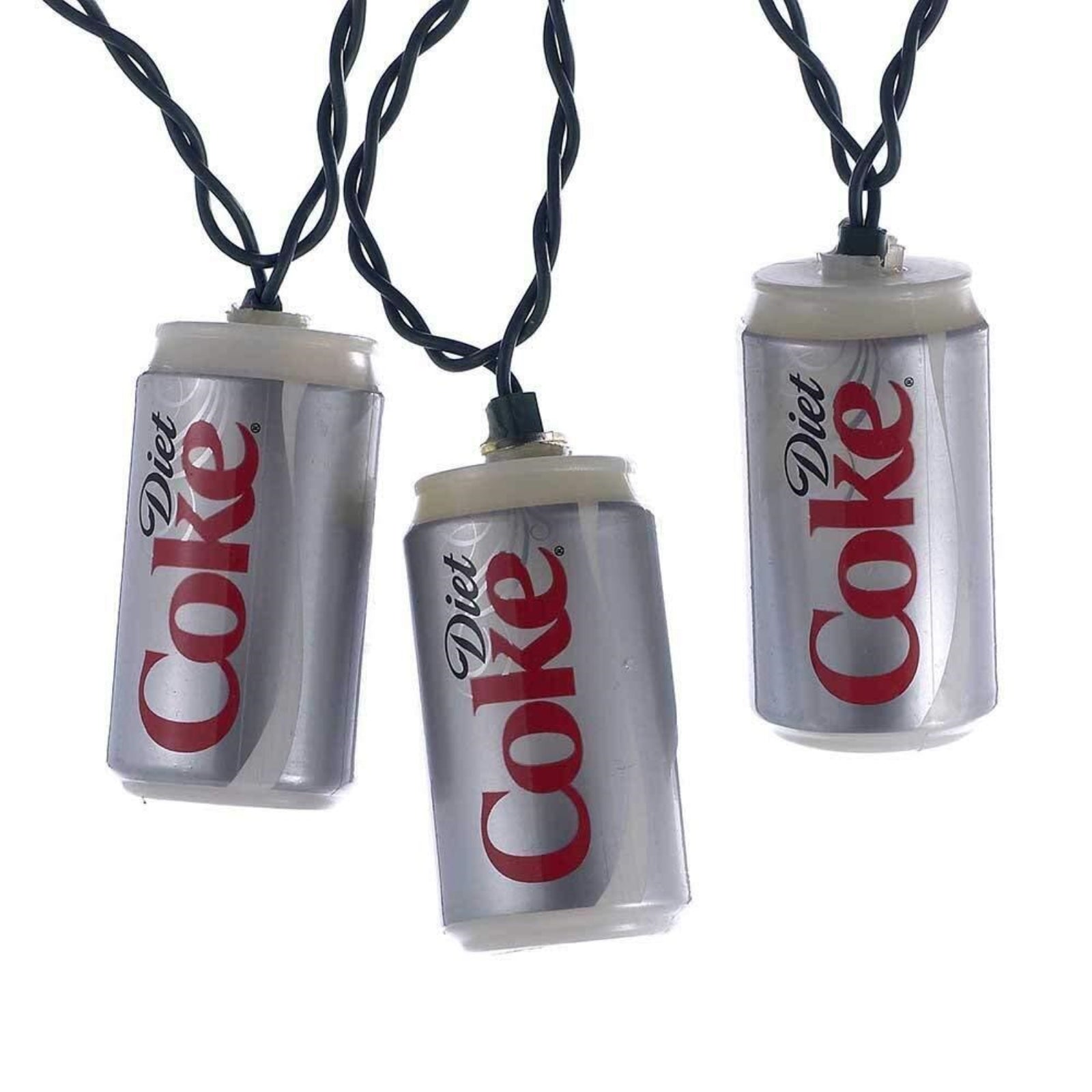 Diet Coke Cans Christmas Lights. Item includes 10 lights with 12 inch (30 cm) spacing. Approximately 30 inch long lead wire (76 cm). Made from plastic. Used 12V 0.08A incadescent bulbs. Comes with 4 spare bulbs and 2 replacement fuses. Indoor use only. Includes original manufacturers box and packaging. Made by Kurt Adler.
