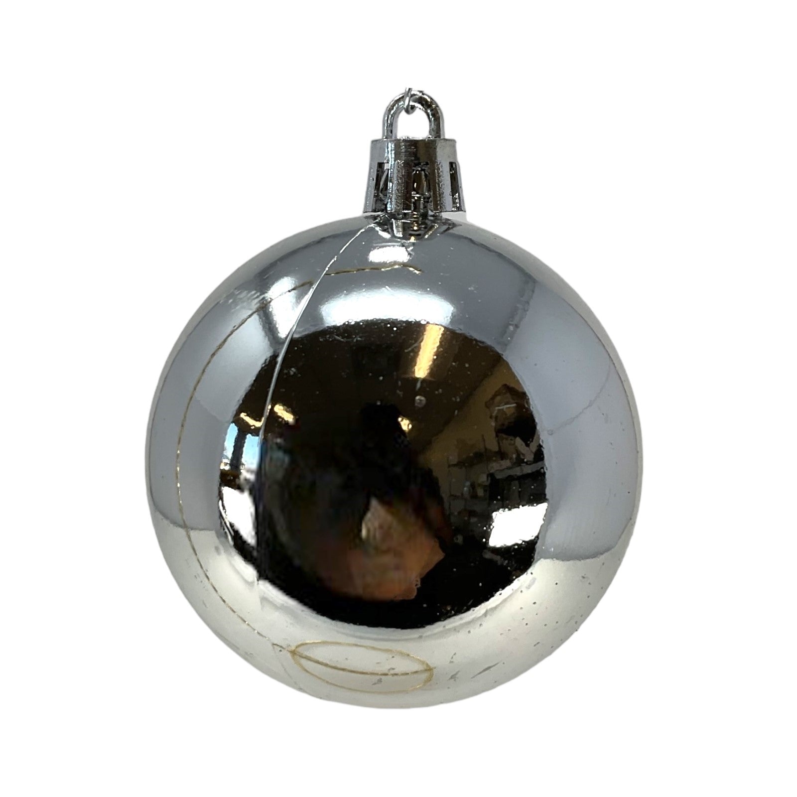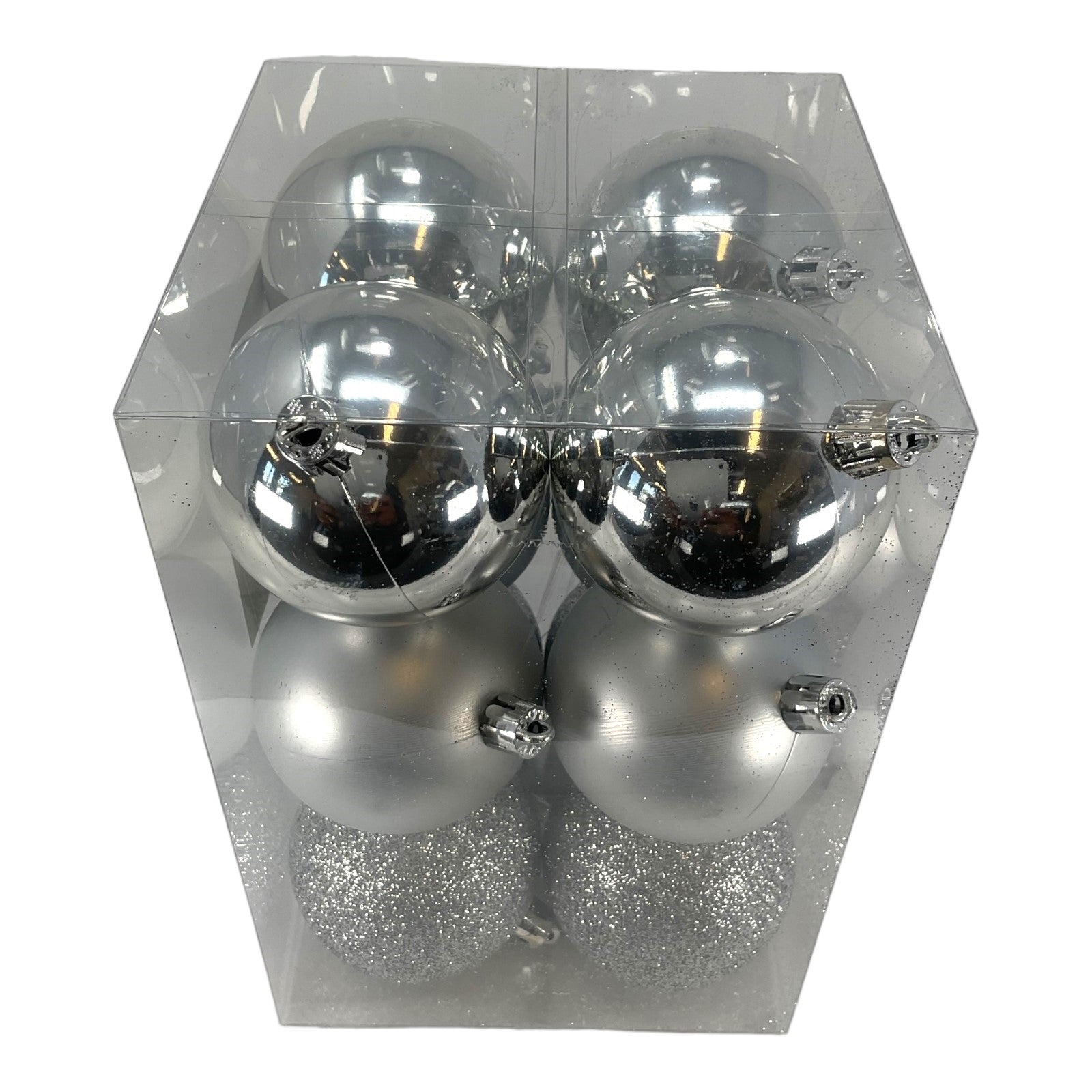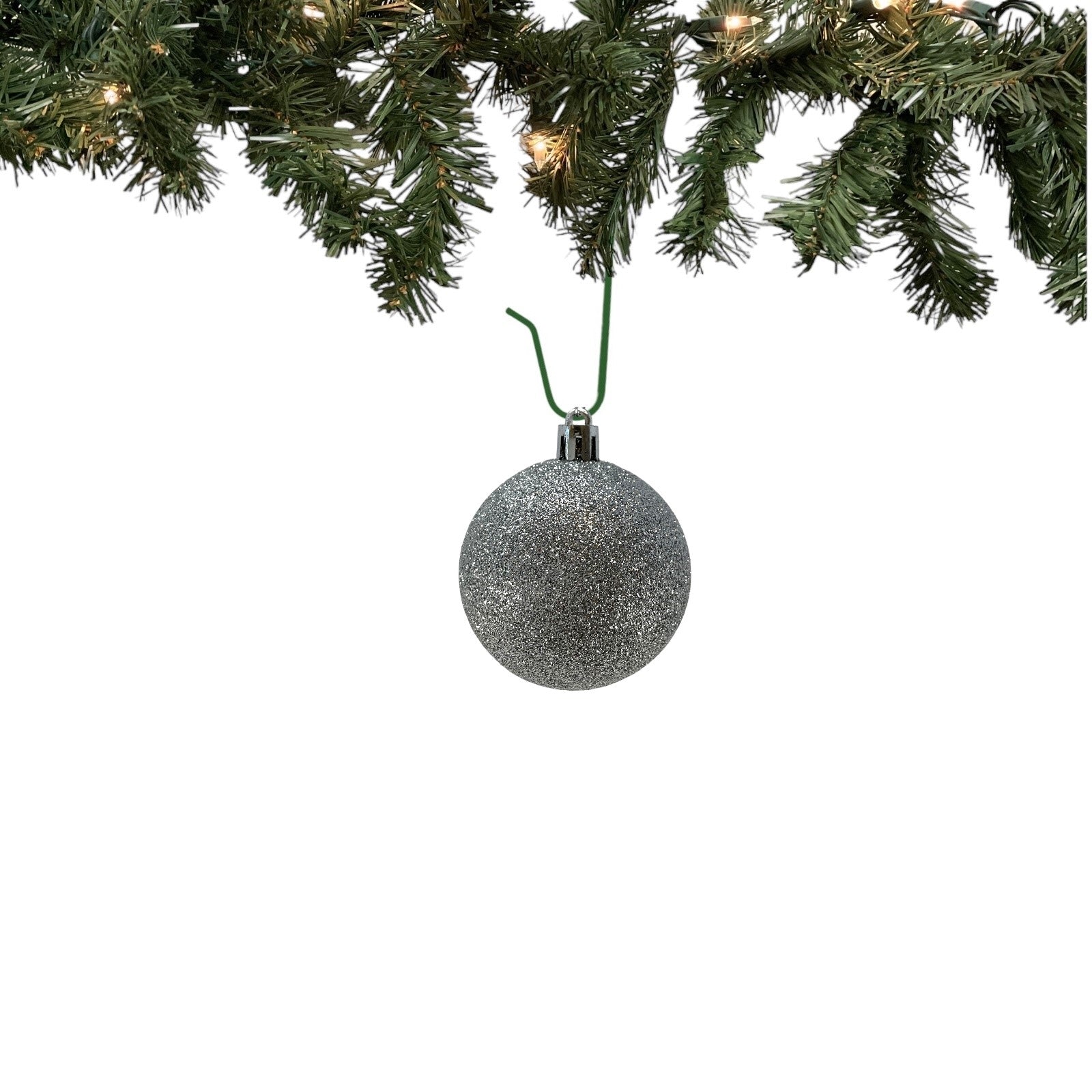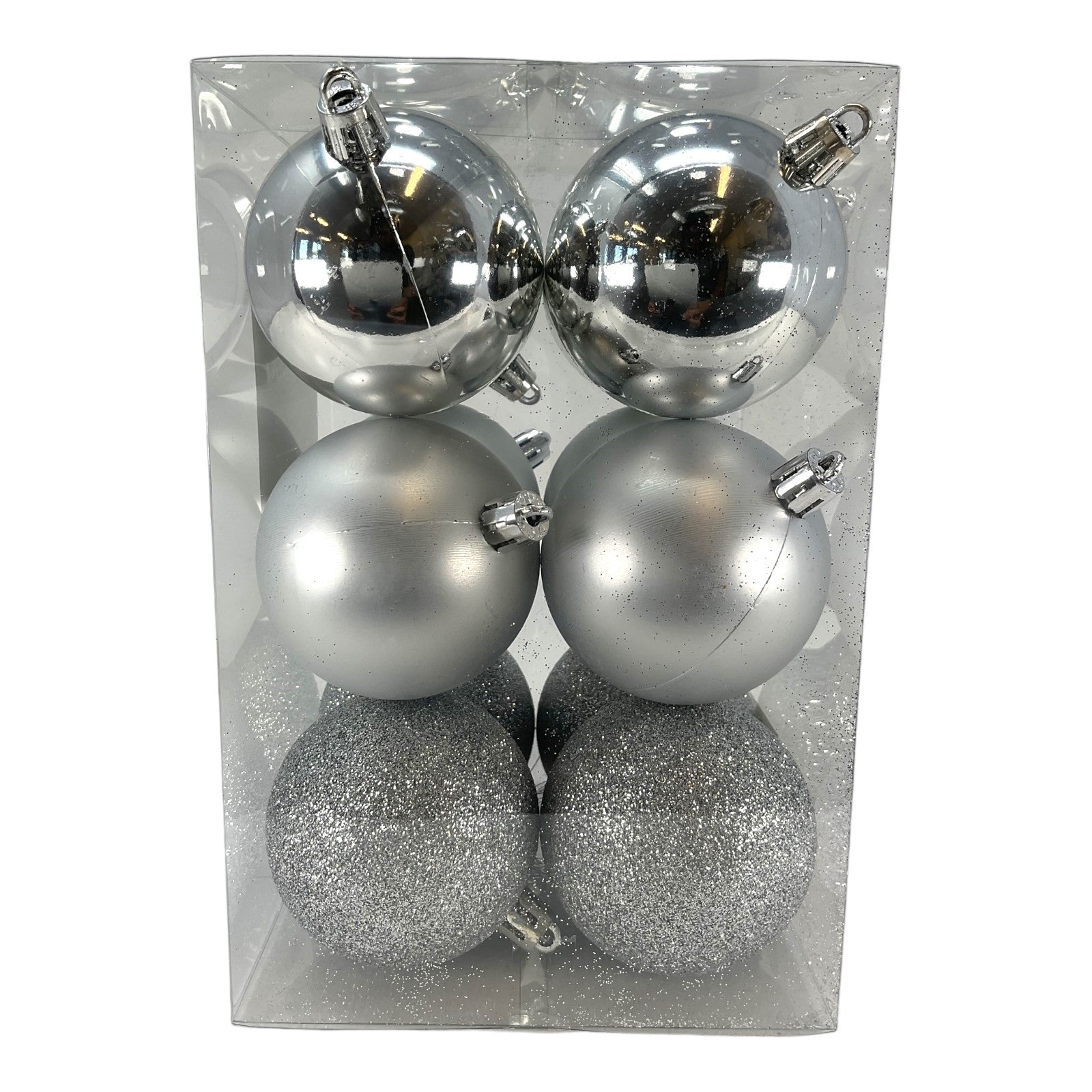 Shiny matte and glitter silver ball ornaments. Set of 12. Made of shatterproof plastic. 2.3 Inch diameter.