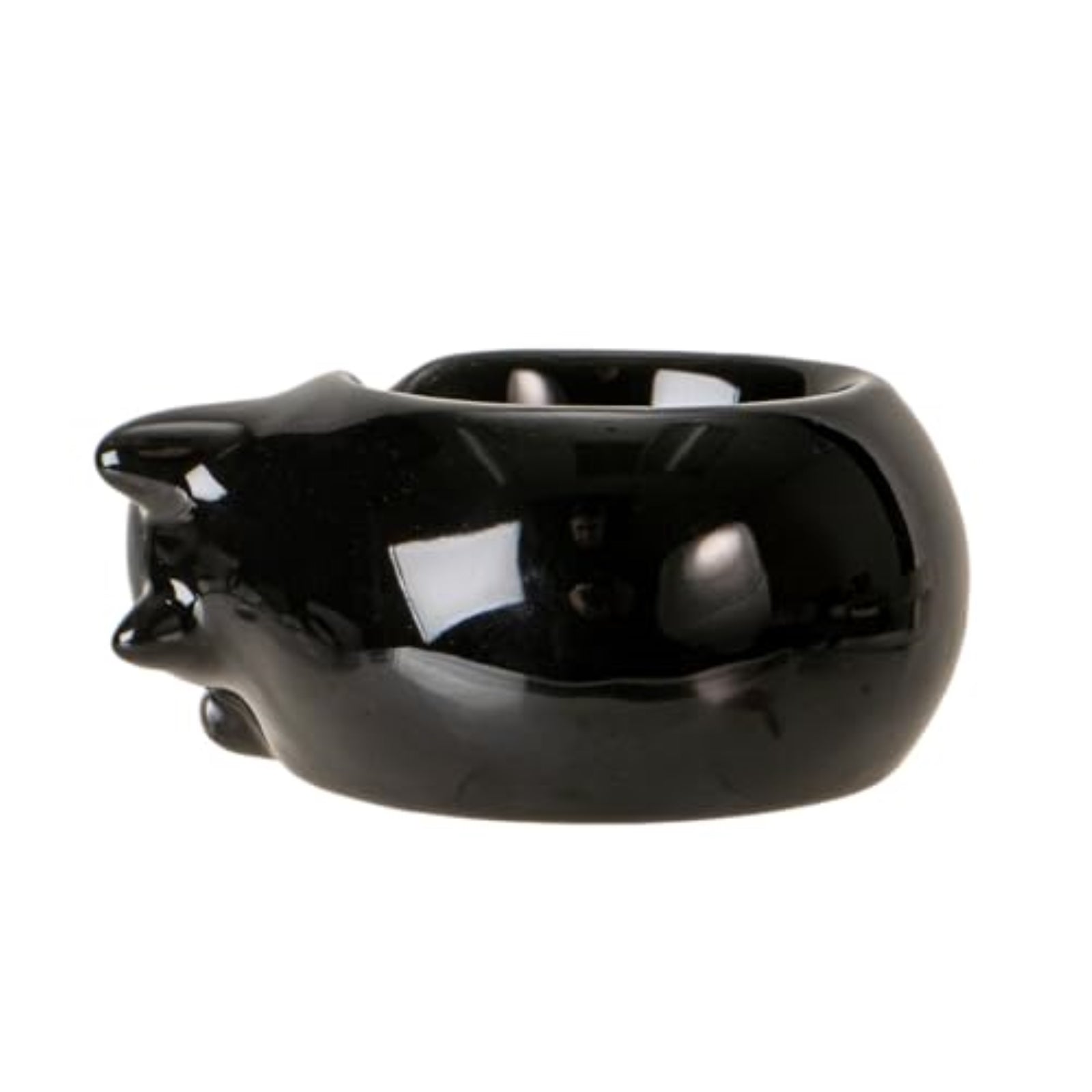 Black cat tealight candle holder. Made from ceramic. Item is approximately 3.54 x 2.75 x 1.61 inches.