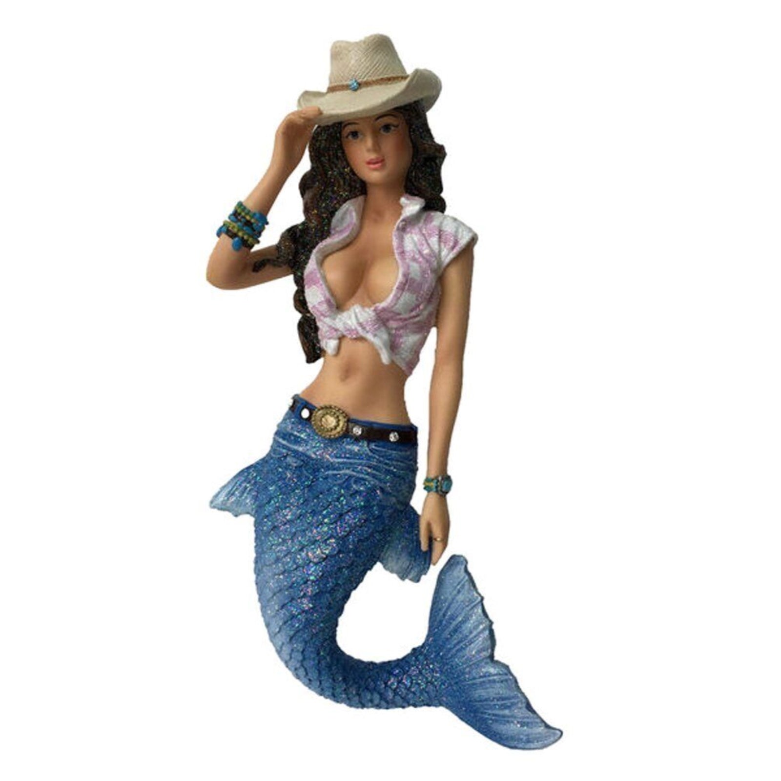 Jessie. Cowgirl Mermaid Ornament. Made from resin. Approximately 7 inches tall(18 cm). Includes original manufacturers box and packaging. Made by December Diamonds.