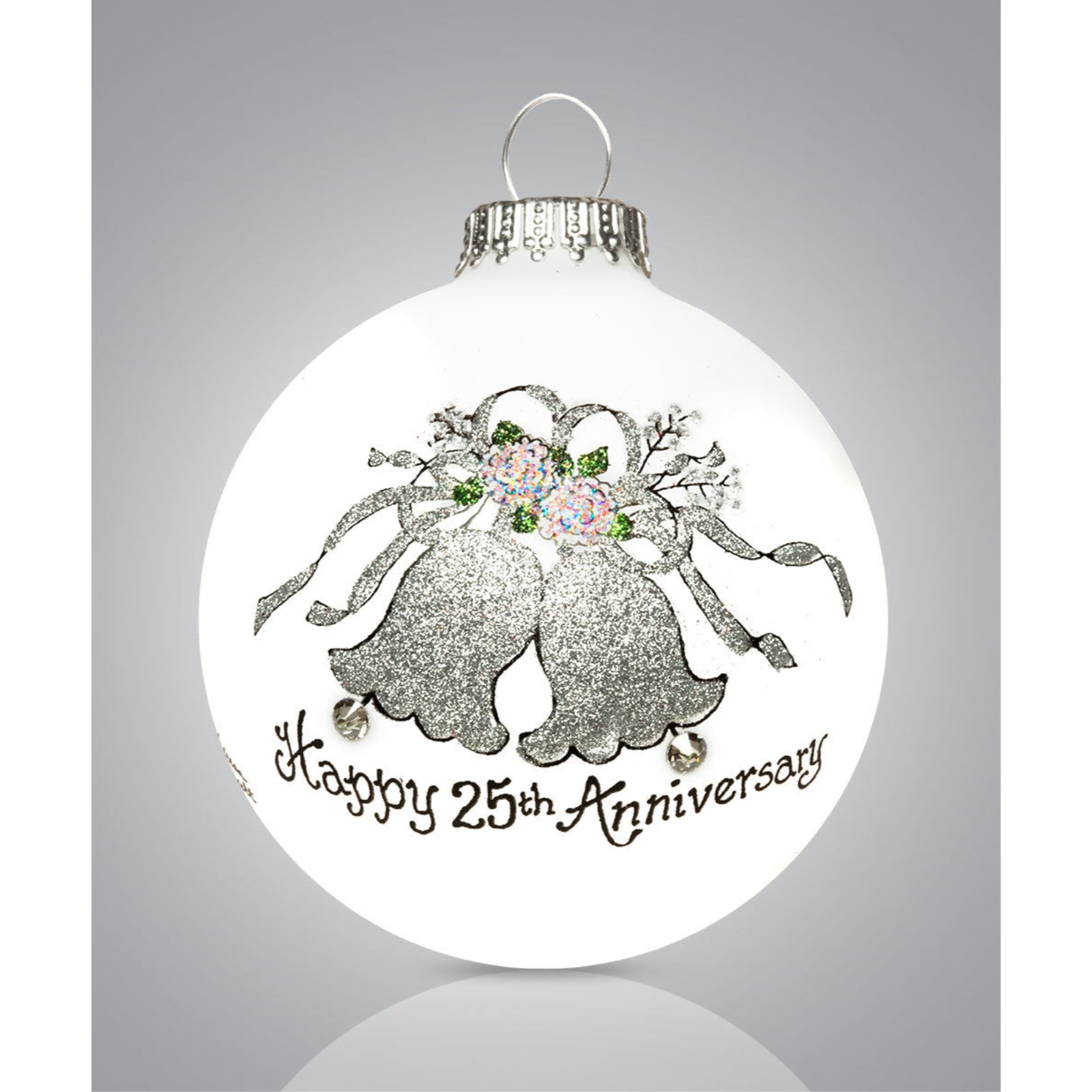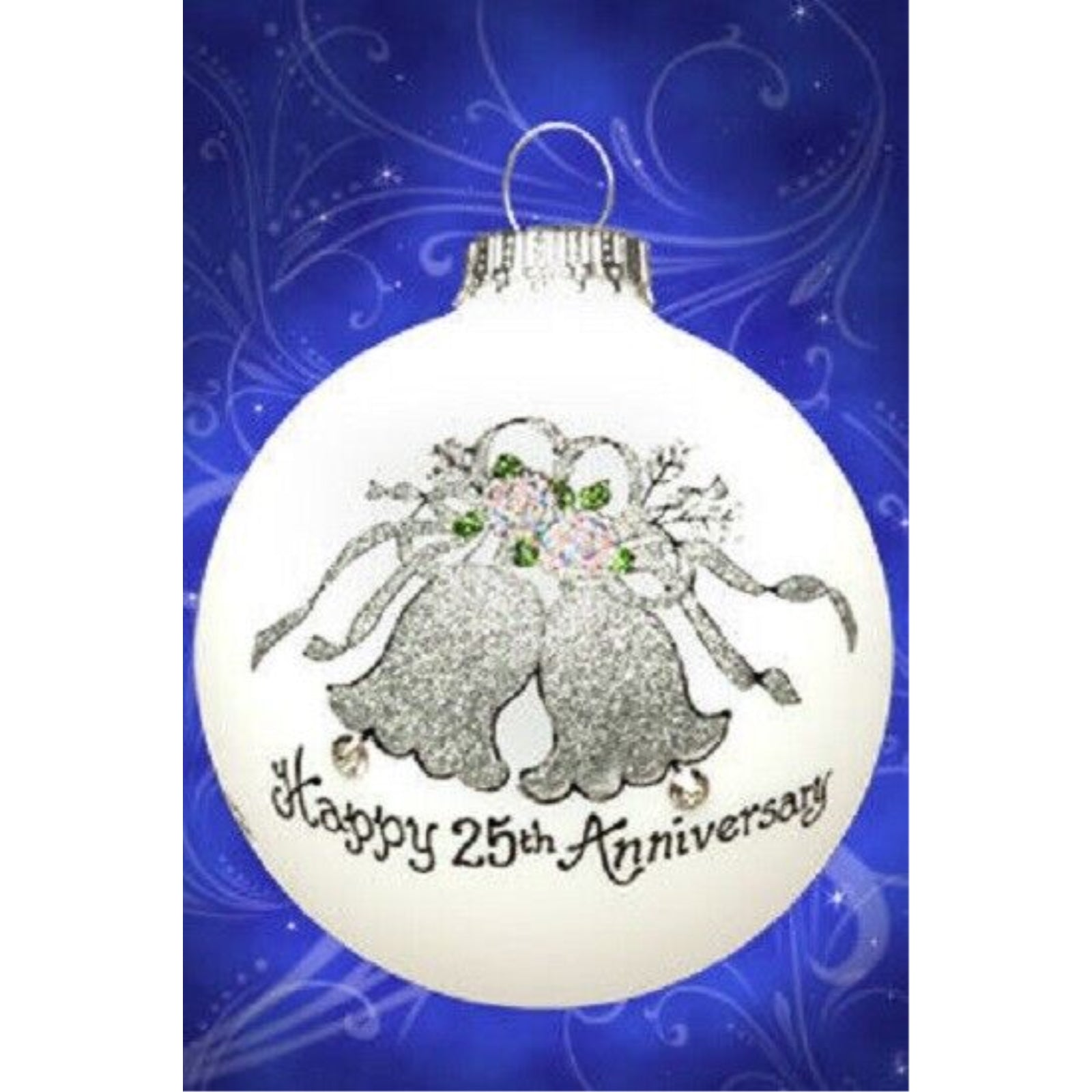 25th Anniversary Bells Christmas Ornament. Handcrafted in the USA by Hearts Gifts. Made from glass. Approximately 3 inches in diameter. Comes packaged in a gift box. Inscribed with Happy 25th Anniversary.