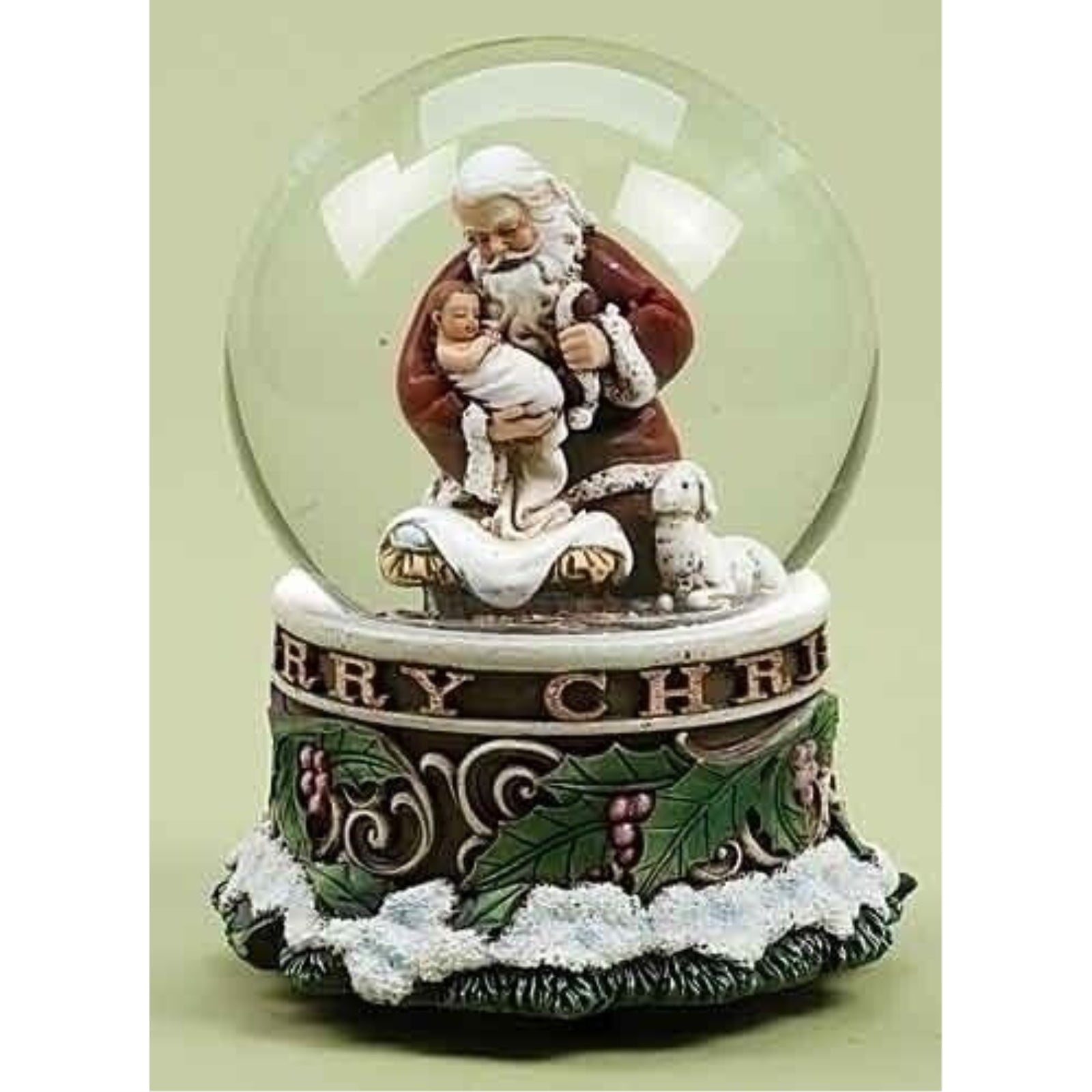 Kneeling Santa with Baby Jesus Glitterdome. Plays the tune: Silent Night. Made from a resin and stone mix and glass. Approximately 5.5 inches tall (14 cm). Includes original manufacturers box and packaging. Made by Joseph Studio