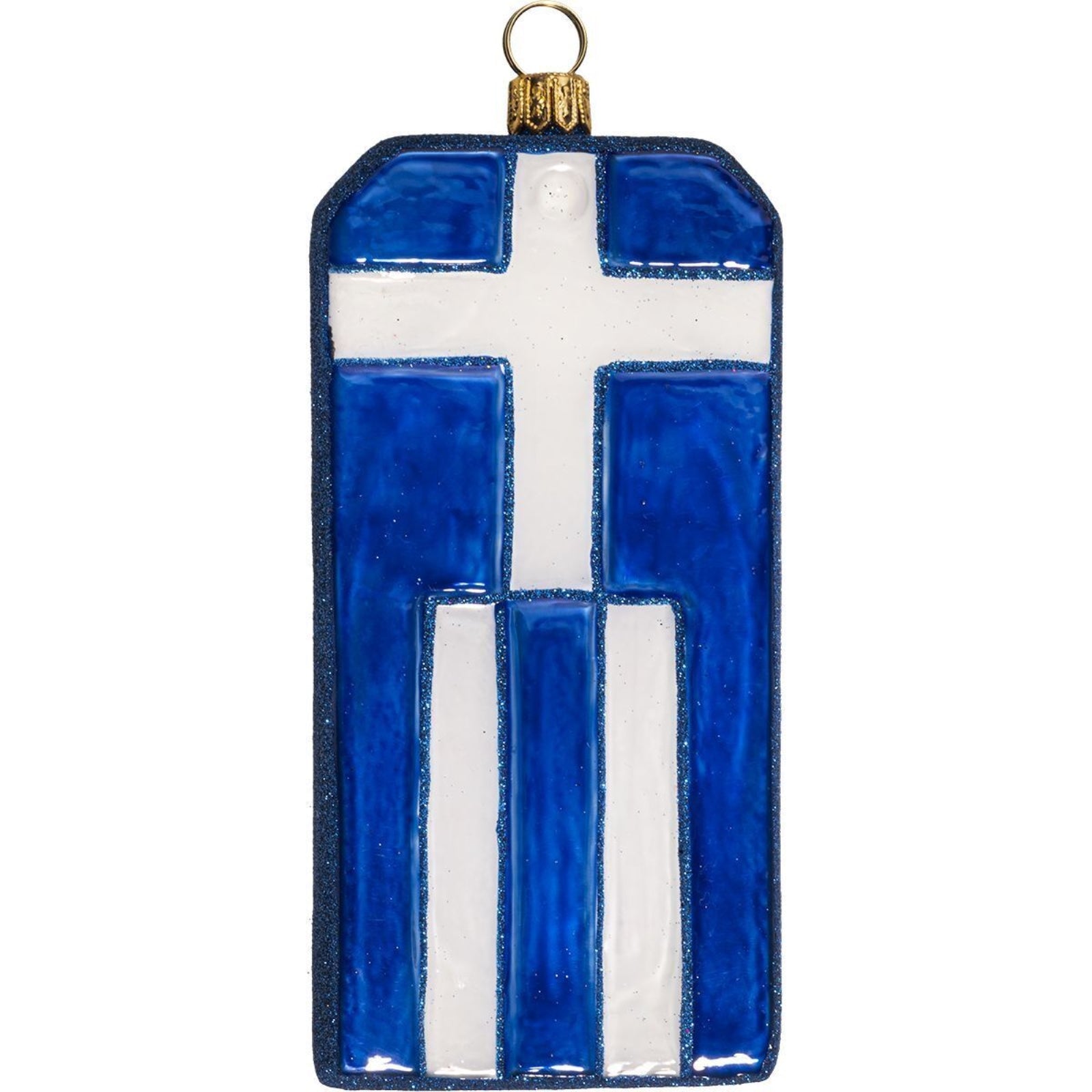 Athens Greece Luggage Tag Ornament. Each ornament is hand painted by Polish artisans in mouth-blown glass. Made from glass. Approximately 4.5 by 2.1 by .9 inches.
