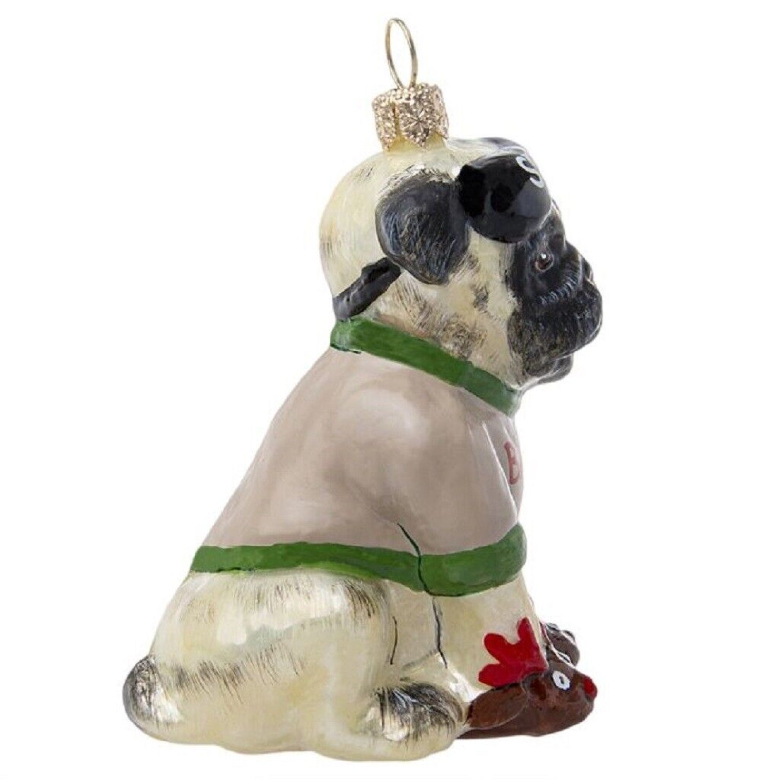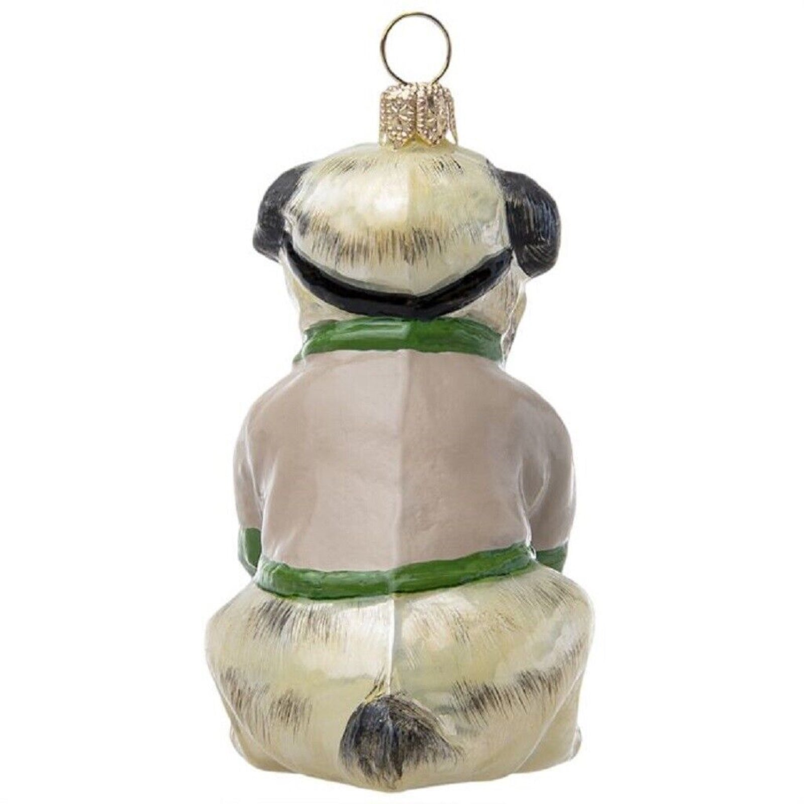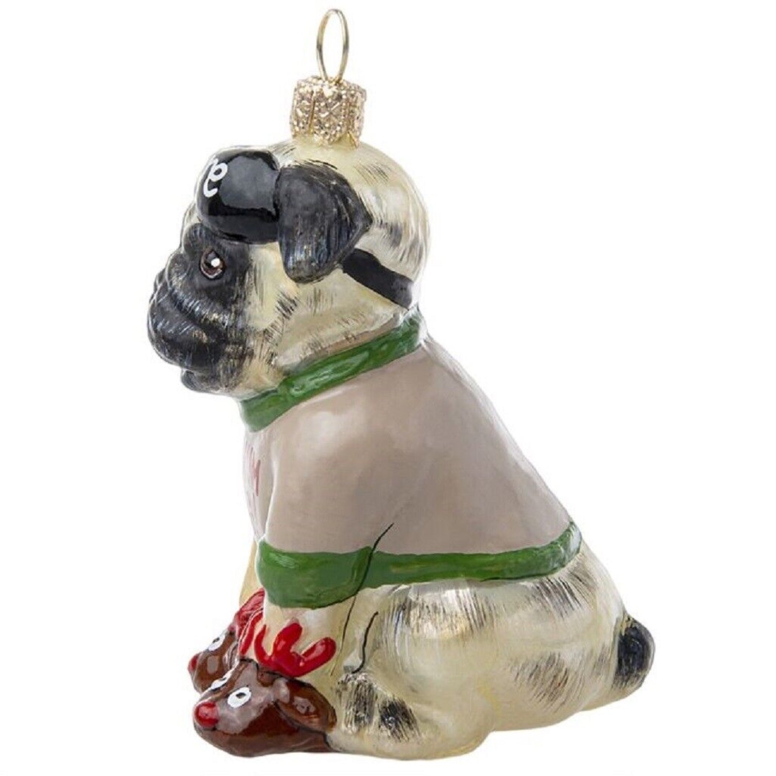 Bah Hum Pug Fawn Ornament. Handcrafted by the finest European artists. Made from mouth blown glass. Hand painted. Made in Poland.