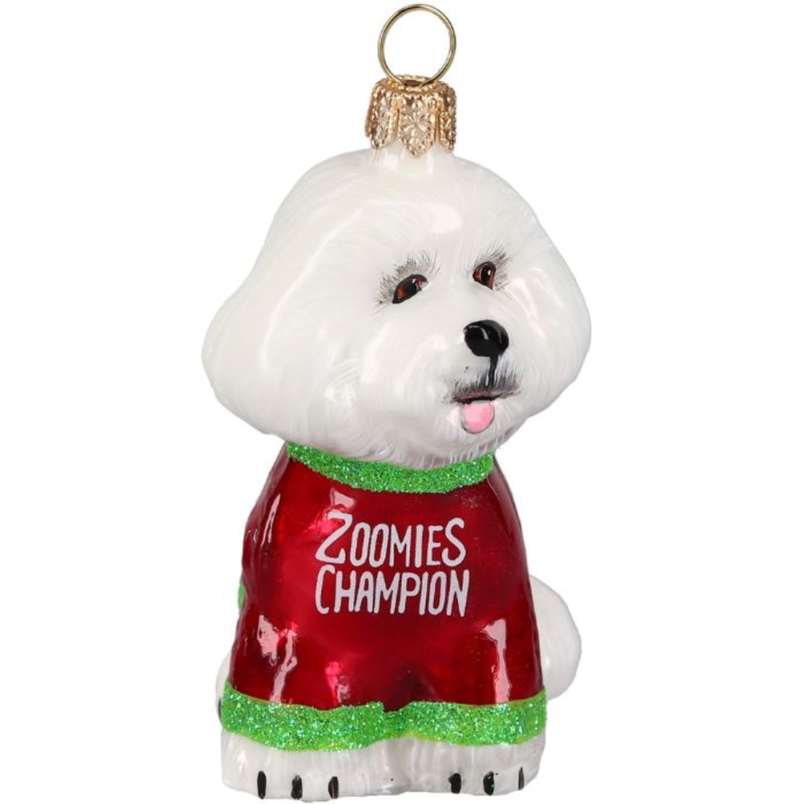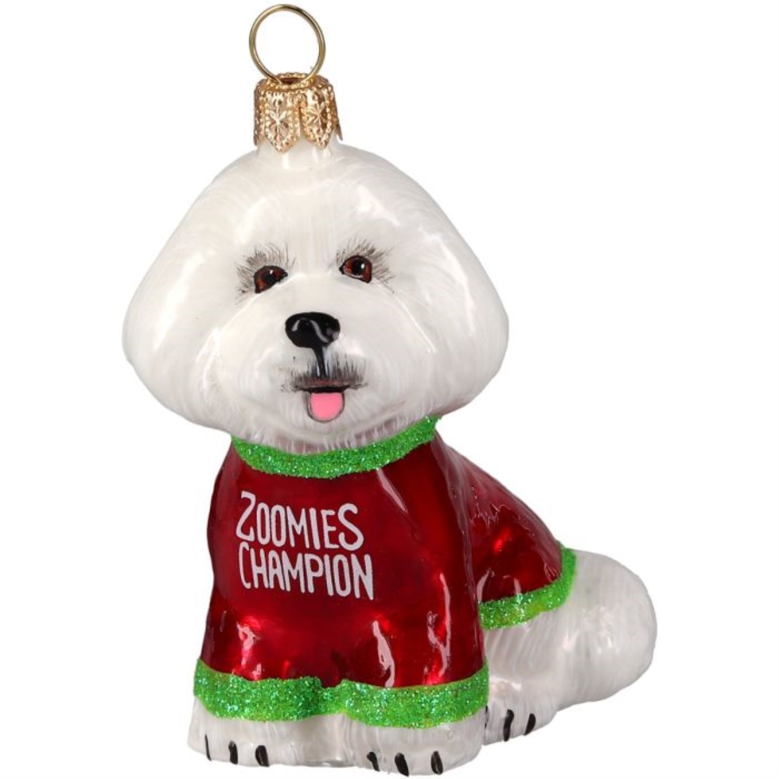Bichon Frise Dog Ornament. Made of Polish Glass. Shirt reads “Zoomies Champion”.
