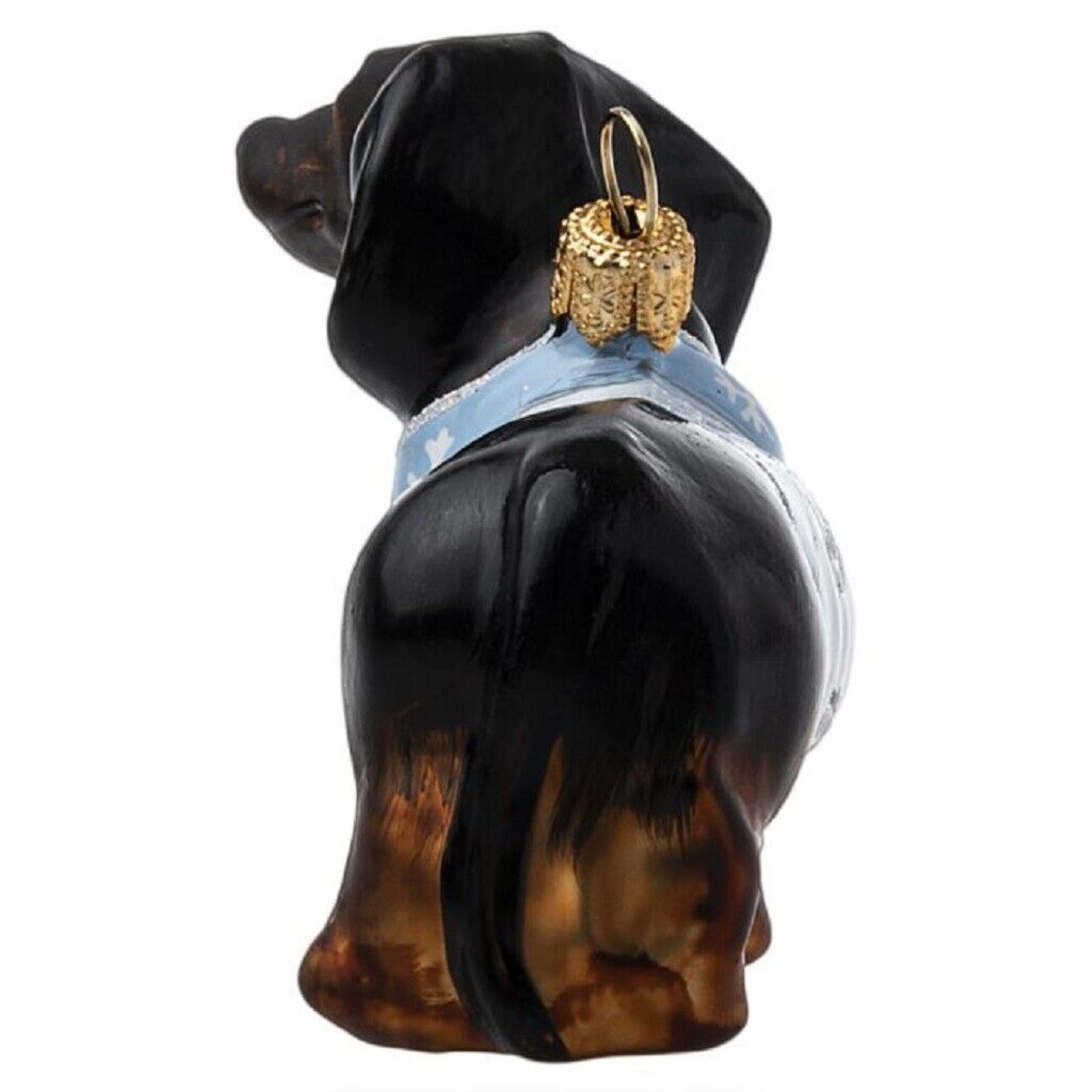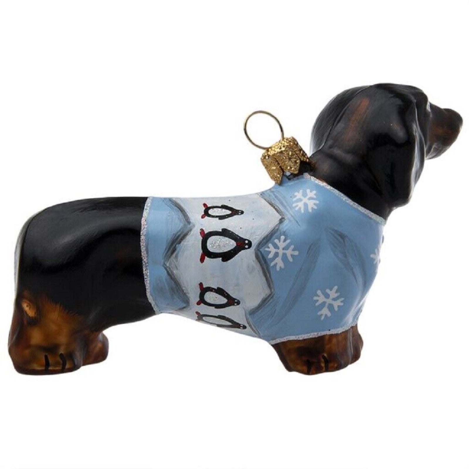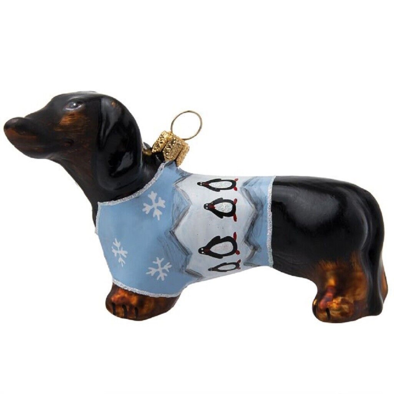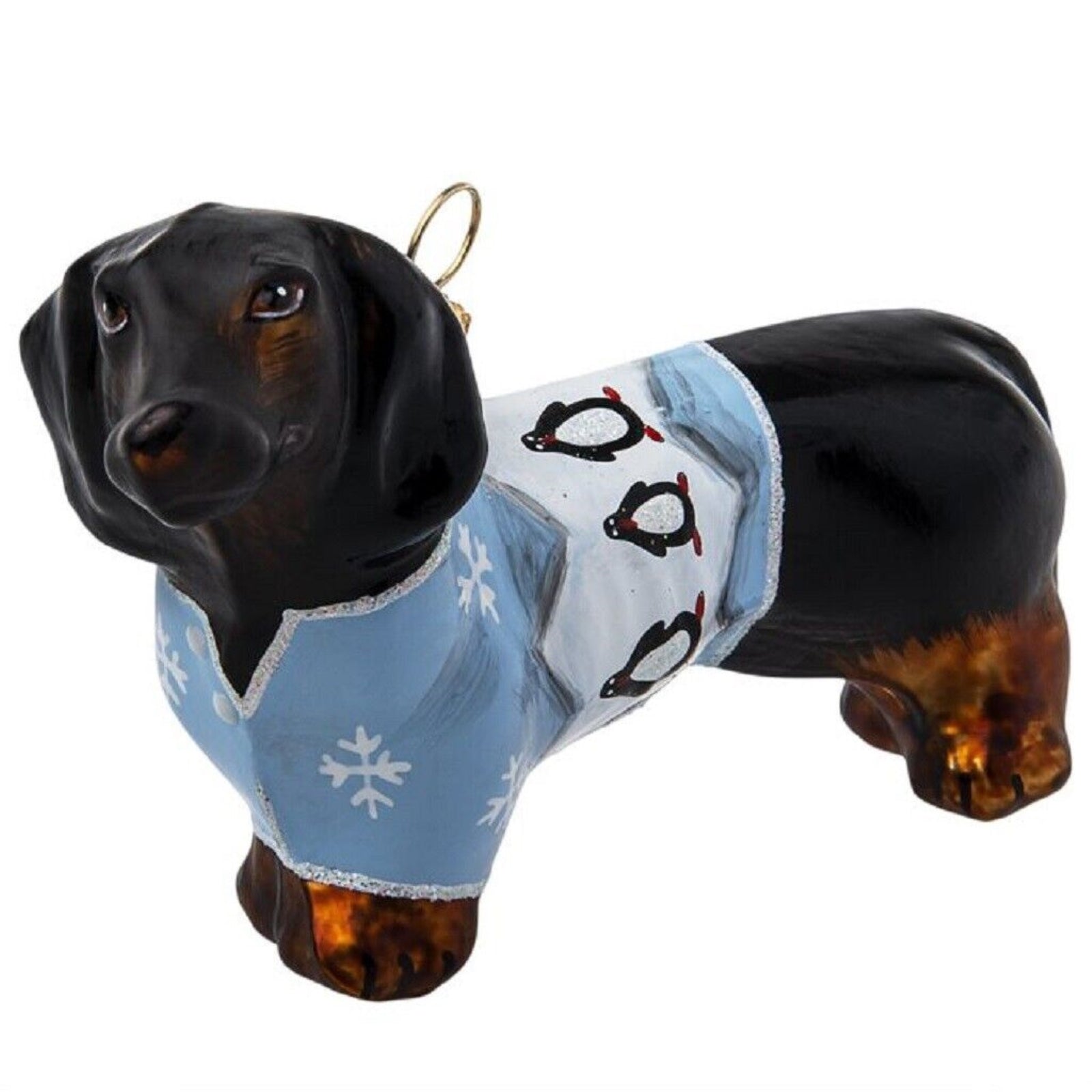 Dachshund in Penguin Christmas Pajamas Ornament. Handcrafted by the finest European artists. Made from mouth blown glass. Hand painted. Made in Poland.