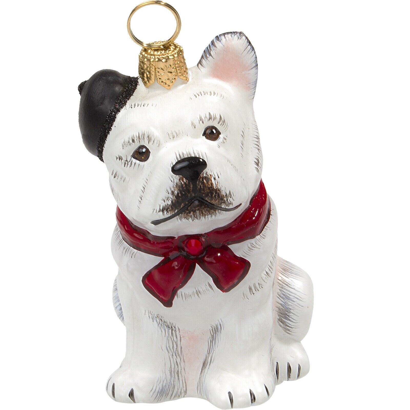 Joy to the World French Bulldog with Beret Polish Glass Christmas Dog Ornament