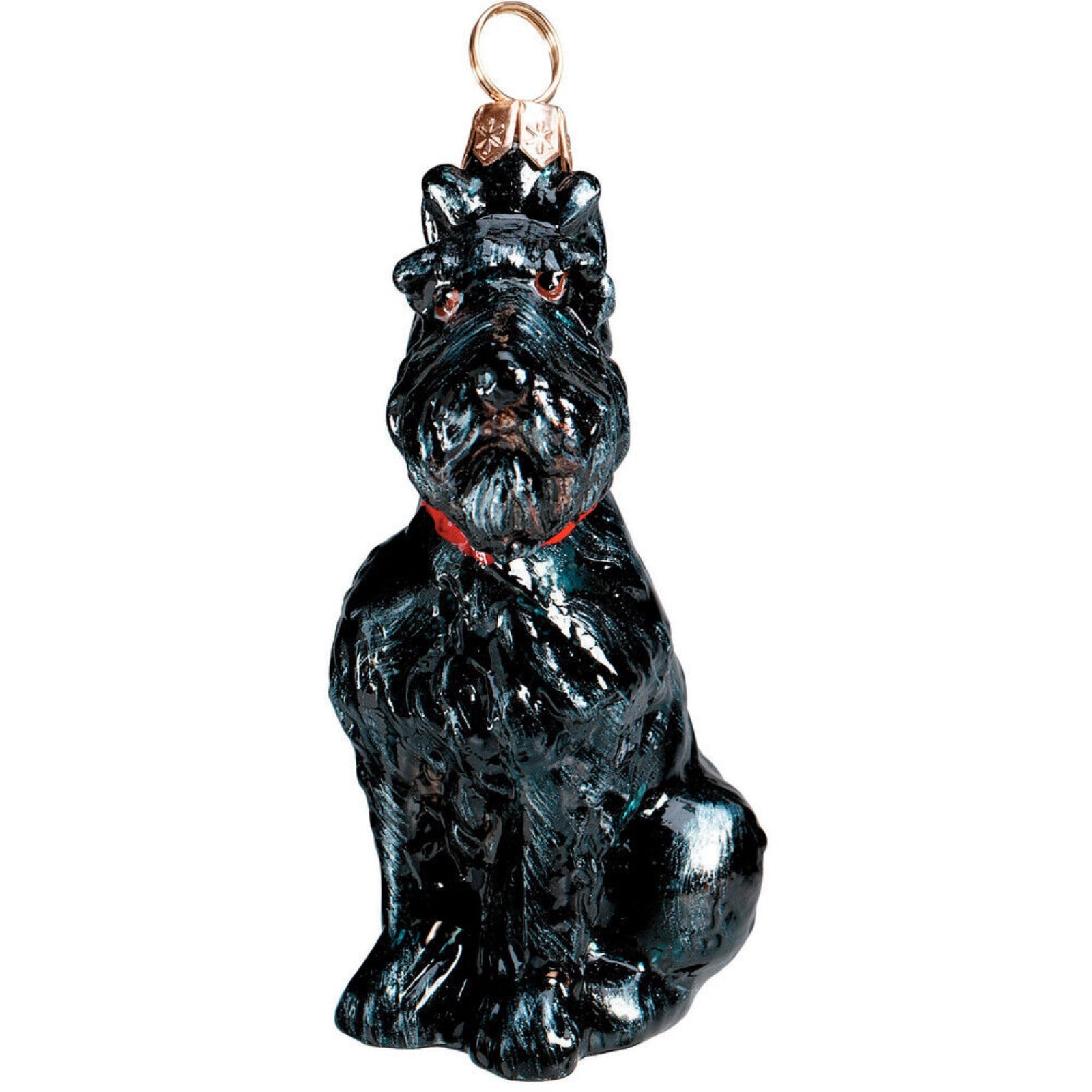 German Schnauzer Black Sitting Dog Christmas Ornament. Each ornament is hand painted with intricate breed details by Polish artisans in mouth-blown glass. Part of the Pet Set Collection Working Group. Approximately 3 inches tall (8 cm). Manufacturers Packaging: Gift Box. Made by Joy To the World.