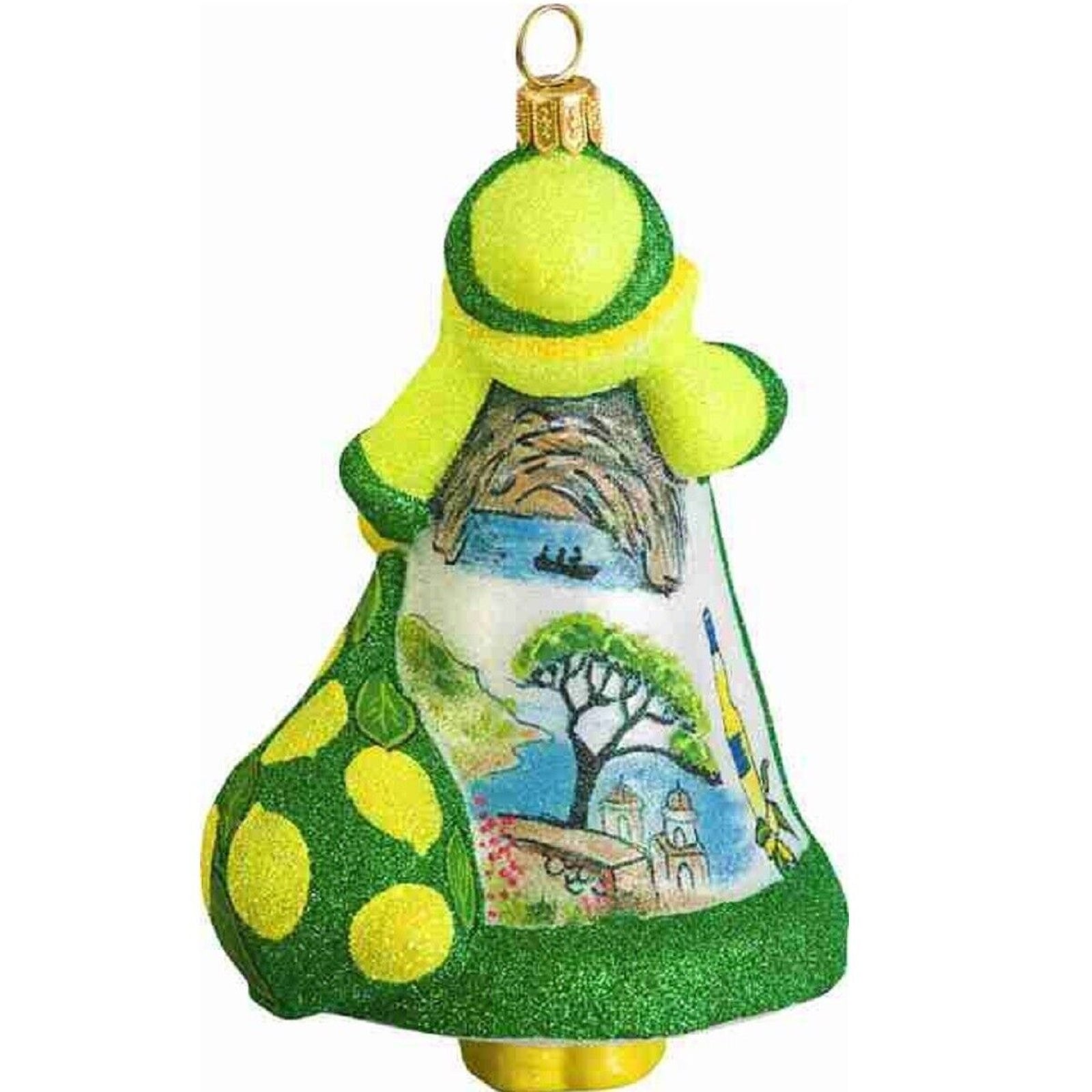 Amalfi Coast Italy Santa Ornament. Each ornament is hand painted by Polish artisans. Made from mouth blown glass. Approximately 5 inches tall (13 cm). Includes original manufacturers box and packaging. Made by Joy to the World.