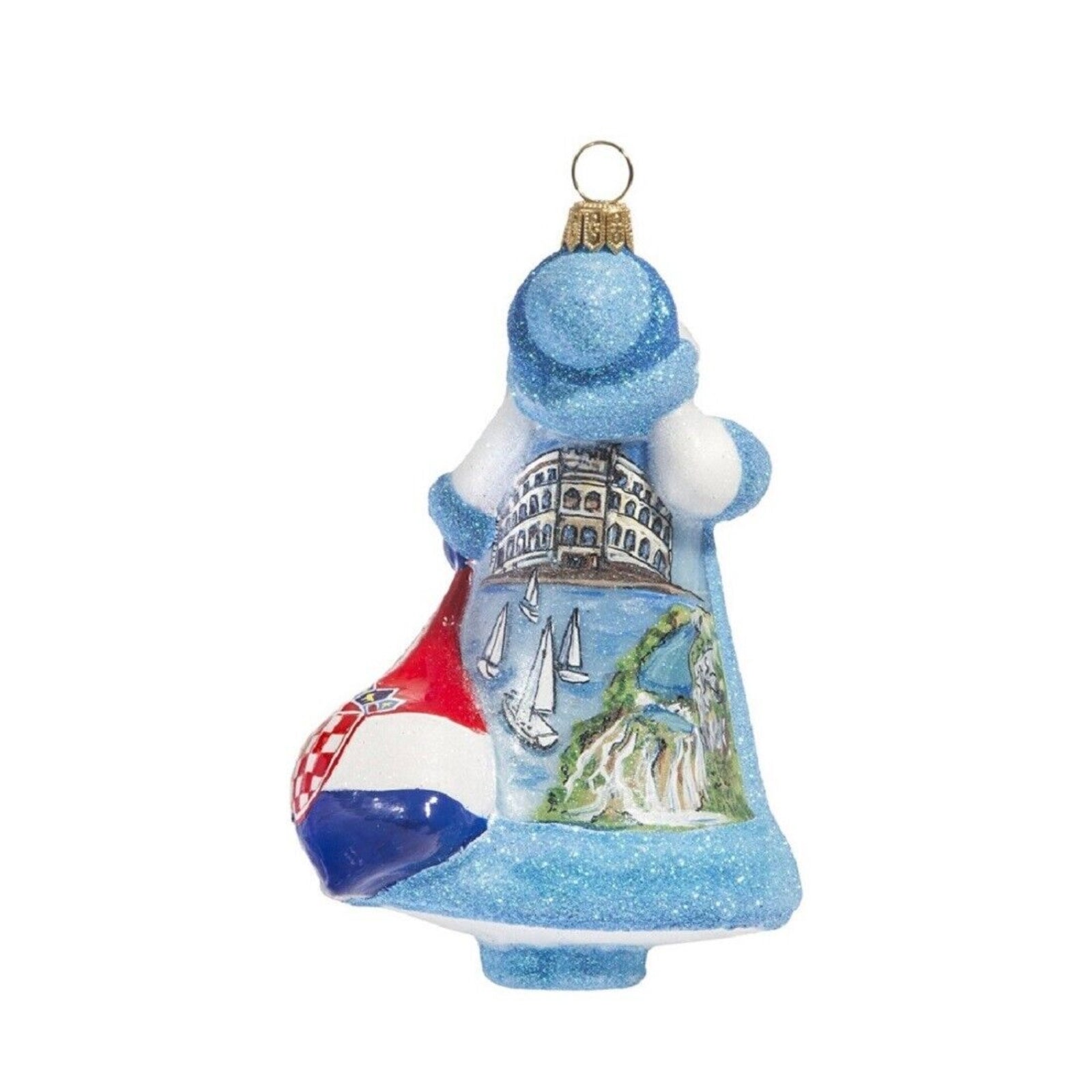 Glitterazzi Croatia Santa Ornament. Each ornament is hand painted by Polish artisans. Made from mouth blown glass. Approximately 5 inches tall (13 cm). Includes original manufacturers box and packaging. Made by Joy To The World.