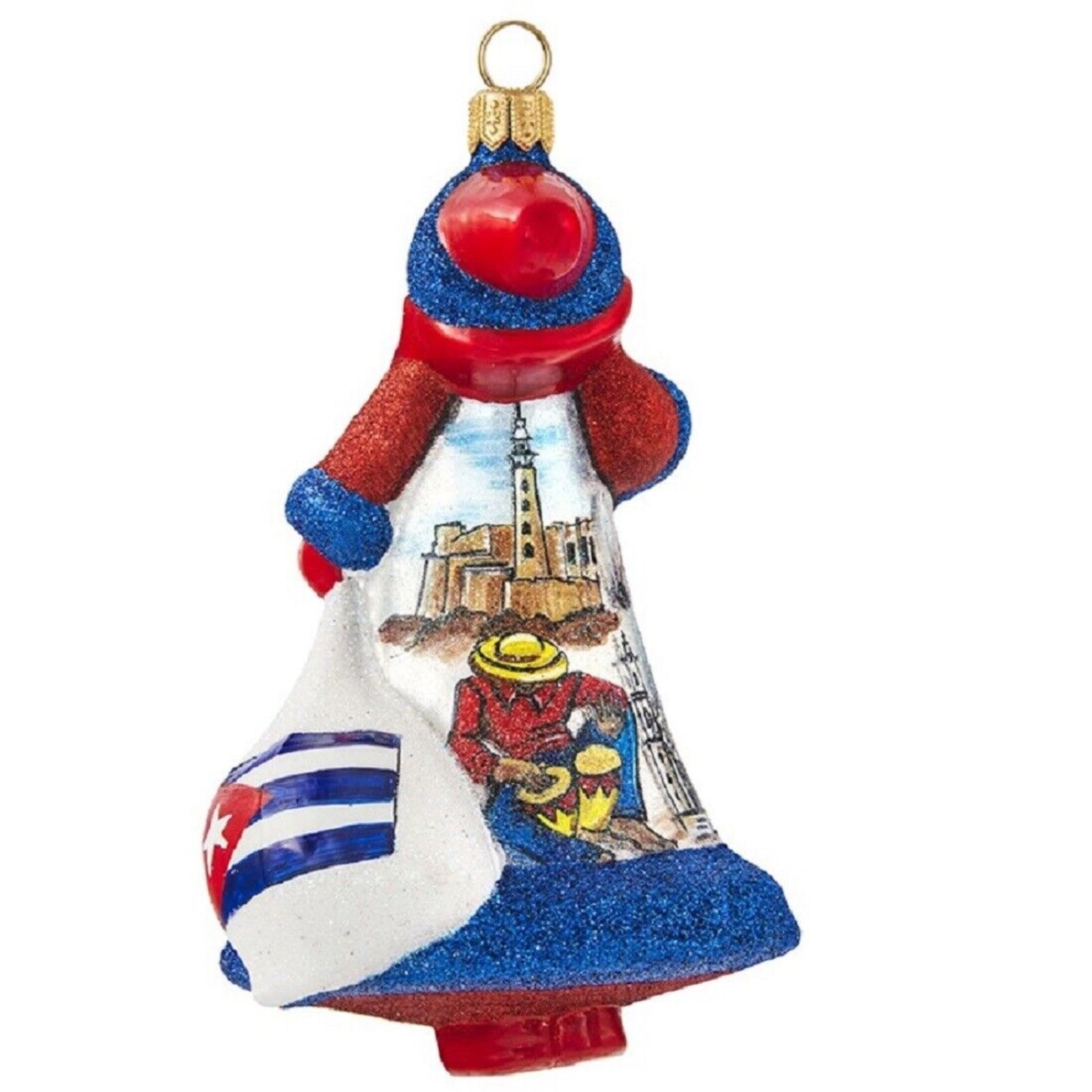 Cuba Santa Ornament. Each ornament is hand painted by Polish artisans. Made from mouth blown glass. Approximately 5 inches tall (13 cm). Includes original manufacturers box and packaging. Made by Joy to the World.