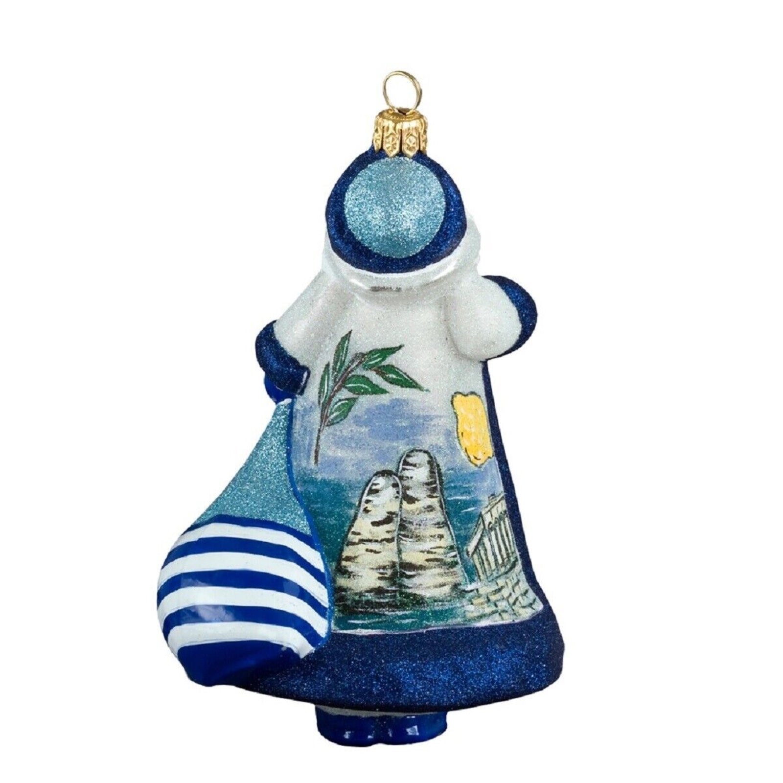Grecian Santa Christmas Ornament. Part of the Glitterazzi collection. Each ornament is hand painted with intricate breed details by Polish artisans. Made from mouth blown glass. Approximately 5 inches tall (13 cm). Includes original manufacturers box and packaging. Made by Joy to the World. This lovely Santa ornament features Grecian landscapes and architecture on Santa's robe. The ornament is decorated with glitter paint to give it a sparkle.