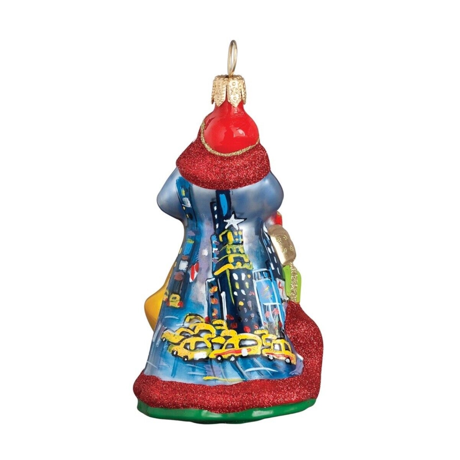 New York Santa Christmas Ornament. Part of the Glitterazzi Mini collection. Each ornament is hand painted with intricate breed details by Polish artisans. Made from mouth blown glass. Approximately 3.5 inches tall (9 cm). Includes original manufacturers box and packaging. Made by Joy to the World. This miniature version of the Glitterazzi Santa has a an apple painted on the front and a scene of New York painted on the back. The ornament is decorated with glitter paint to give it a sparkle.