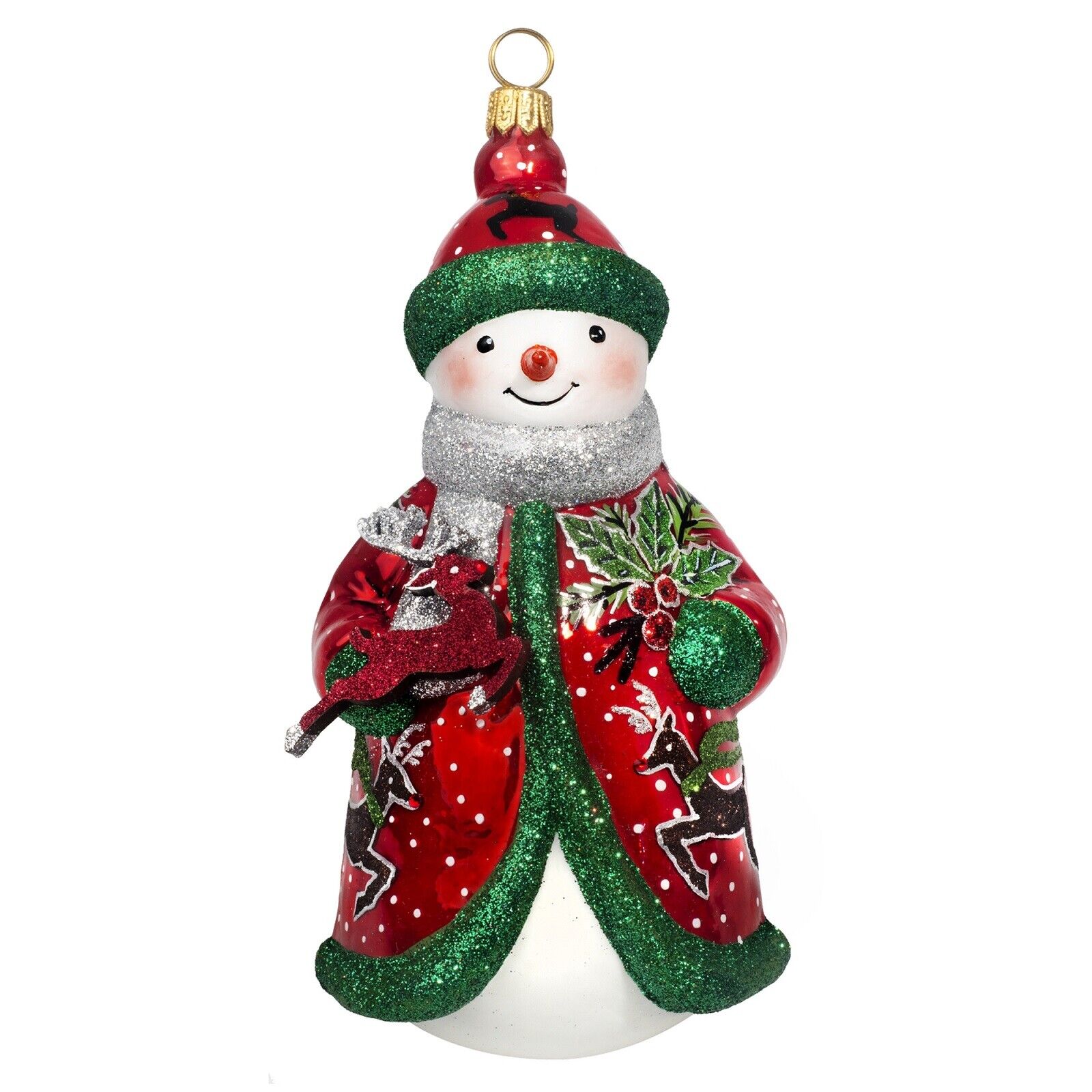 Joy to the World Glitterazzi Red Green and Silver Reindeer Snowman Polish Glass Ornament