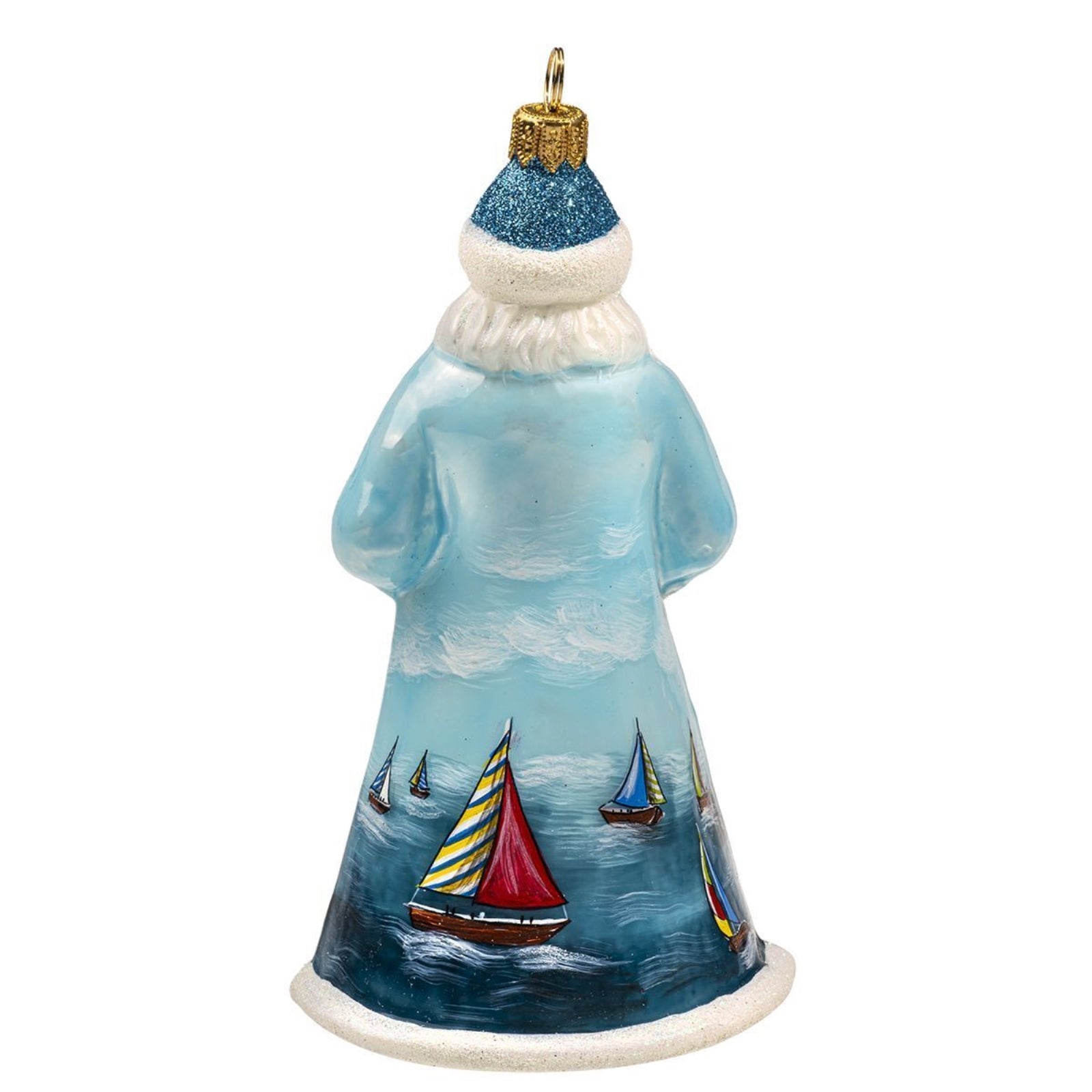 Glitterazzi Sailing Santa Ornament. Each ornament is hand painted with intricate breed details by Polish artisans in mouth-blown glass. Made from glass. Approximately 6 inches tall (15cm).