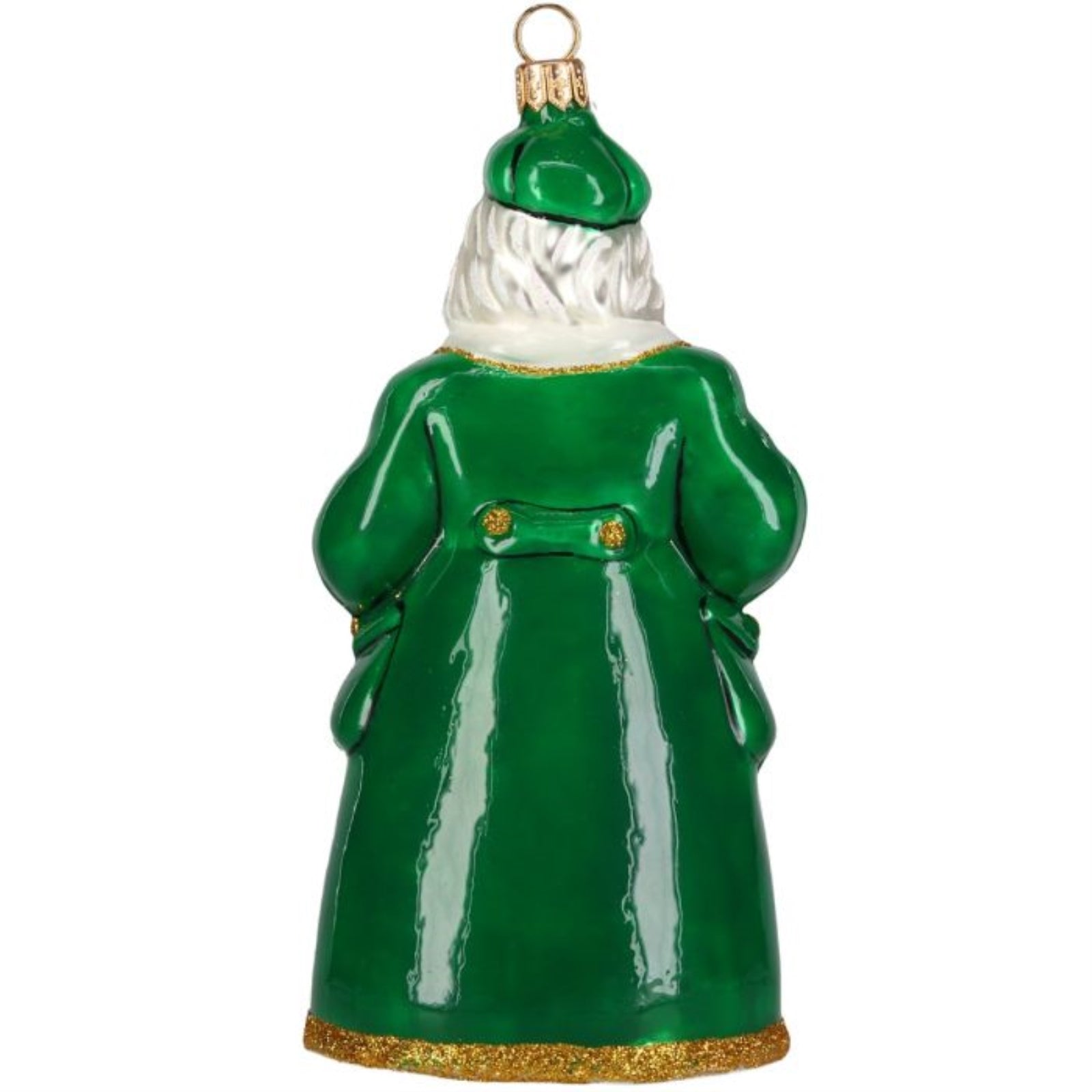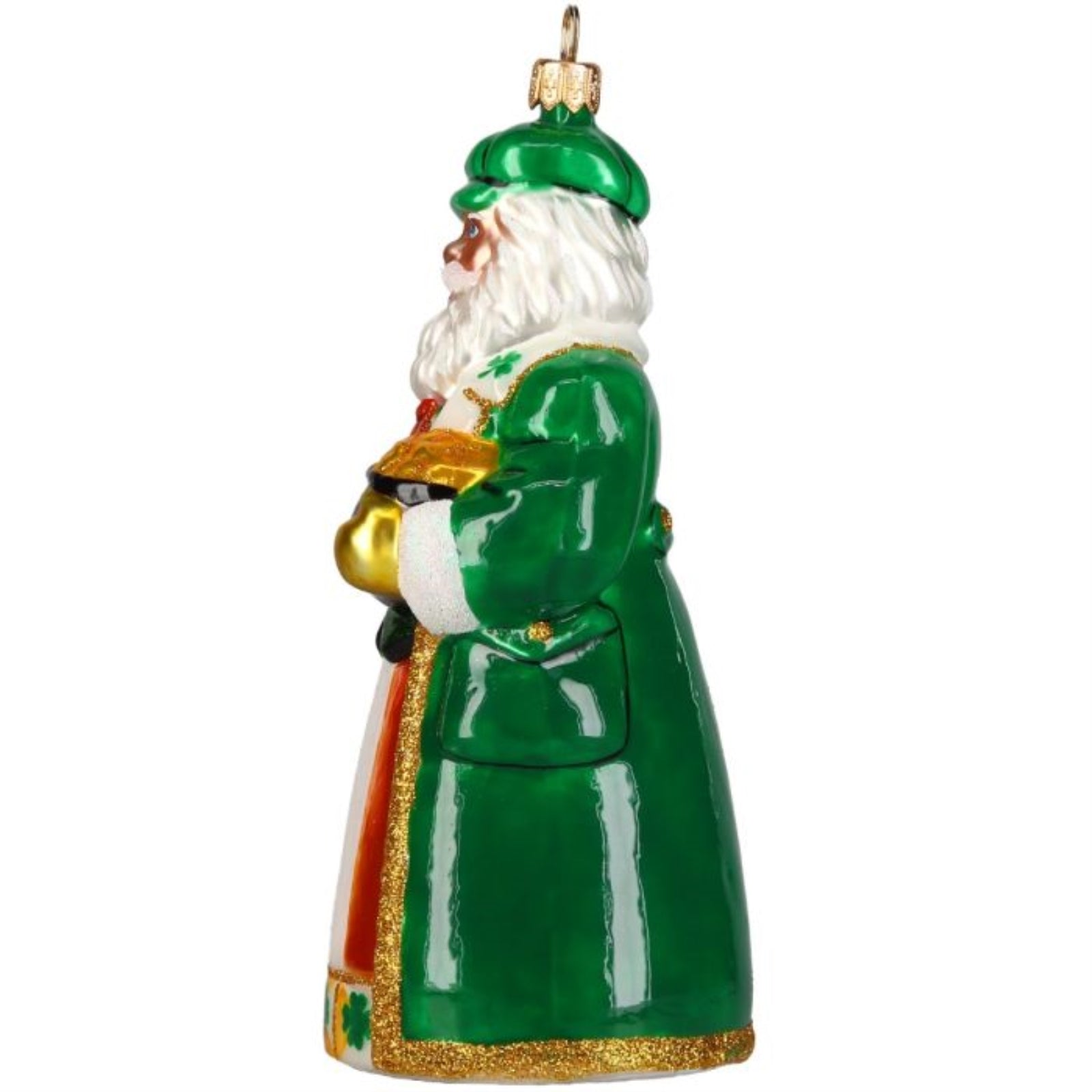 Ireland Santa with Pot of Gold Ornament. Made of Polish Glass. Approximately 6.4 inches tall.