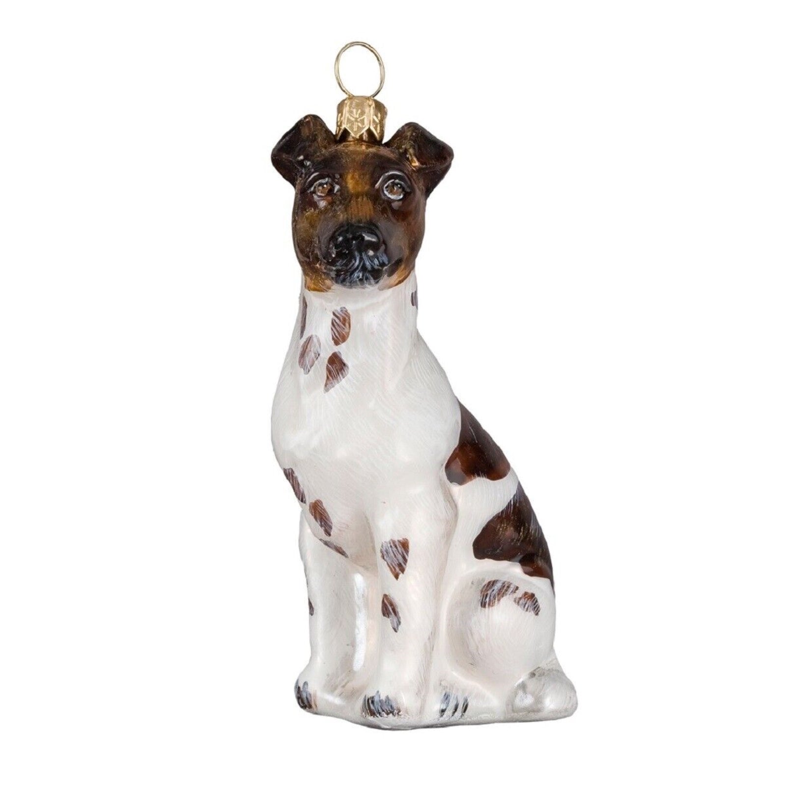 Smooth Fox Terrier Dog Christmas Ornament. Each ornament is hand painted with intricate breed details by Polish artisans. Made from mouth blown glass. Approximately 3 inches tall (8 cm). Includes original manufacturers box and packaging. Made by Joy to the World.