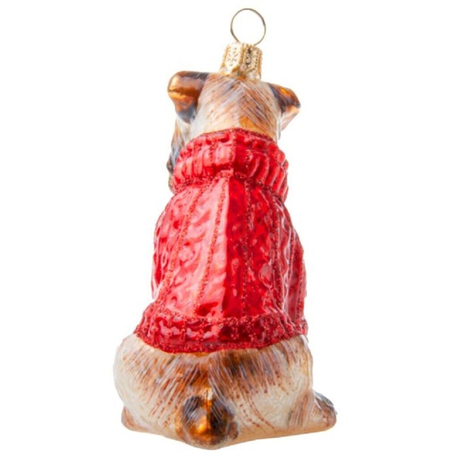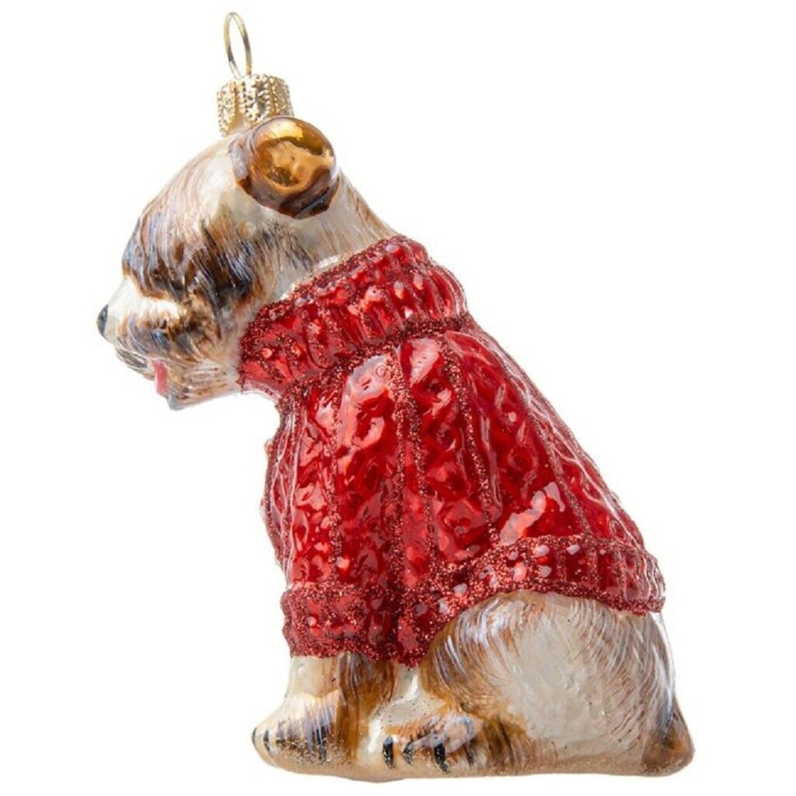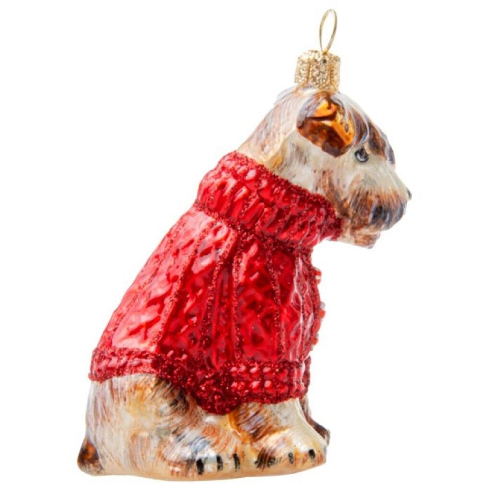 Soft Coated Wheaten in Christmas Sweater Ornament. Handcrafted by the finest European artists. Made from mouth blown glass. Hand painted. Made in Poland.