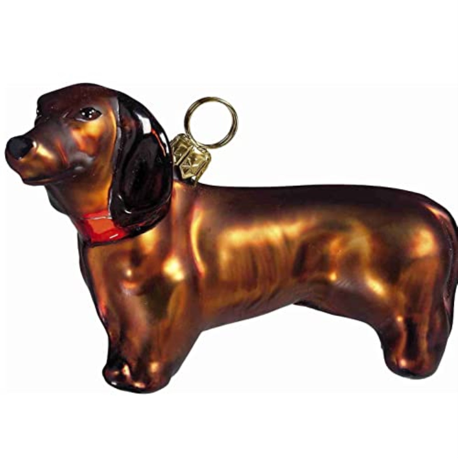 Red Dachshund Ornament. Each ornament is hand painted with intricate breed details by Polish artisans. Made from mouth blown glass. Includes original manufacturers box and packaging. Made by Joy to the World.