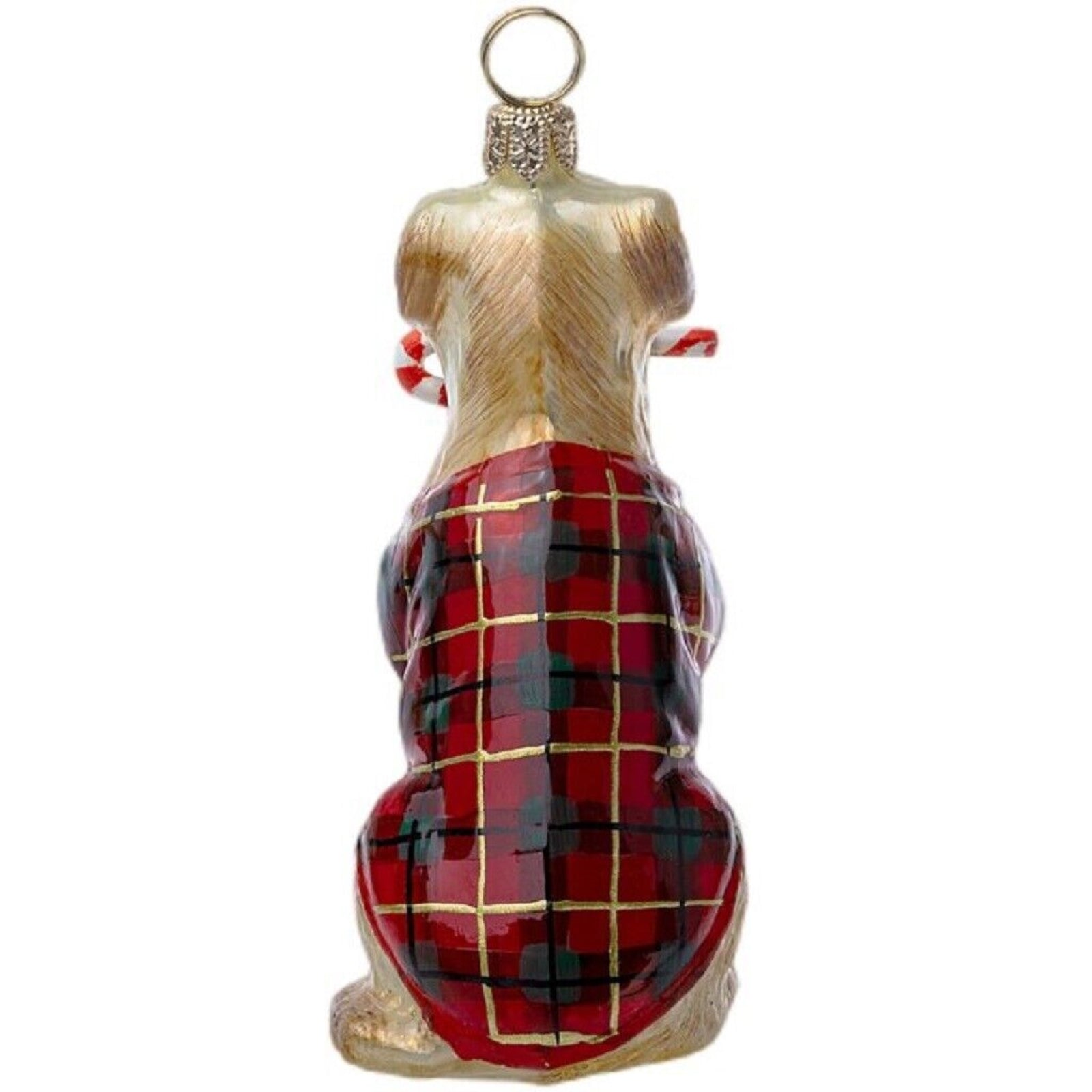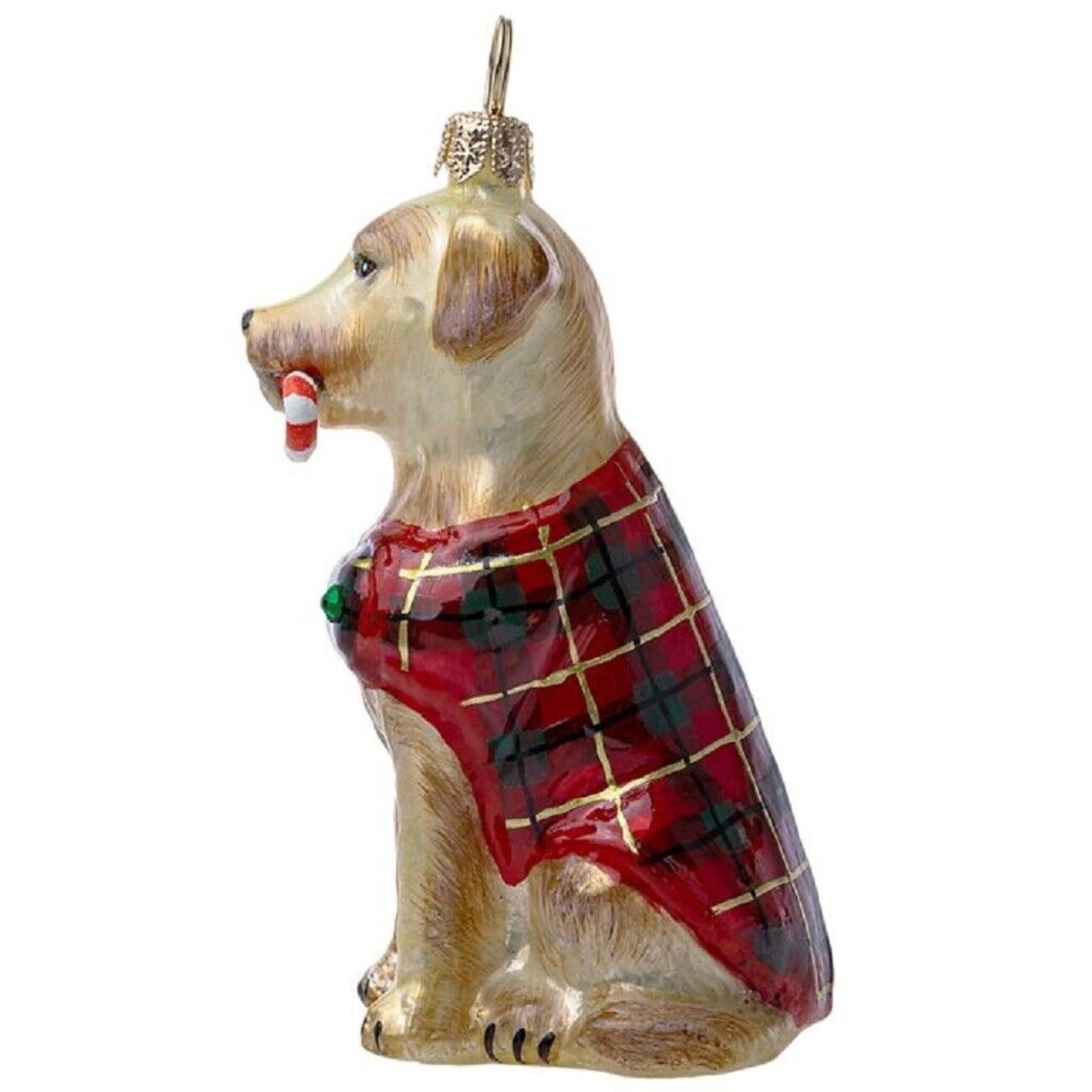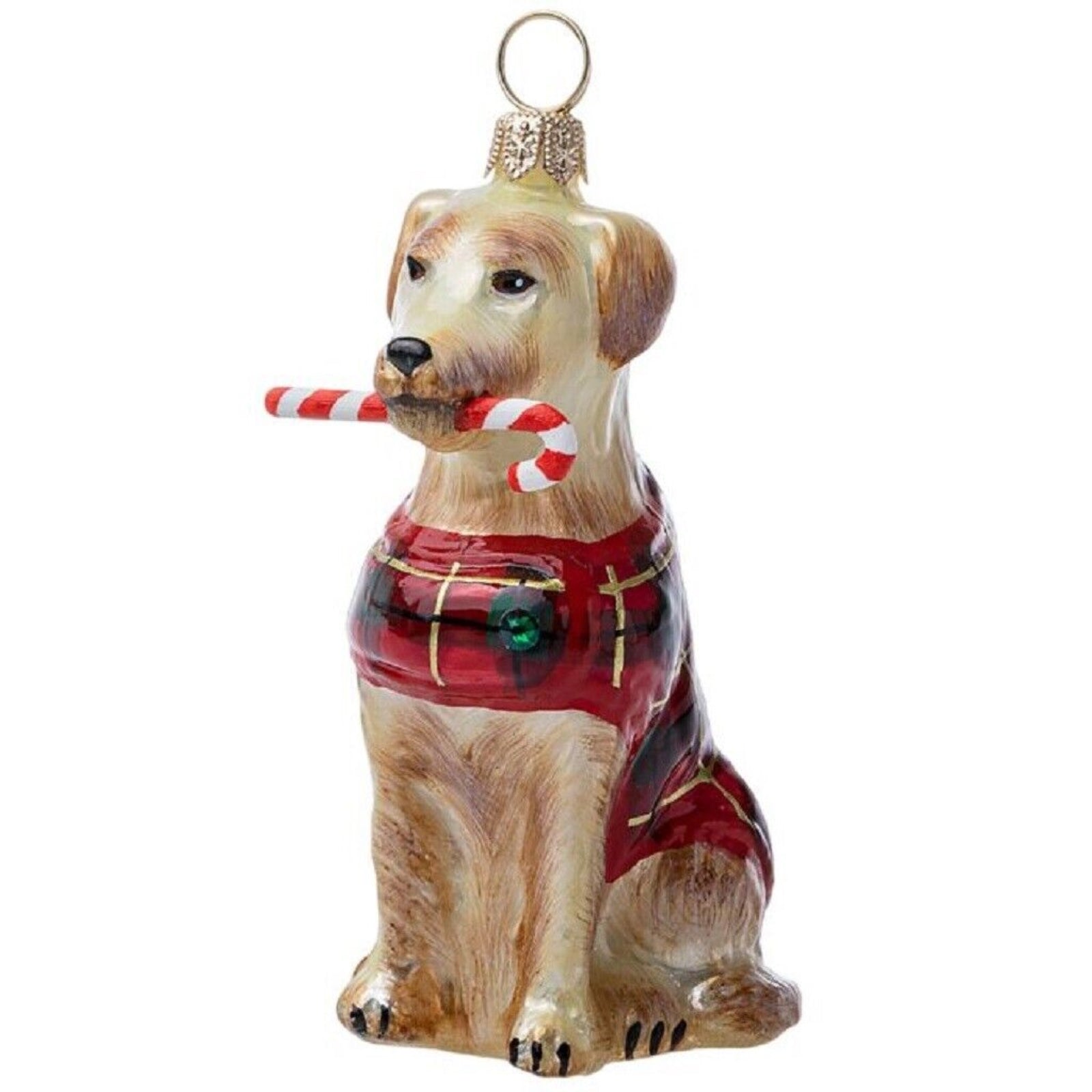 Yellow Lab with Candy Cane and Plaid Coat Ornament. Handcrafted by the finest European artists. Made from mouth blown glass. Hand painted. Made in Poland.