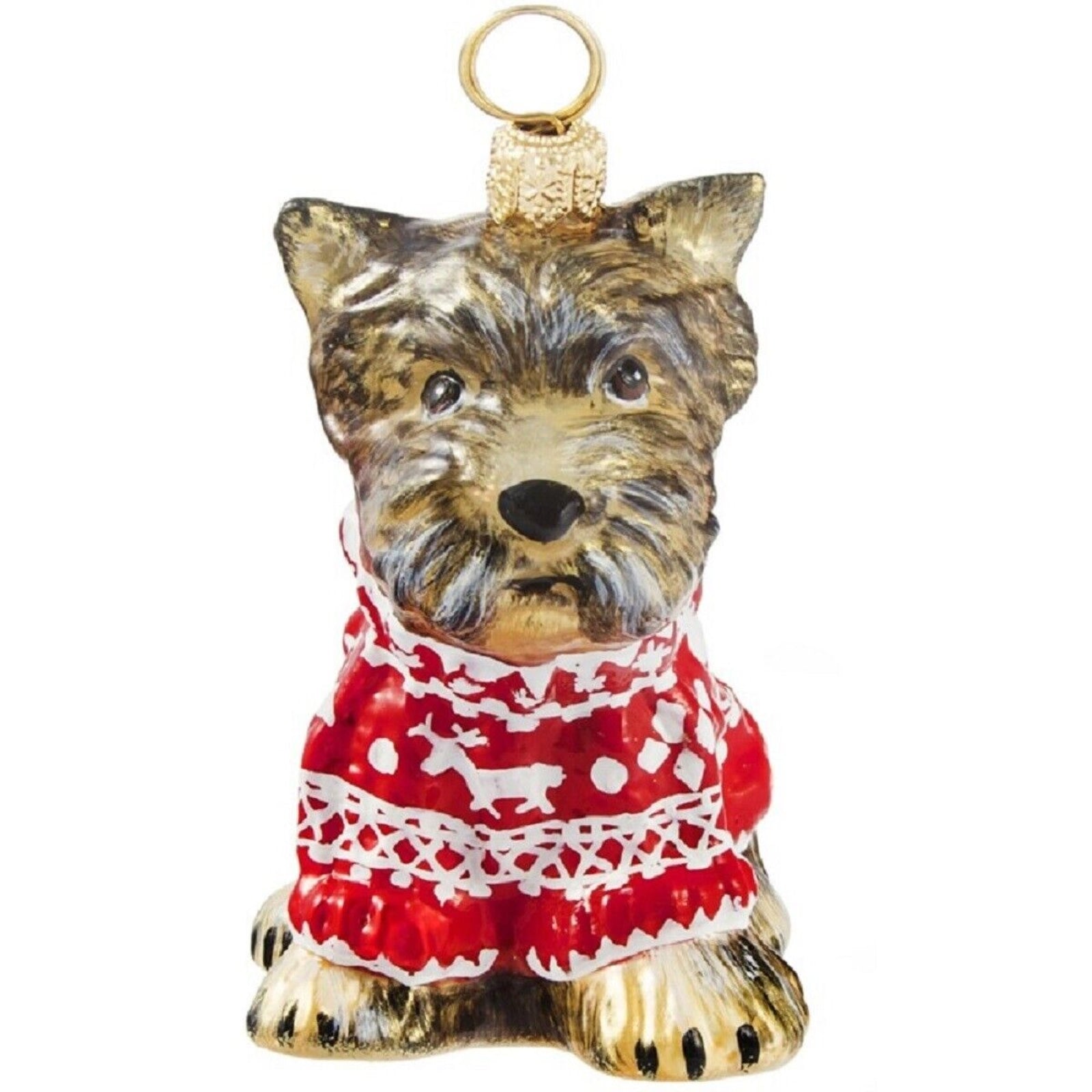 Yorkie in Nordic Sweater Ornament. Each ornament is hand painted with intricate breed details by Polish artisans. Made from mouth blown glass. Approximately 2.75 inches tall (7 cm). Includes original manufacturers box and packaging. Made by Joy to the World.