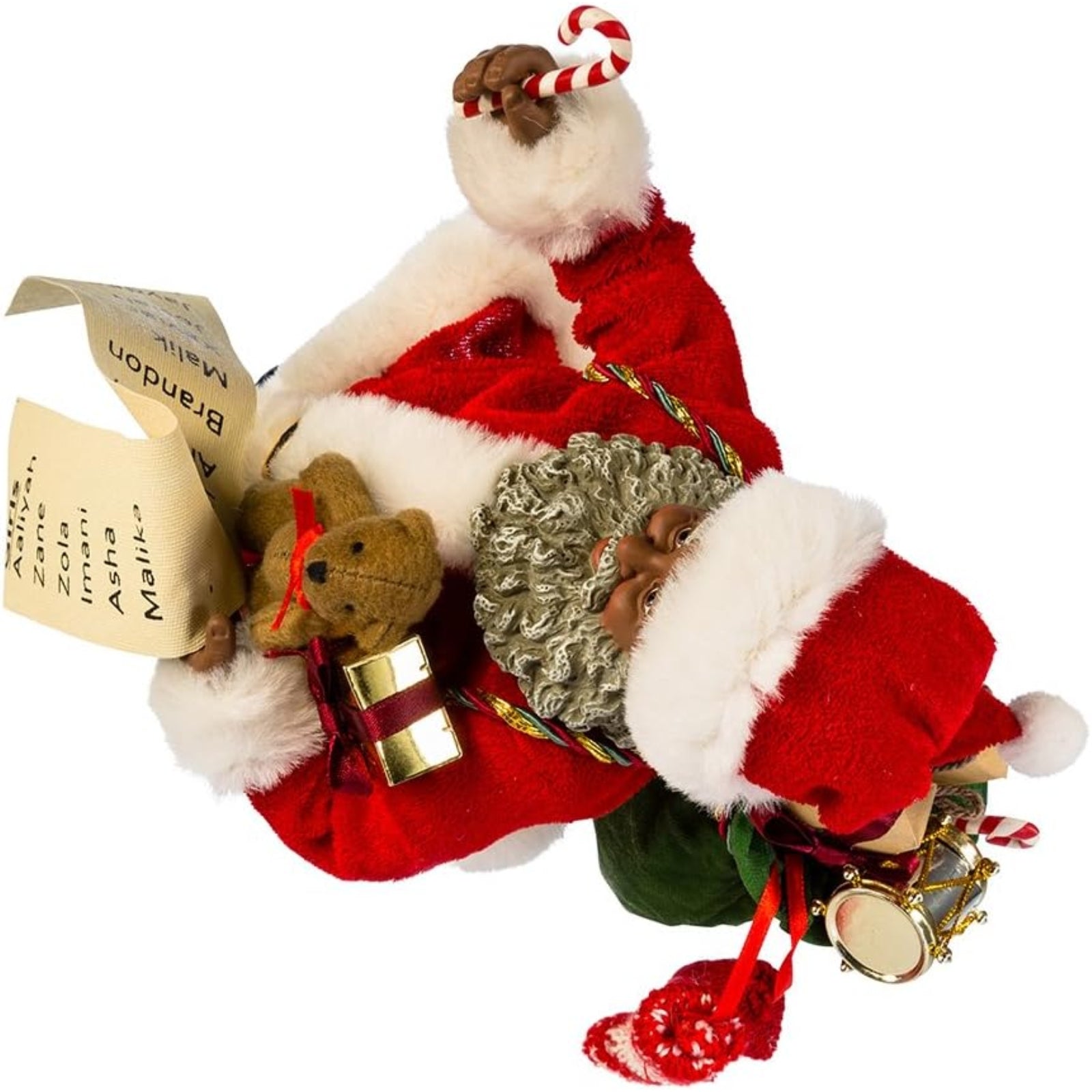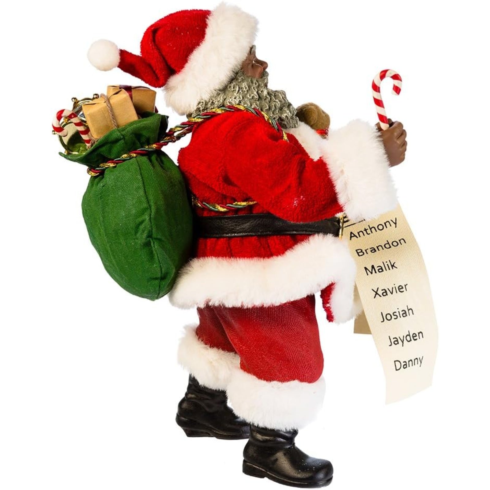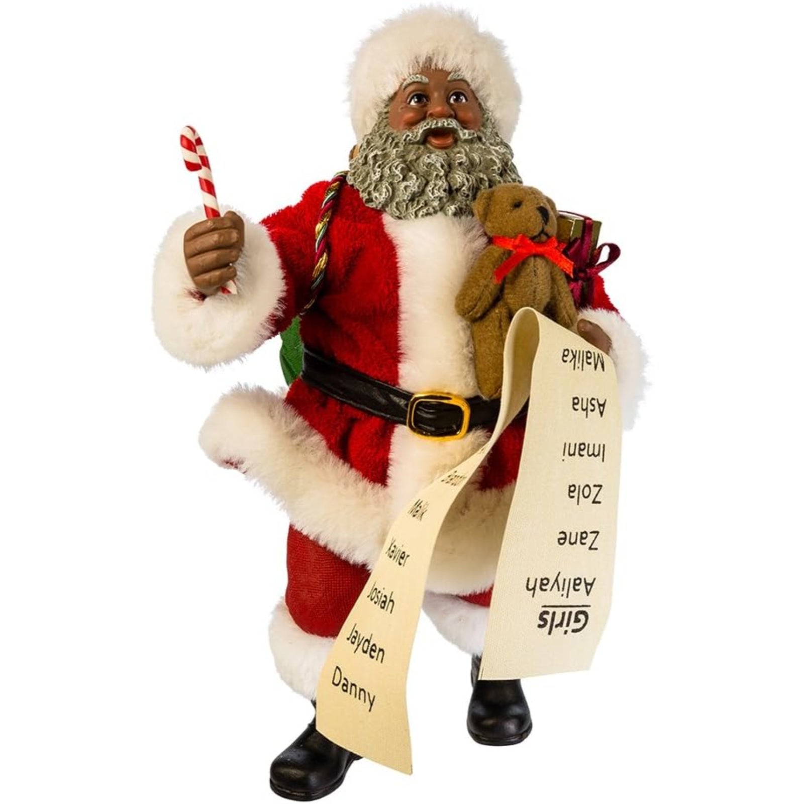 African American Santa with List and Candy Cane Figurine. Made from resin. Approximately 10.5 inches tall (27 cm). Includes original manufacturers box and packaging. Made by Kurt Adler.