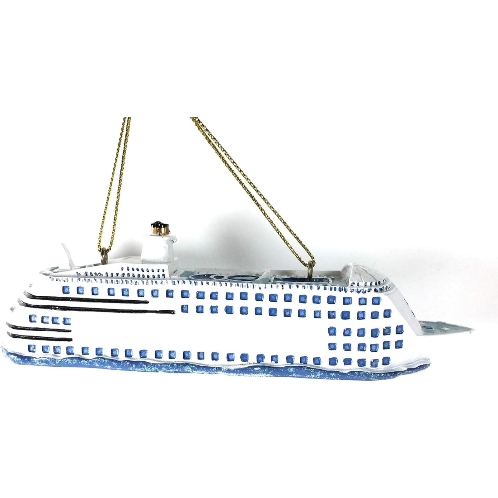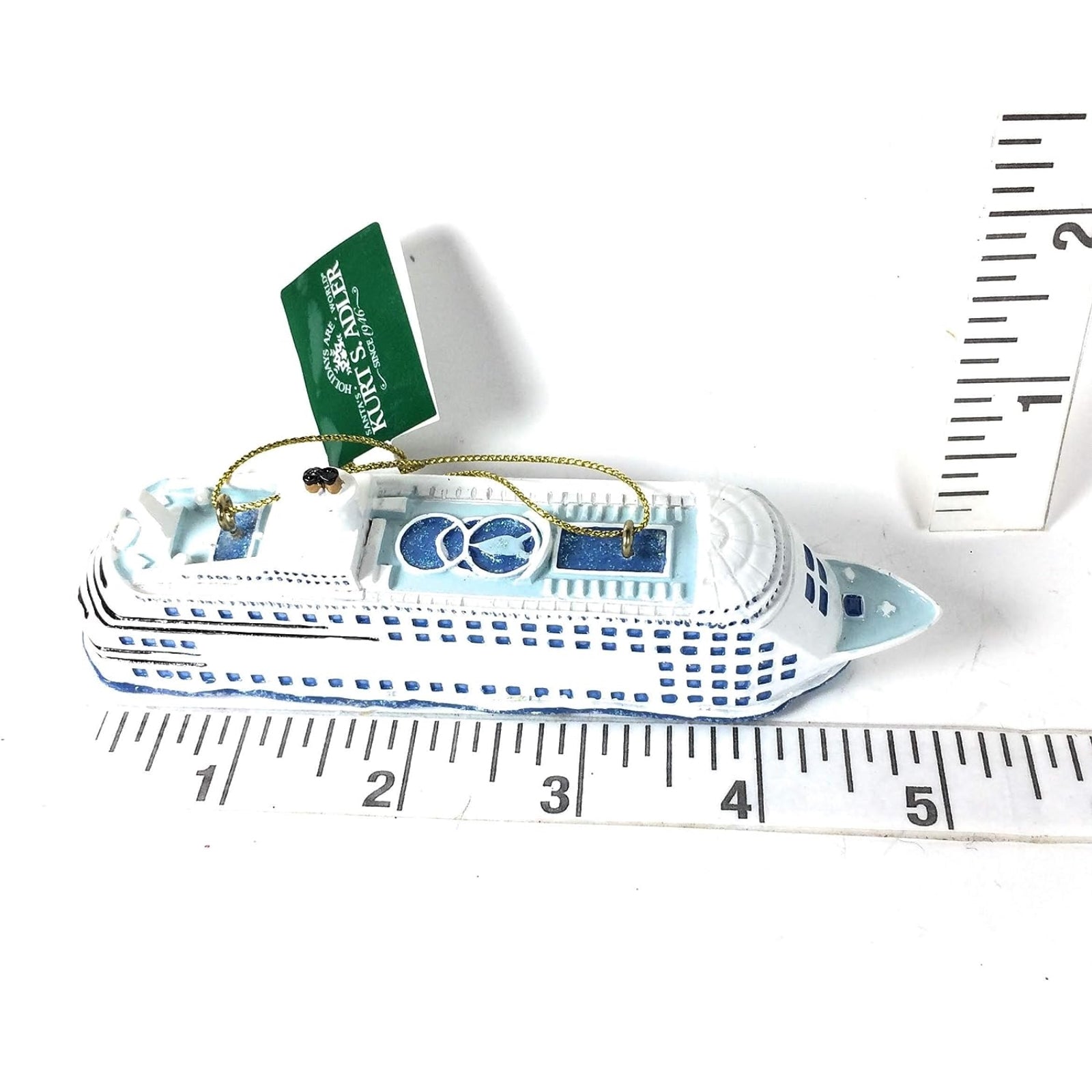 Cruise Ship Ornament. Made from resin. Approximately 5.25 inches long (13cm). Includes original manufacturers packaging – hang tag (no box). Made by Kurt Adler