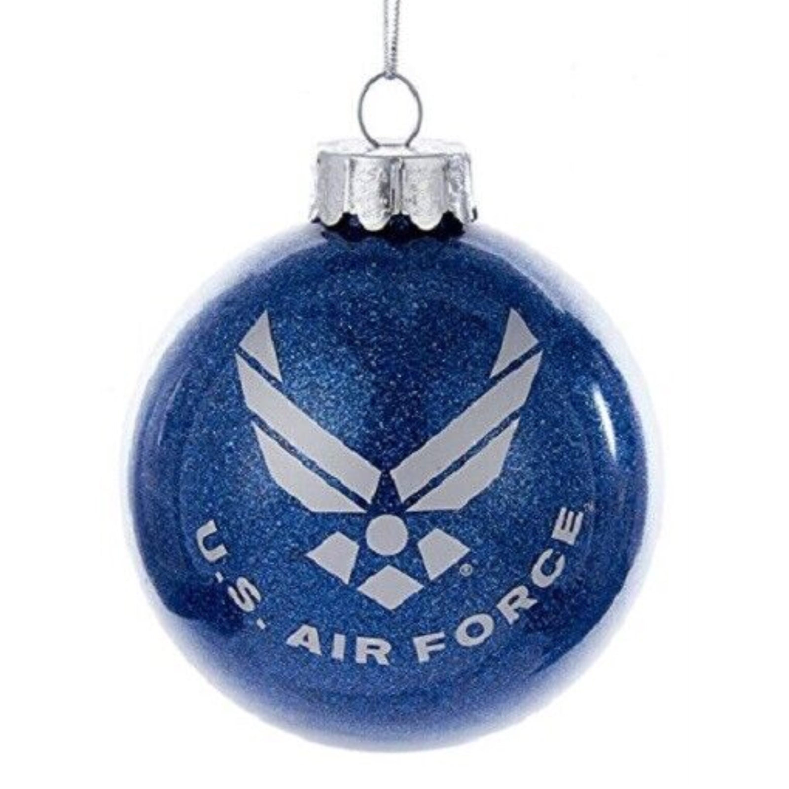 Aim High. US Air Force Logo Ball Ornament. Made from glass. Approximately 3.25 inches in diameter (80mm). Includes original manufacturers box and packaging. Made by Kurt Adler. Officially licensed by the US Air Force.
