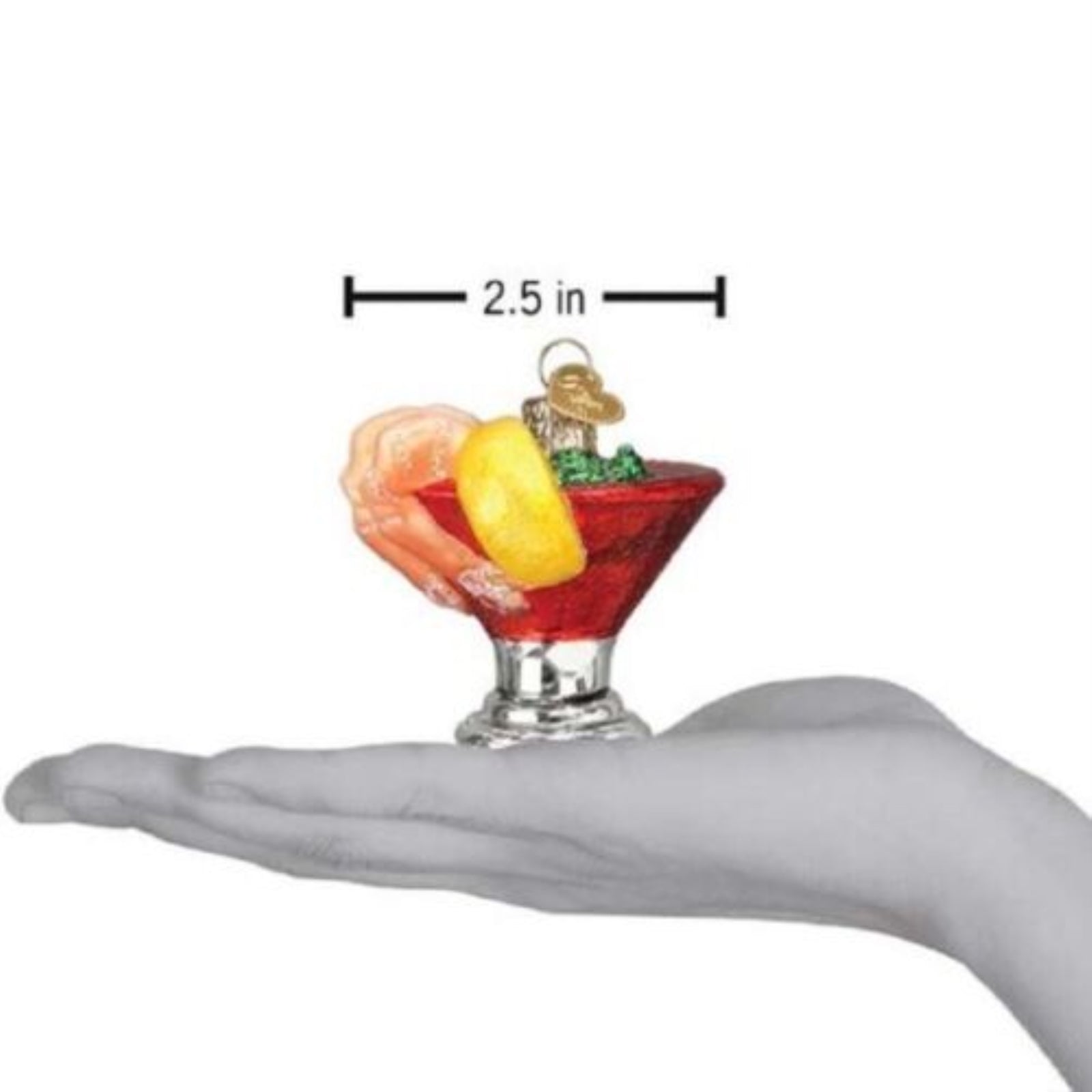 Shrimp Cocktail Ornament. Dimensions: 2.25 X 2.5 X 2.5 (HxLxW). Material: glass.Includes FREE Old World Christmas Gift Box