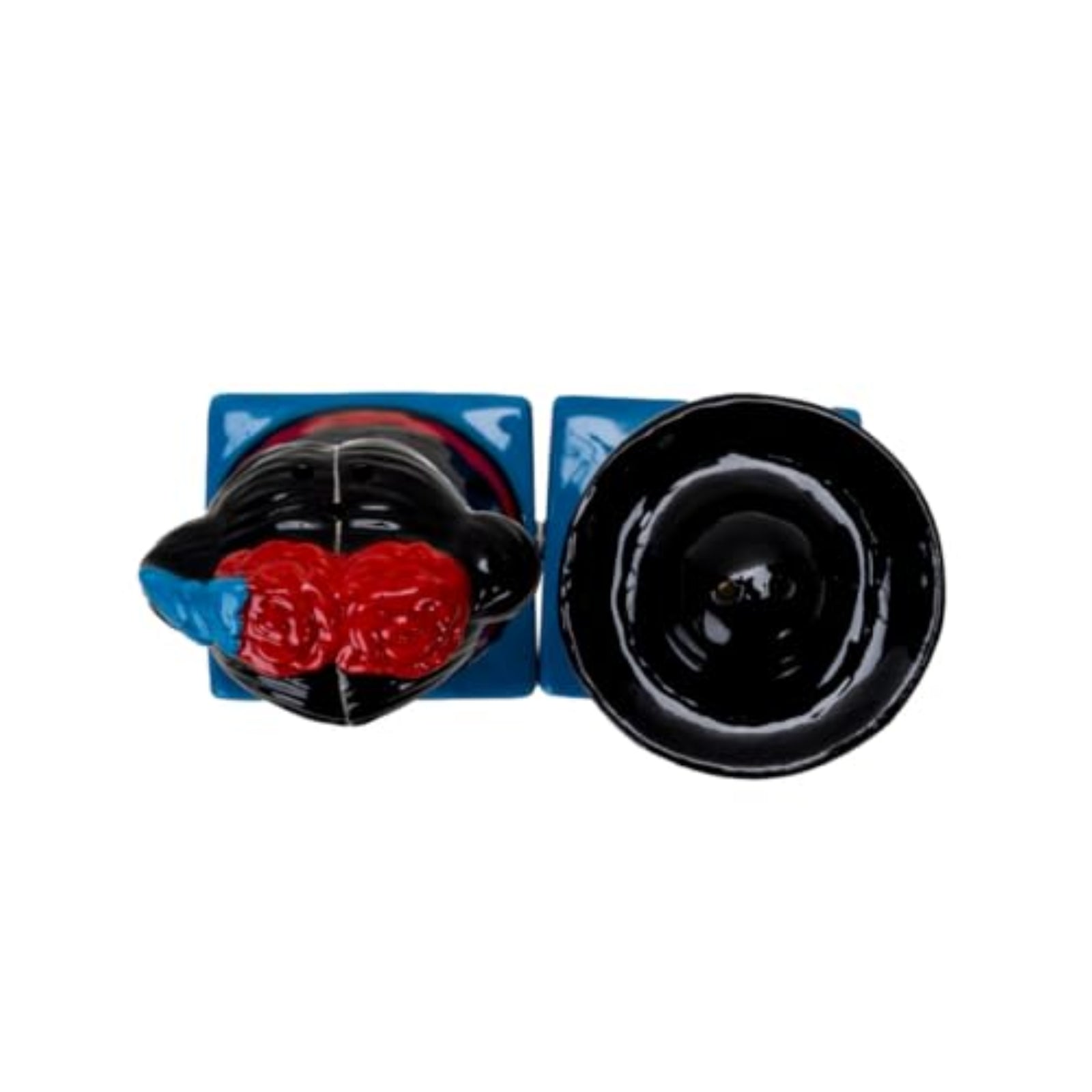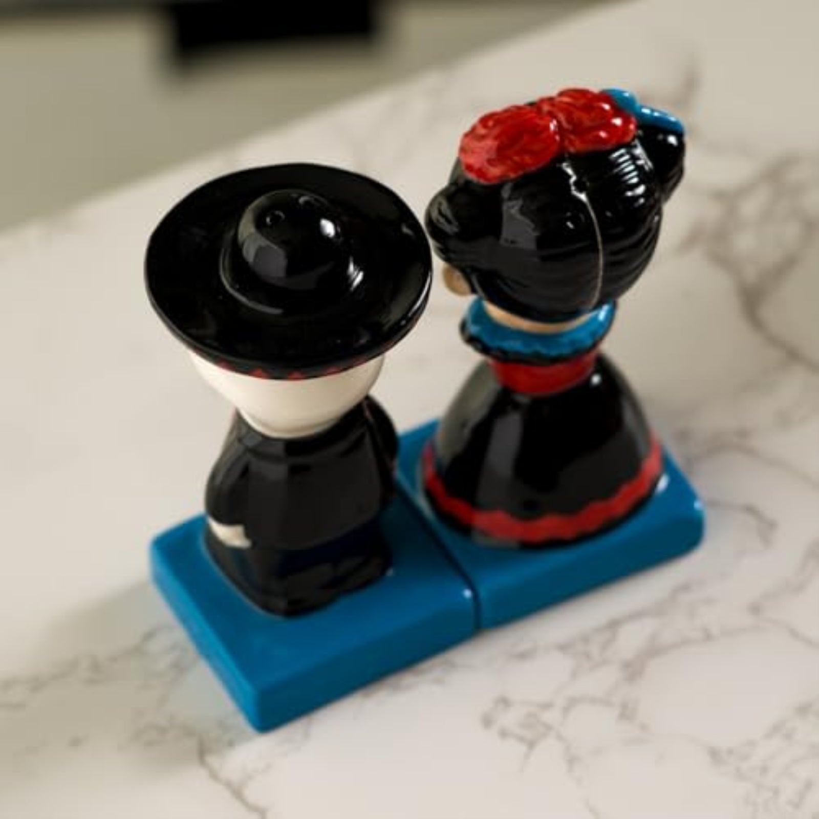 Each shaker measures approximately 1.93" X 1.81" X 3.90" and 1.89" X 1.89" X 3.90", perfect for adding a cultural touch without taking up too much space. Made from durable ceramic, these shakers are designed to withstand daily use while retaining their festive colors and details. Designed with convenience in mind, these shakers feature a user-friendly structure for effortless refilling, making seasoning your dishes simple and efficient. Please note, they are hand-wash only to preserve their quality and appearance. These shakers feature a beautifully crafted lady adorned with red roses and a skeleton man in a festive hat, embodying the spirit of Día de Los Muertos. Whether for use at a Dia de Los Muertos celebration or as a year-round decorative piece, these salt and pepper shakers make a wonderful gift for anyone appreciating Mexican heritage and traditions.