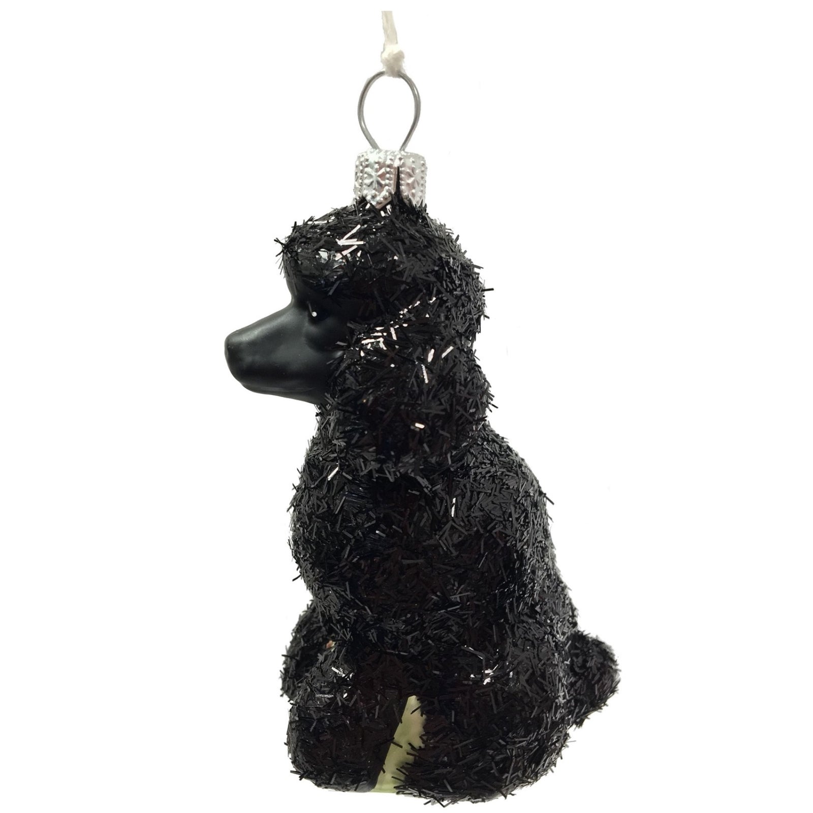 Black Glitter Poodle Ornament. Handcrafted in Poland. Hand-painted. Made from mouth blown glass. Approximately 1.5 x 2 x 3.25 inches. Includes original Pinnacle Peak Trading box and packaging. Imported by Pinnacle Peak Trading Company.