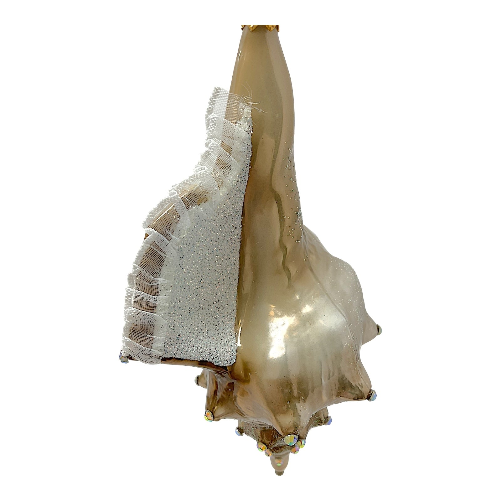 Jeweled Conch Seashell Ornament. Handcrafted in Poland. Hand-painted by Polish artisans. Made from mouth blown glass. Approximately 3 x 2.5 x 5.5 inches (LxWxH). Includes original Pinnacle Peak Trading box and packaging. Imported by Pinnacle Peak Trading Company.