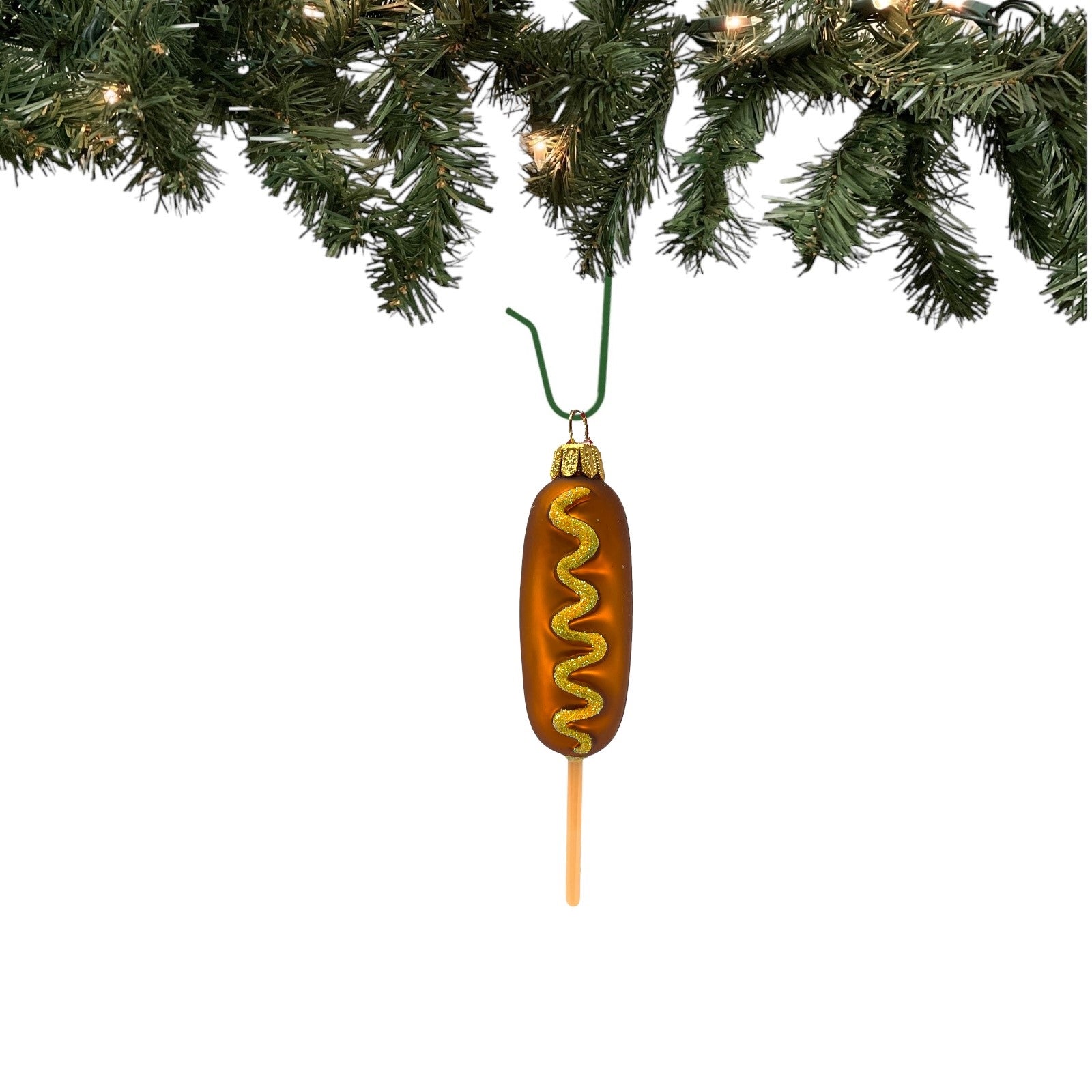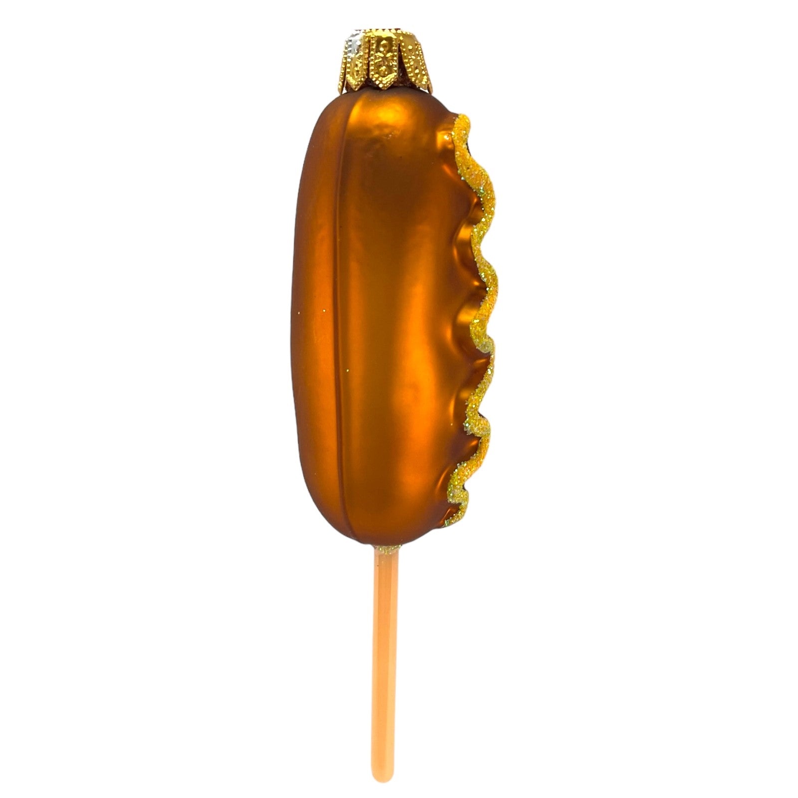 Corn Dog Ornament. Handcrafted in Poland. Hand-painted by Polish artisans. Made from mouth blown glass. Approximately 1 x 1 x 4.5 inches. Includes original Pinnacle Peak Trading box and packaging. Imported by Pinnacle Peak Trading Company.