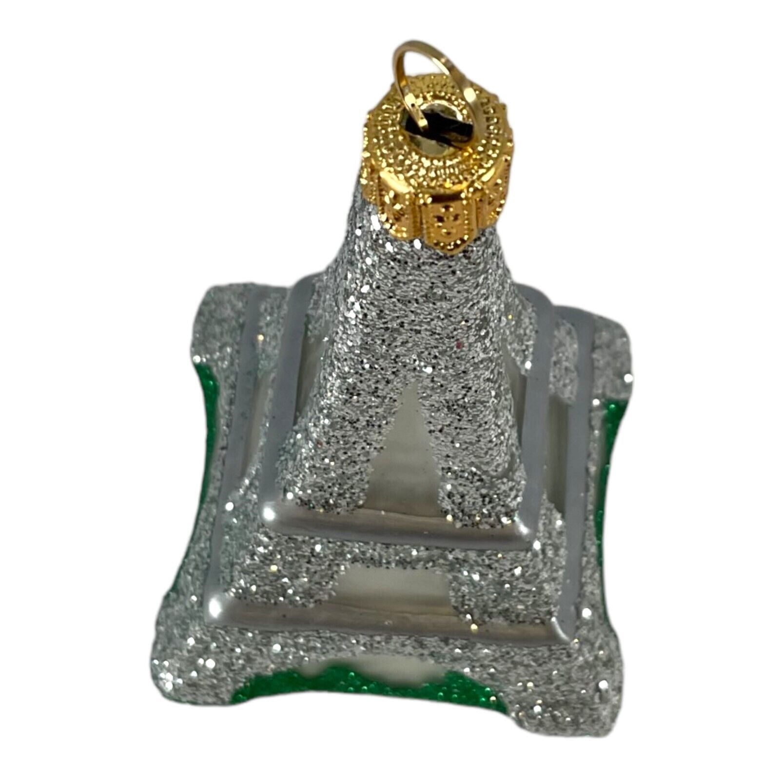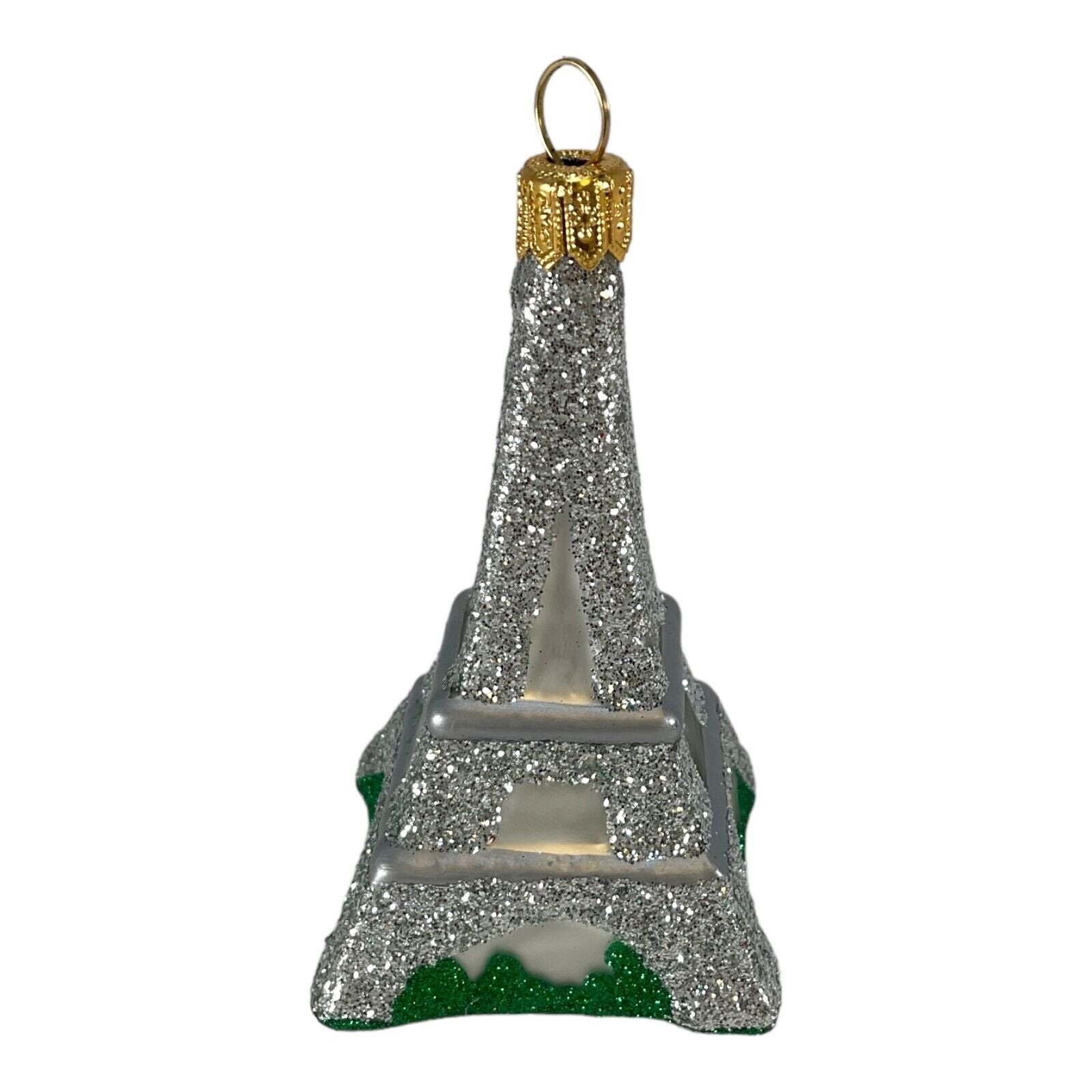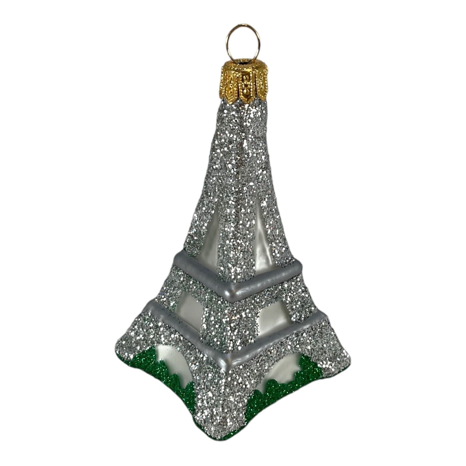 Eiffel Tower Ornament. Handcrafted in Poland. Hand-painted by Polish artisans. Made from mouth blown glass. Approximately 2 x 2 x 3.5 inches. Includes original manufacturers box and packaging. Imported by Pinnacle Peak Trading Company.
