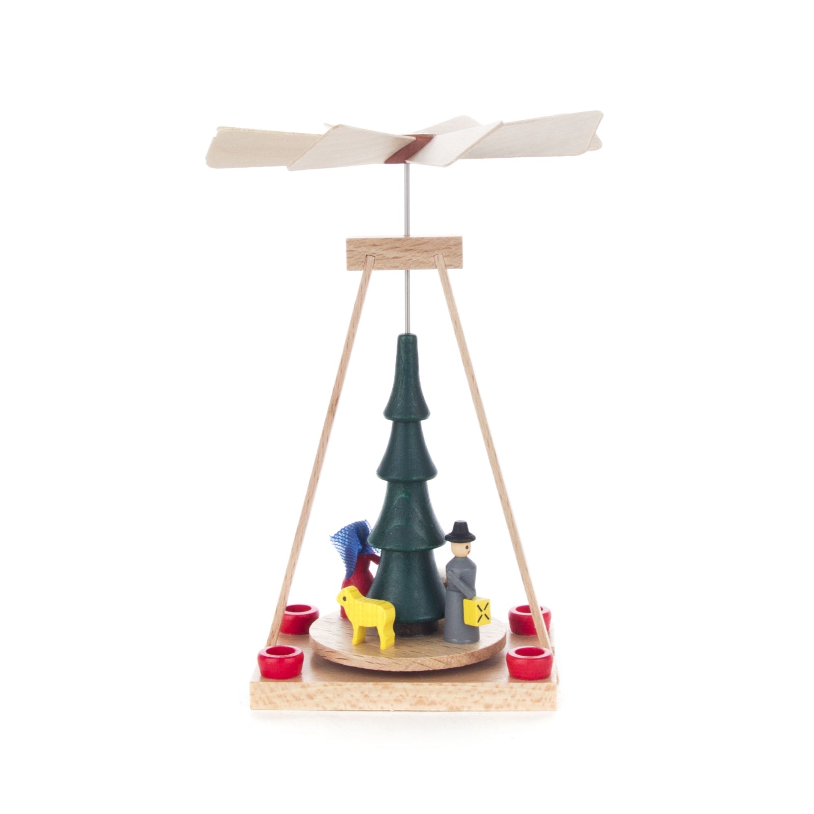 Miniature Pyramid Nativity Scene. German Wood. Handcrafted in the Erzgebirge region of Germany. 5.5in H (13.9cm). 3.9in L (9.9cm). 3.9in W (9.9cm. Pinnacle Peak Trading.