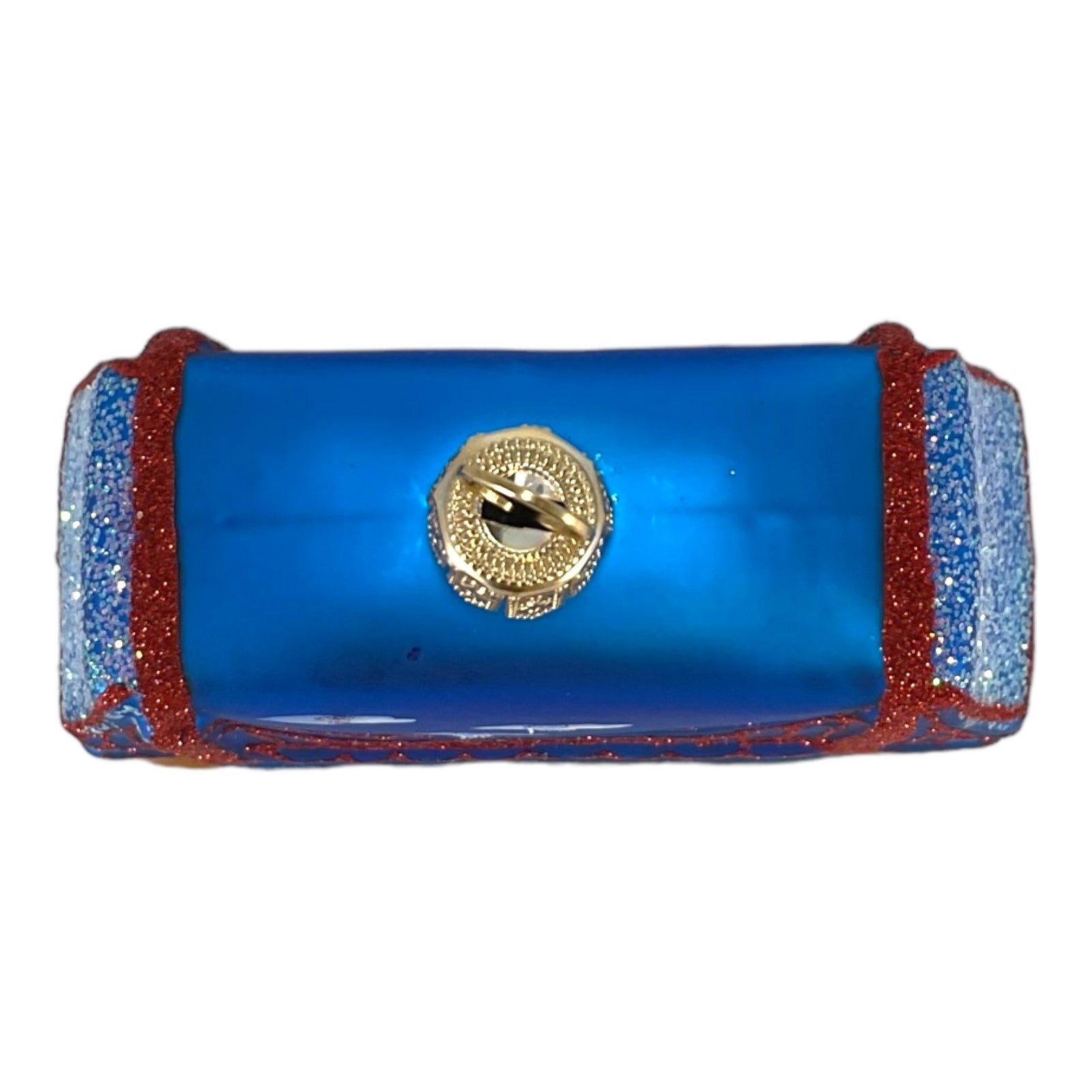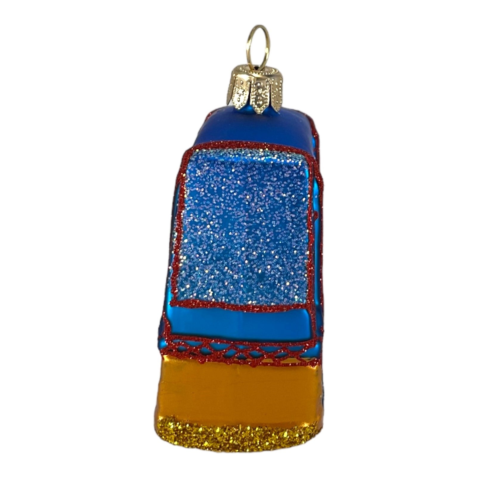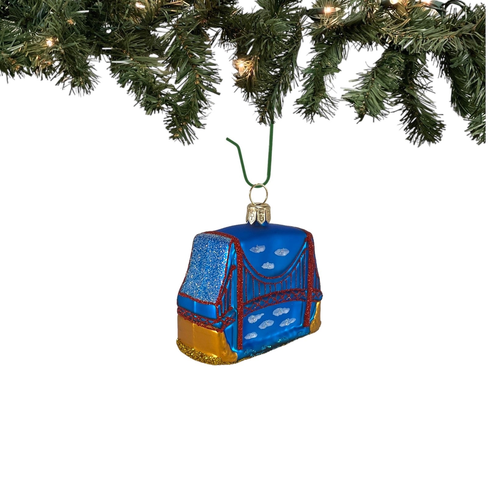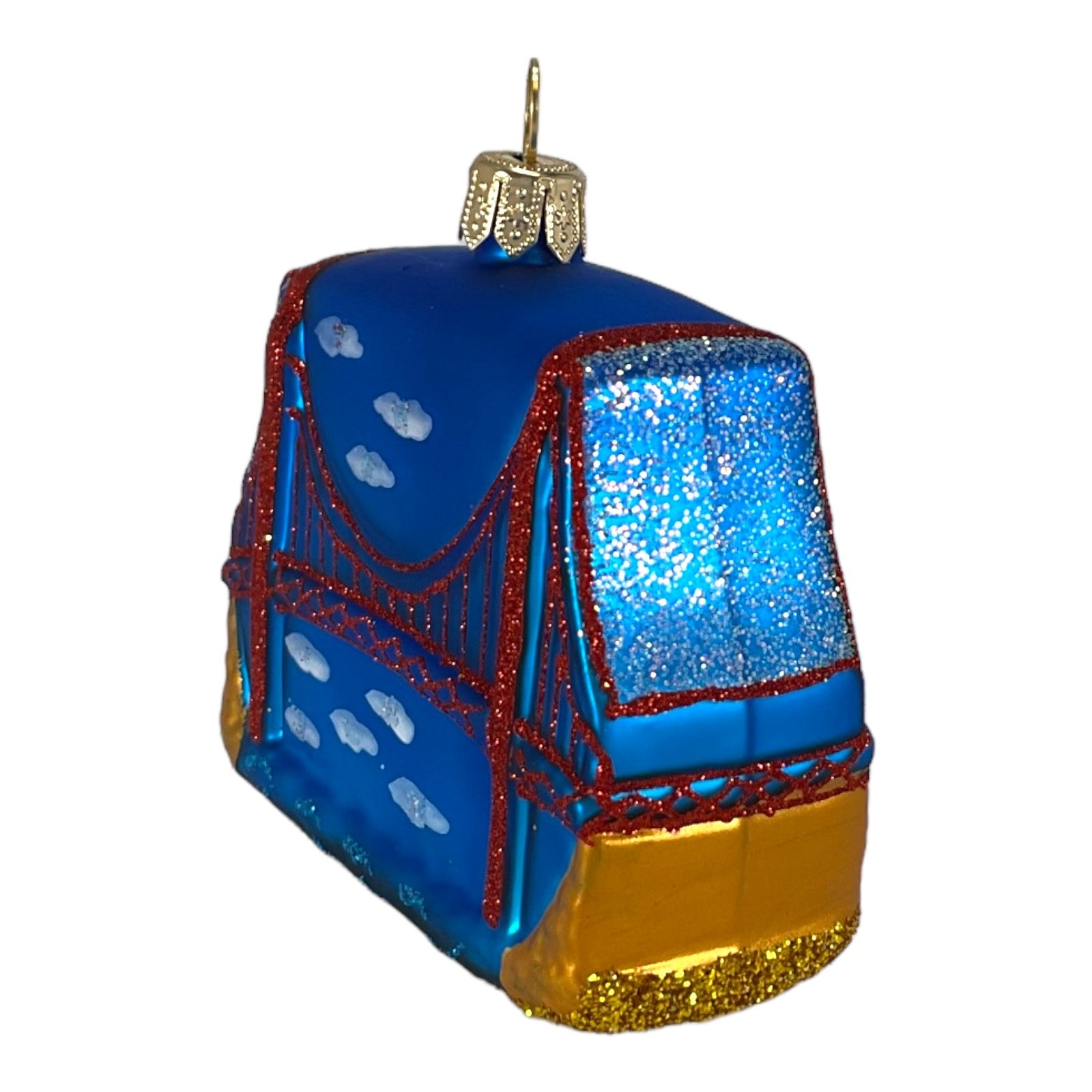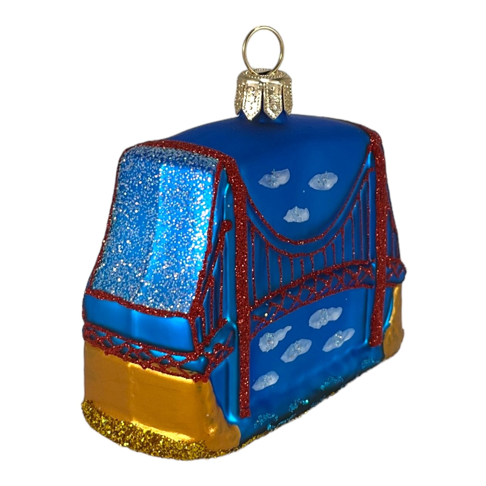 Small Golden Gate Bridge Ornament. Handcrafted in Poland. Hand-painted by polish artisans. Made from mouth blown glass. Approximately 2.4 inches tall, 2.75 inches wide, and 1.2 inches deep. Includes original manufacturers box and packaging. Imported by Pinnacle Peak Trading Company.