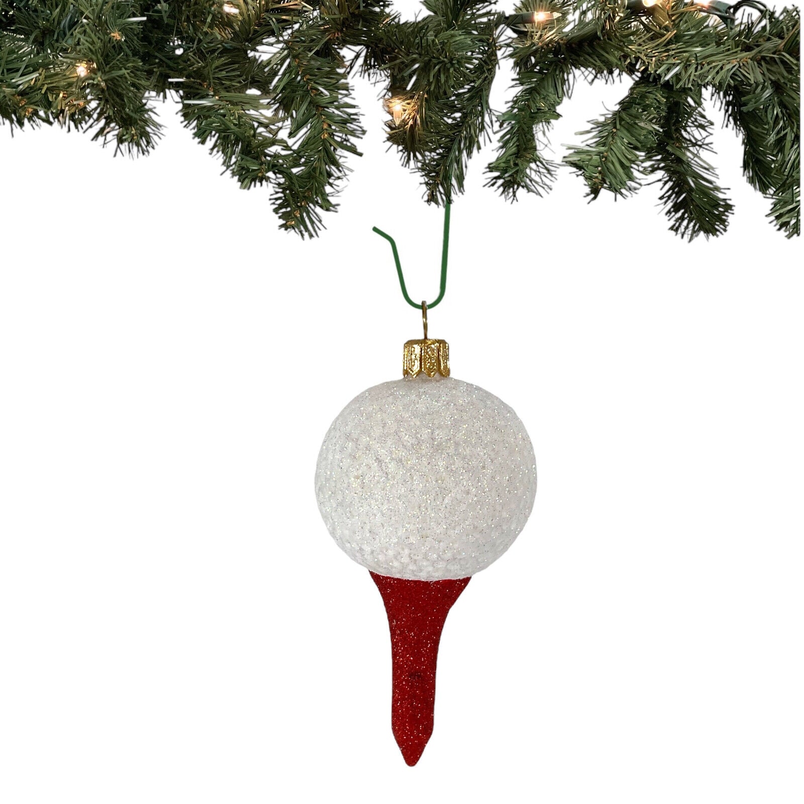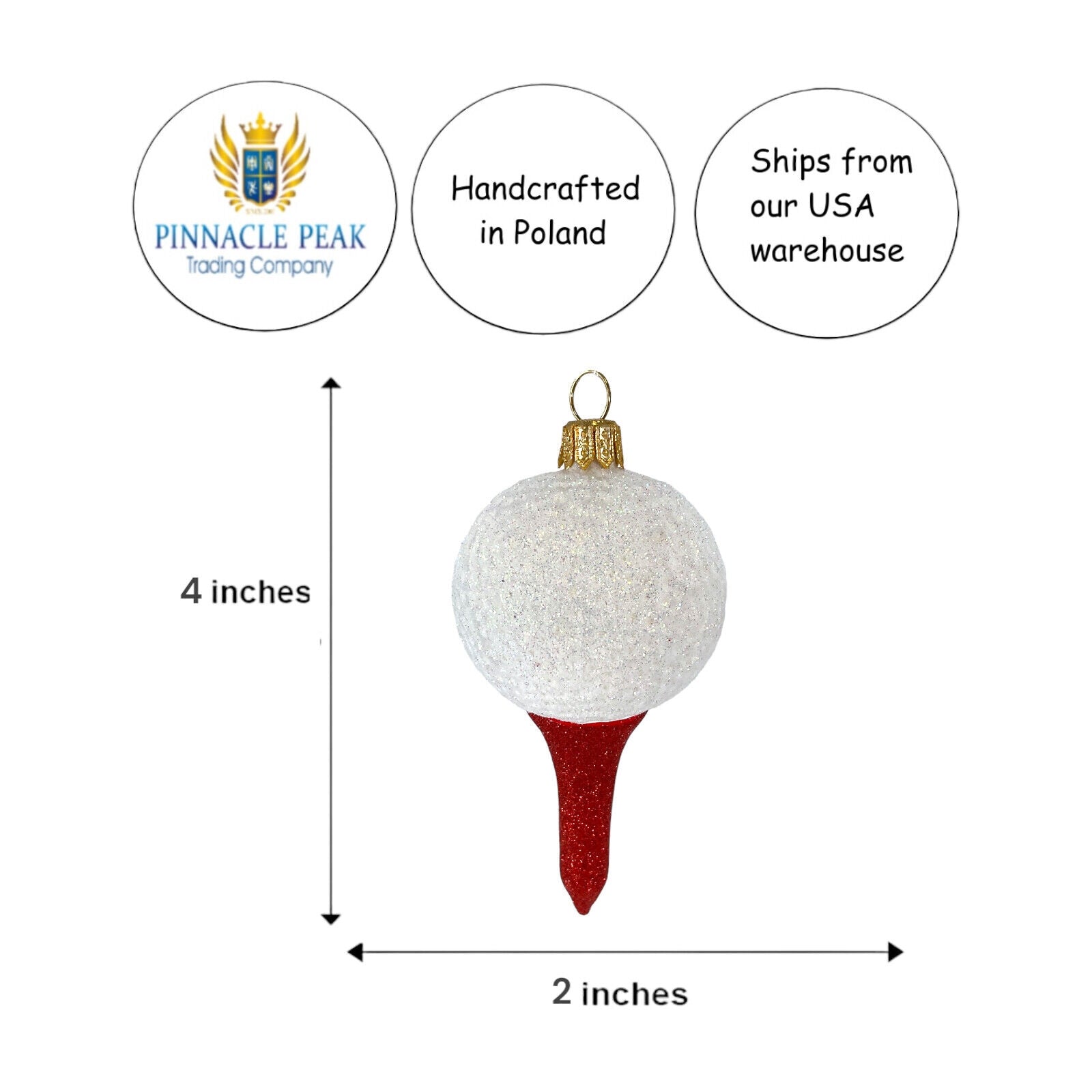 Golf Ball Ornament. Handcrafted in Poland. Hand-painted. Made from mouth blown glass. Approximately 4 inches tall (10.2 cm). Approximately 2 inches long (5.1 cm). Approximately 2 inches wide (5.1 cm). Comes packaged in a gift box. Imported by Pinnacle Peak Trading Company.