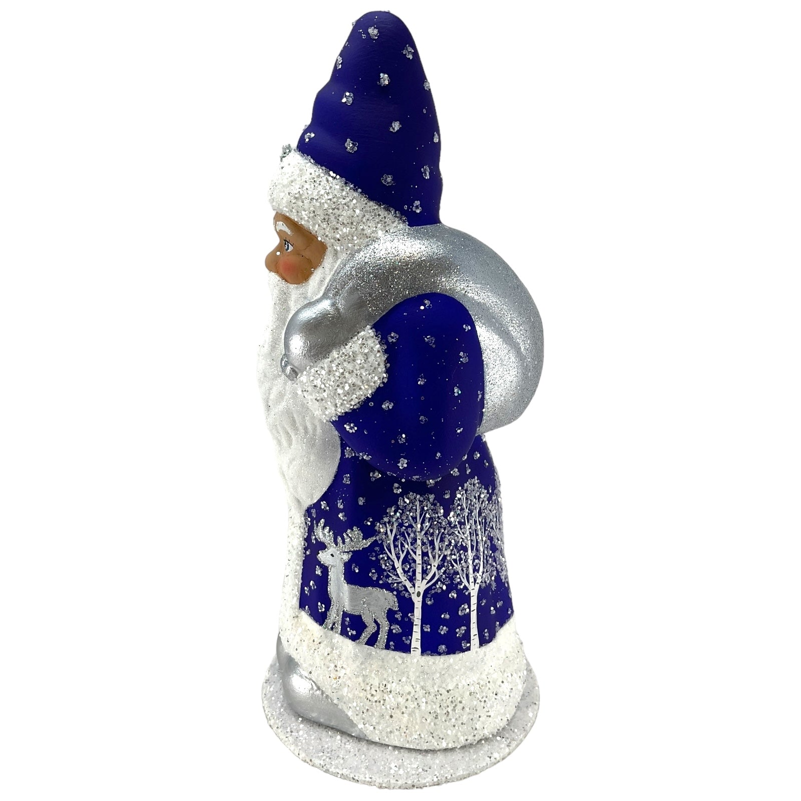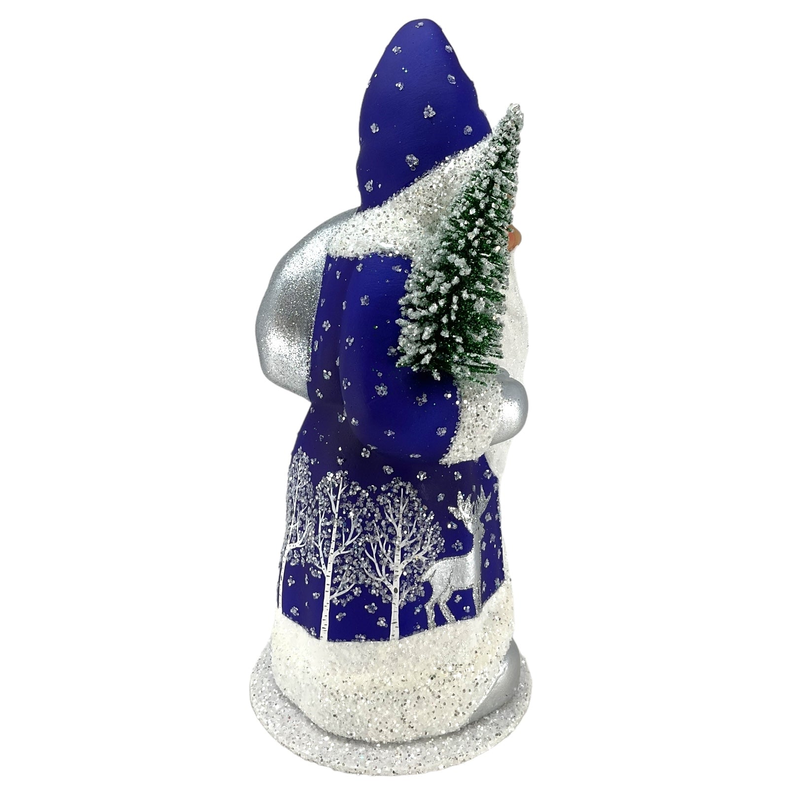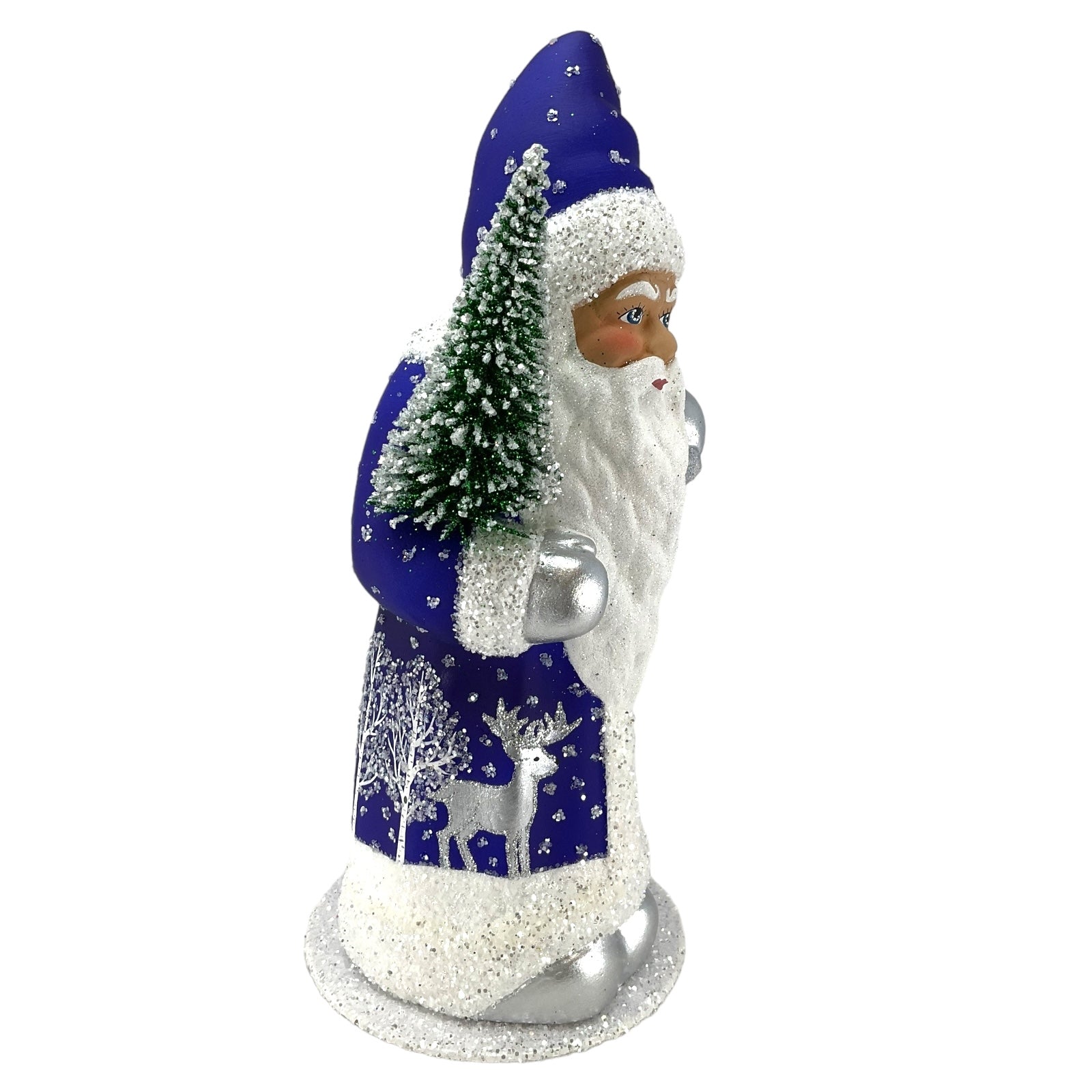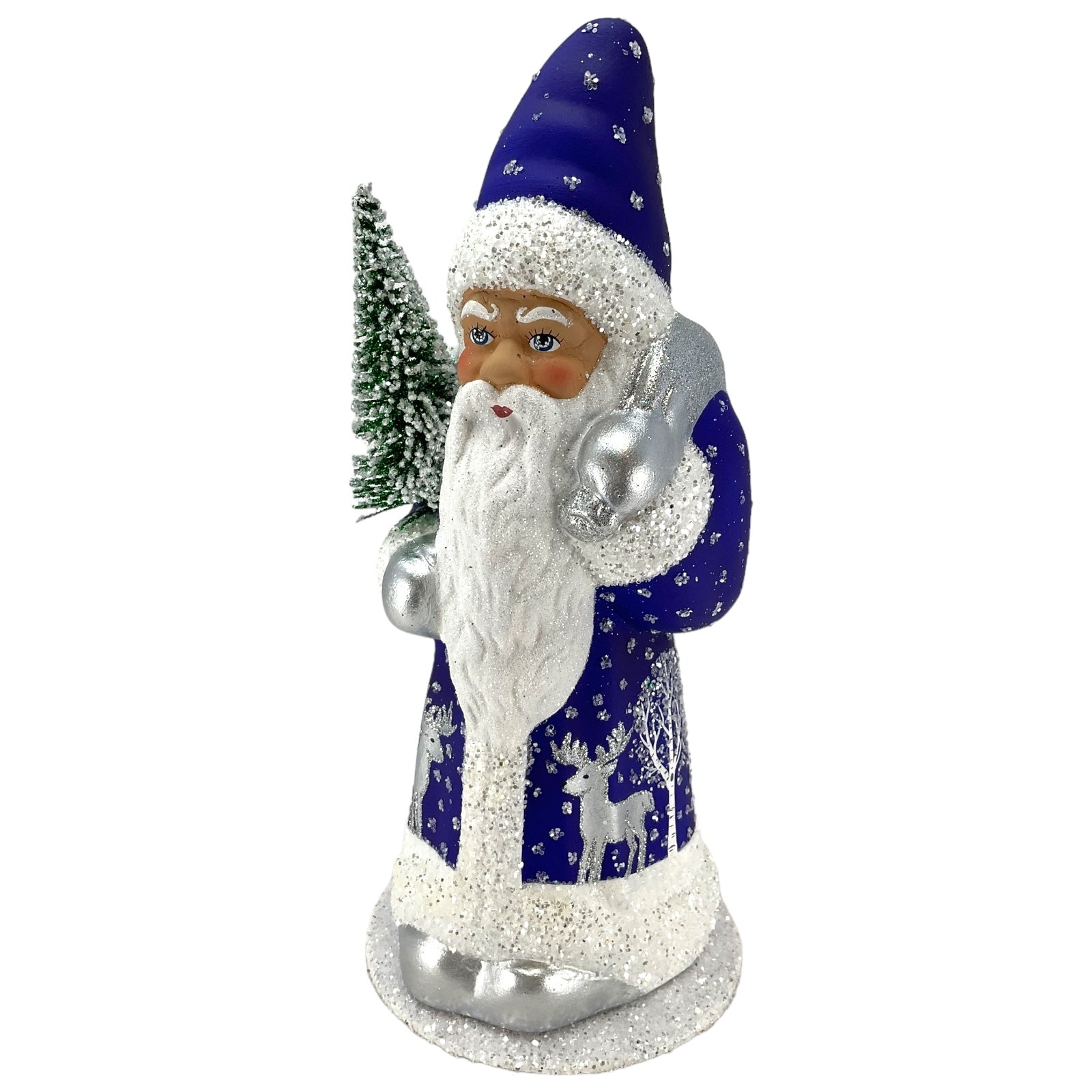 Deep Blue Santa with Reindeer Decor German Paper Mache Candy Container. Each piece is signed and stamped on the bottom with the following "This limited production "papier mache" is hand-made in the original antique mold in Germany by INO SCHALLER.". Made from Paper Mache and is hand-painted with use of beads and glitter. Handcrafted in Bavaria Germany. Approximately 4.75 x 4.75 x 10.25 inches. Manufactured for Pinnacle Peak Trading by Ino Schaller.