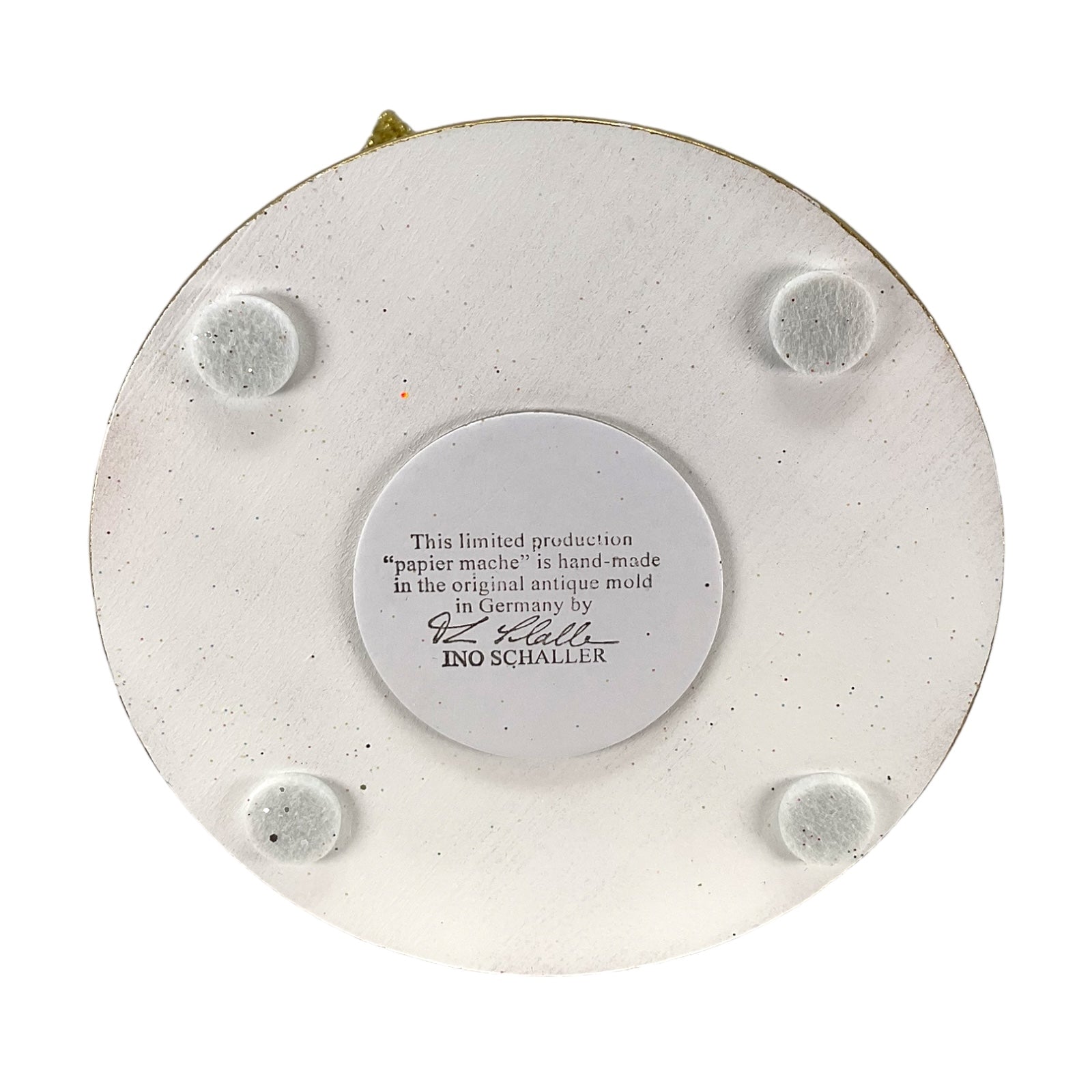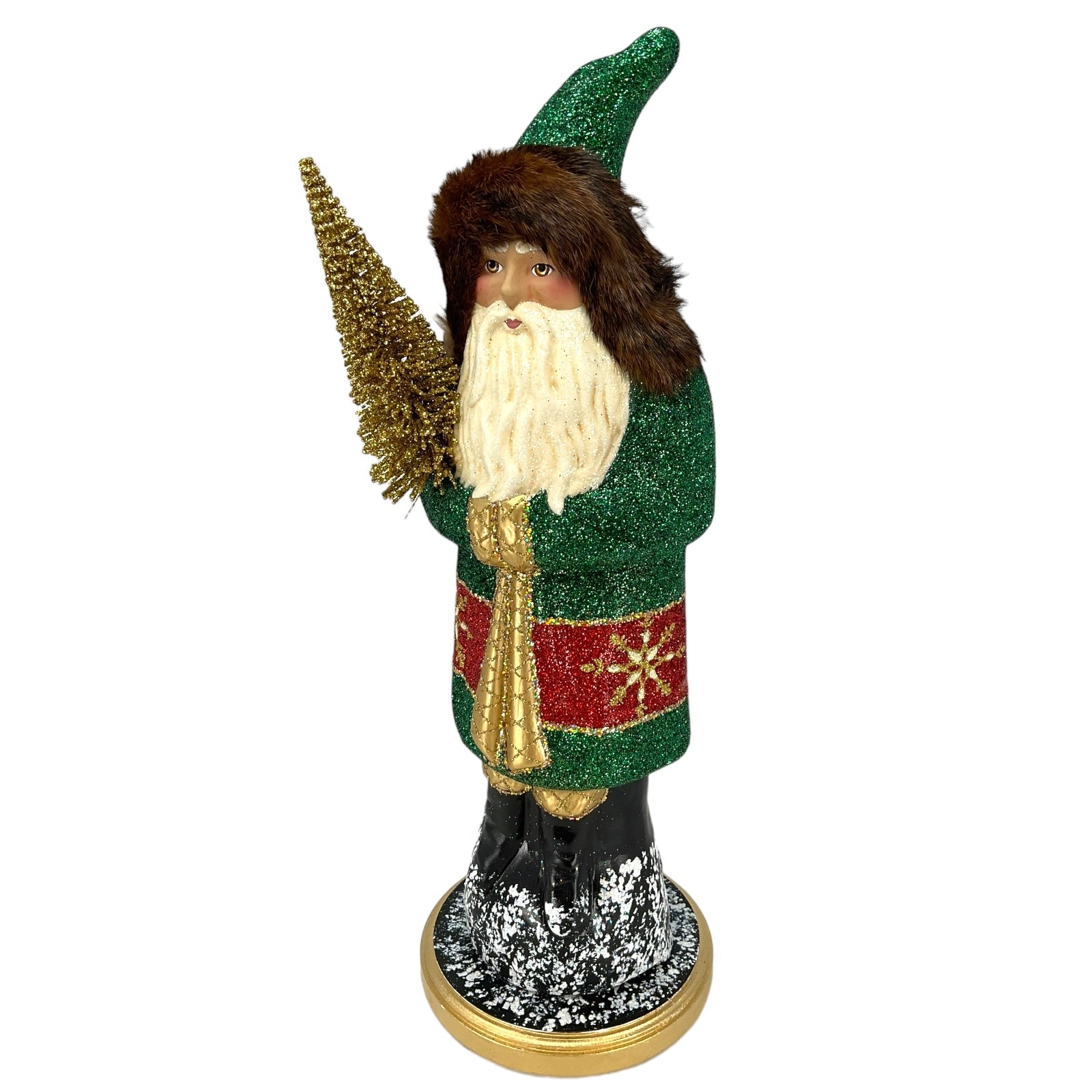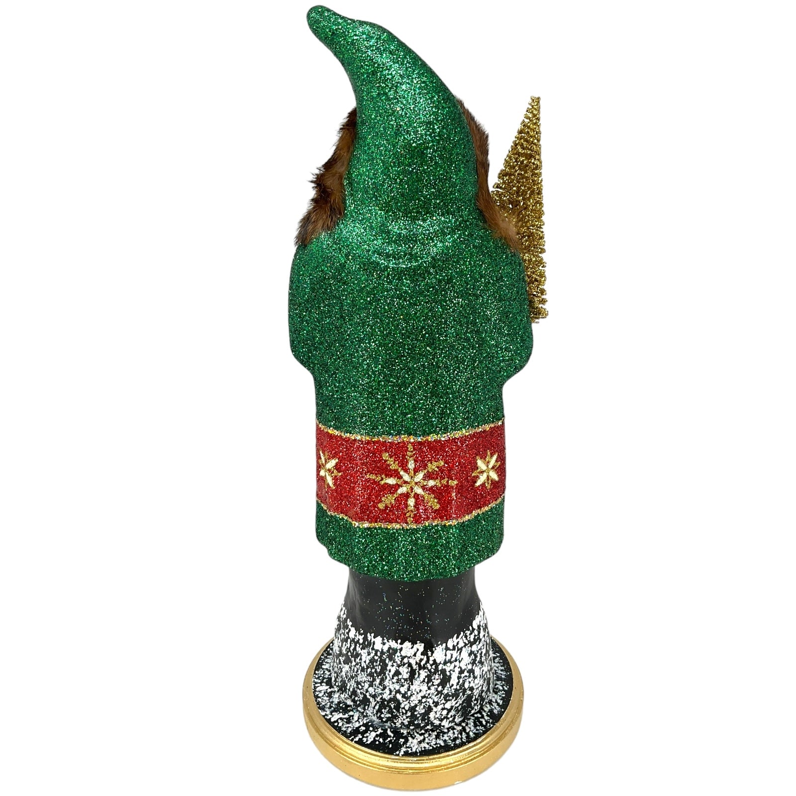 Forest Green Santa with Gold Tree Large German Paper Mache. Each piece is signed and stamped on the bottom with the following "This limited production "papier mache" is hand-made in the original antique mold in Germany by INO SCHALLER.". Made from Paper Mache and is hand-painted with use of glitter. Handcrafted in Bavaria Germany. Approximately 6.25 x 6.25 x 18 inches. Manufactured for Pinnacle Peak Trading by Ino Schaller.