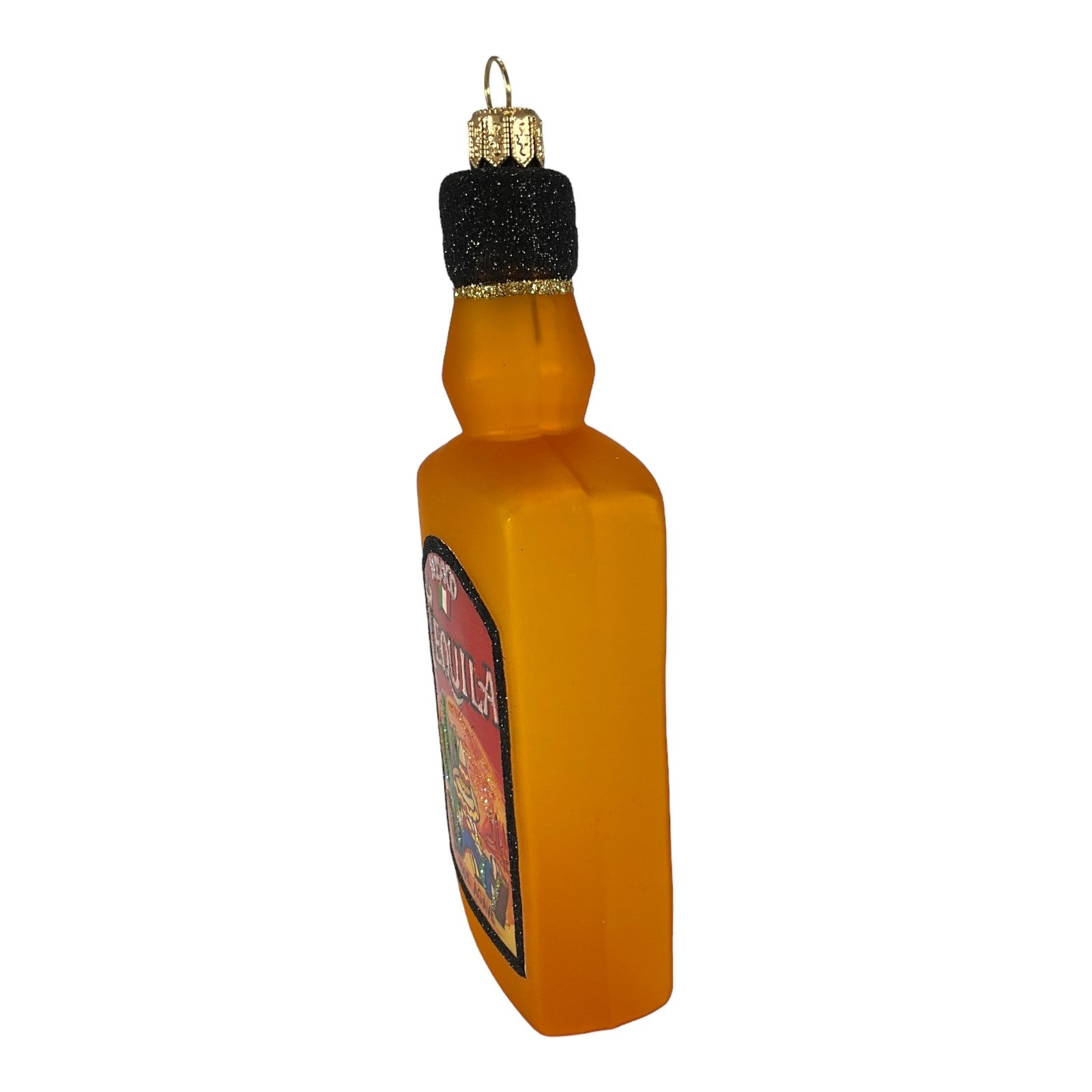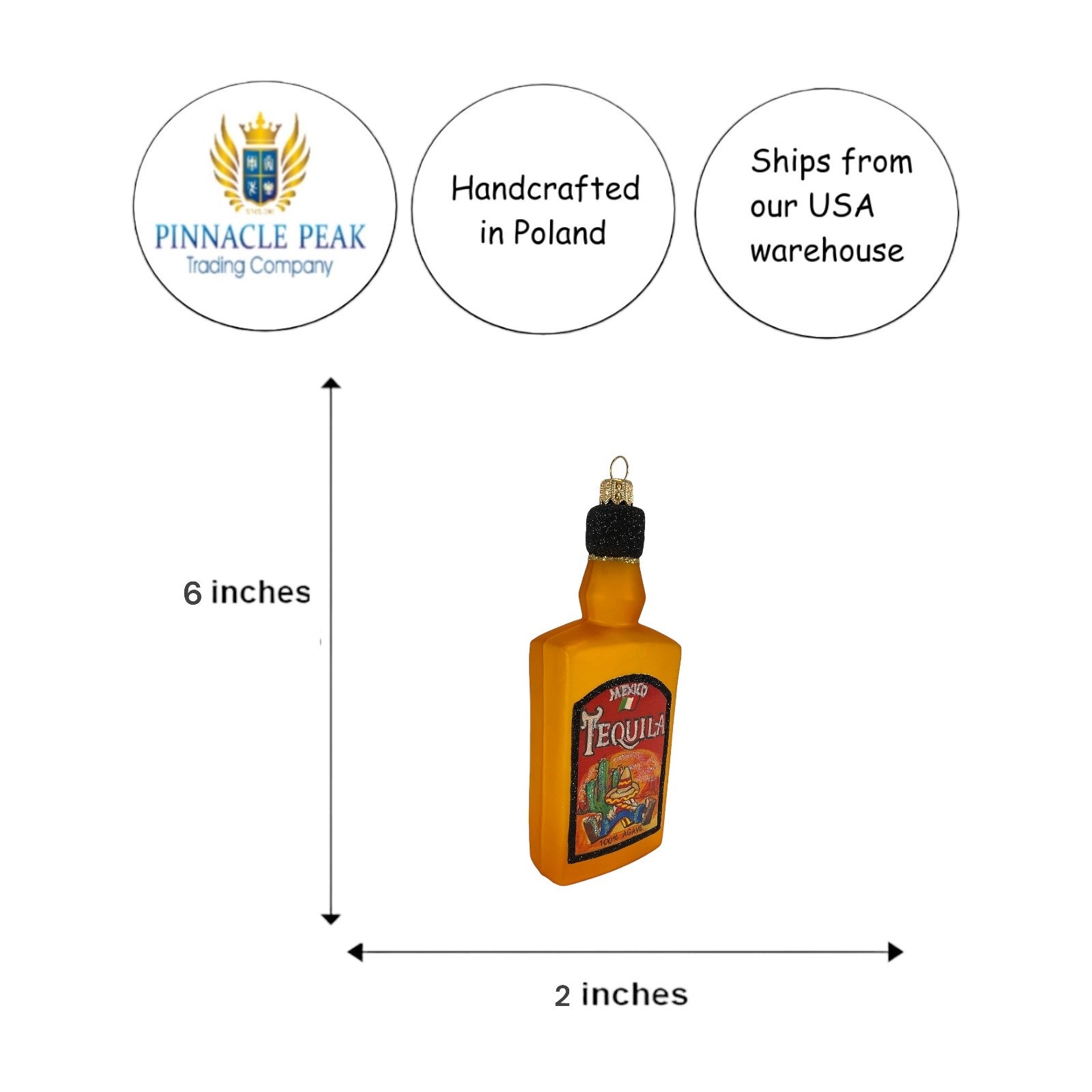 Tequila Bottle Ornament. Made in Poland. Mouth blown and hand painted. Made from glass. Approximately 2 x 1 x 6 inches (LxWxH). Includes original Pinnacle Peak Trading box and packaging. Imported by Pinnacle Peak Trading Company.