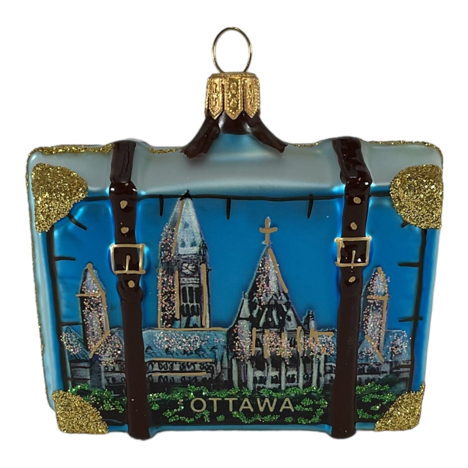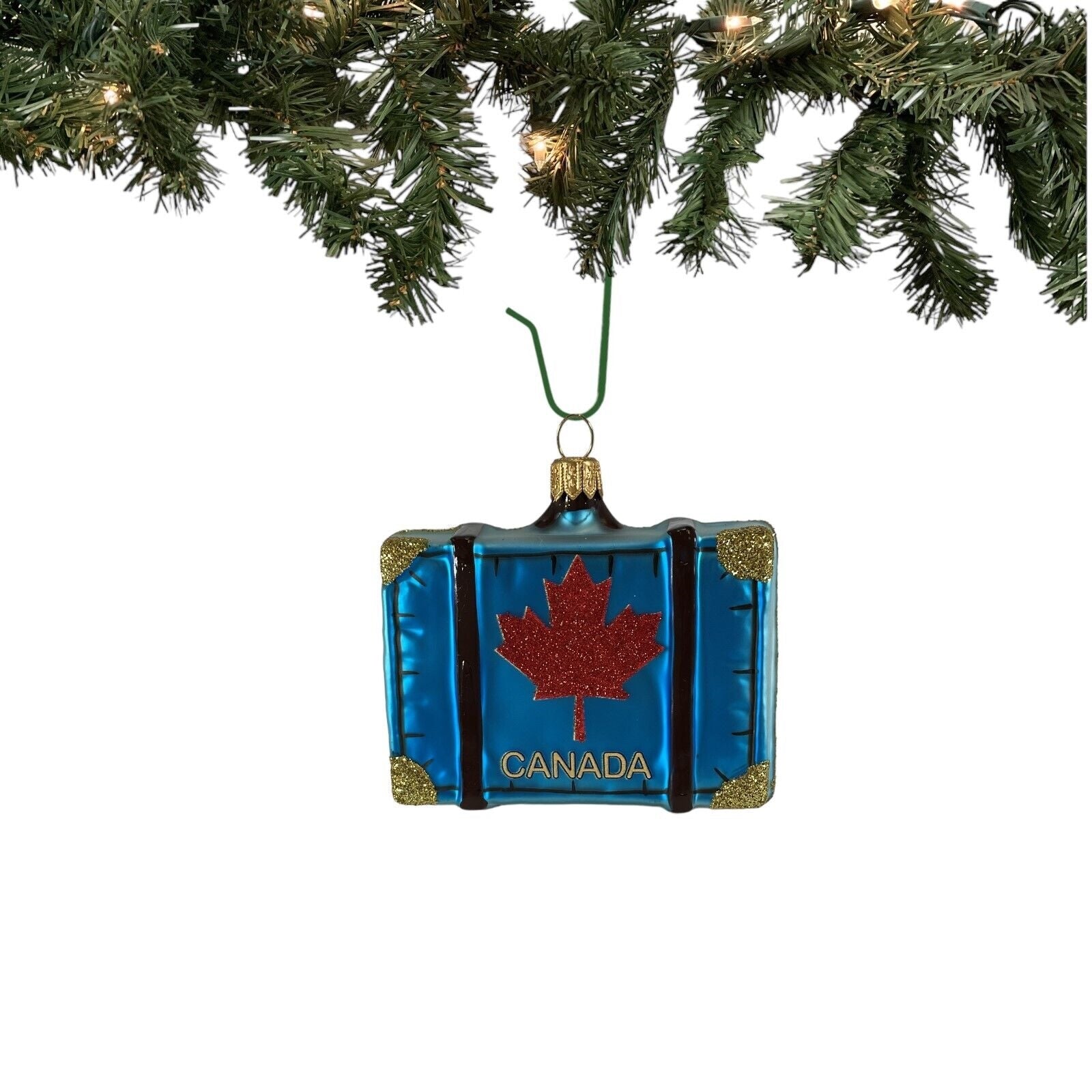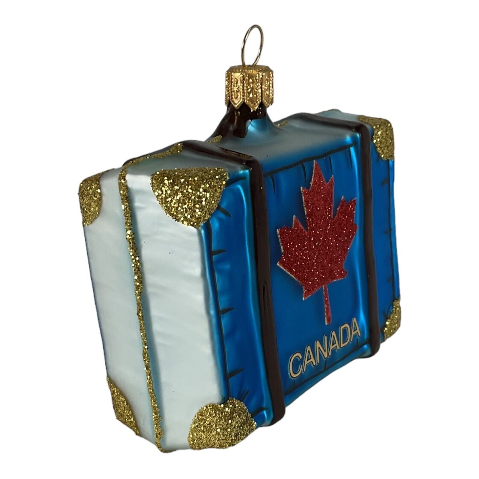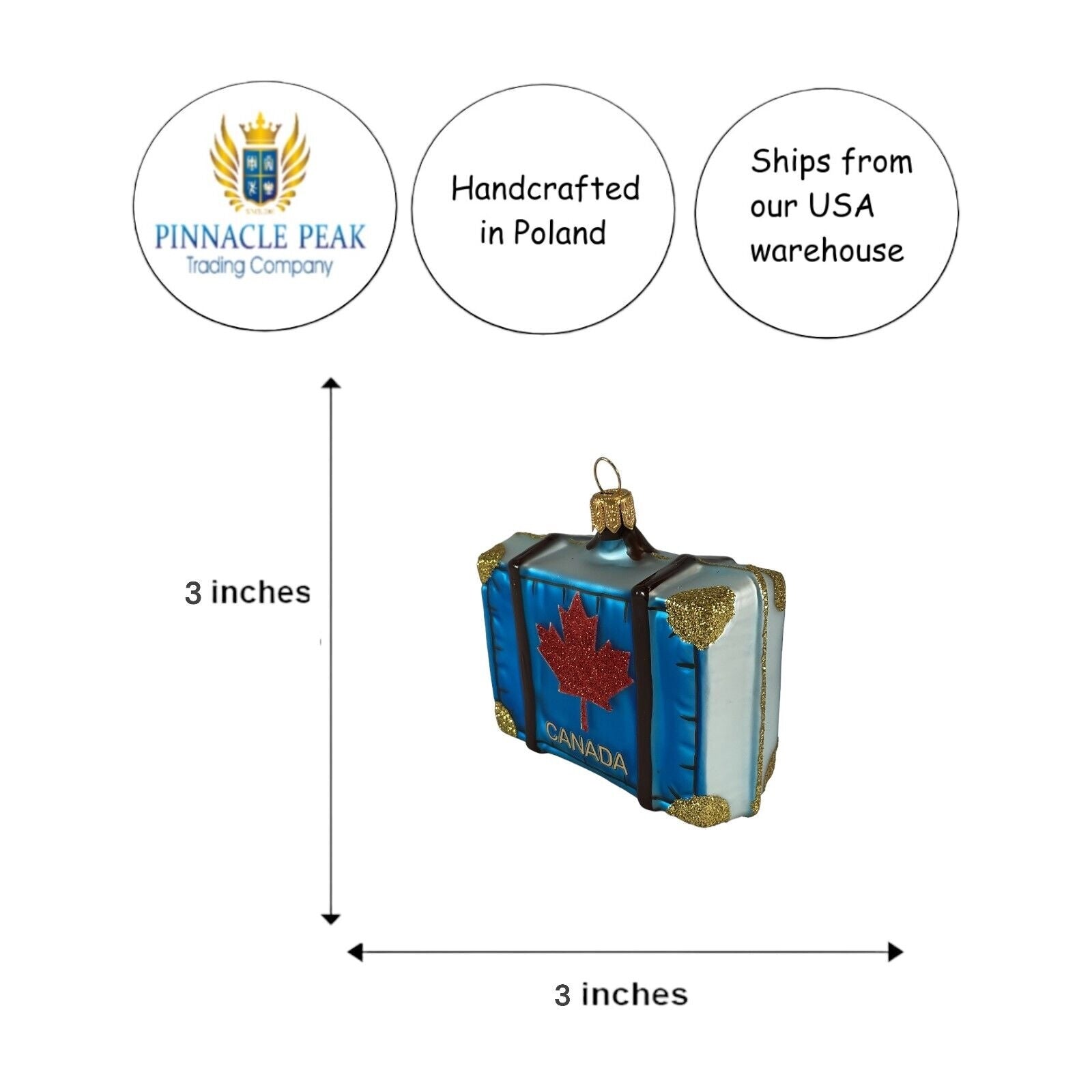 Canada Travel Suitcase Ornament. Handcrafted in Poland. Hand-painted by Polish artisans. Made from mouth blown glass. Approximately 3.3 x 1.25 x 2.75 inches (LxWxH). Comes packaged in a gift box. Includes ONE ornament - picture shows front and back of one ornament. Imported by Pinnacle Peak Trading Company.