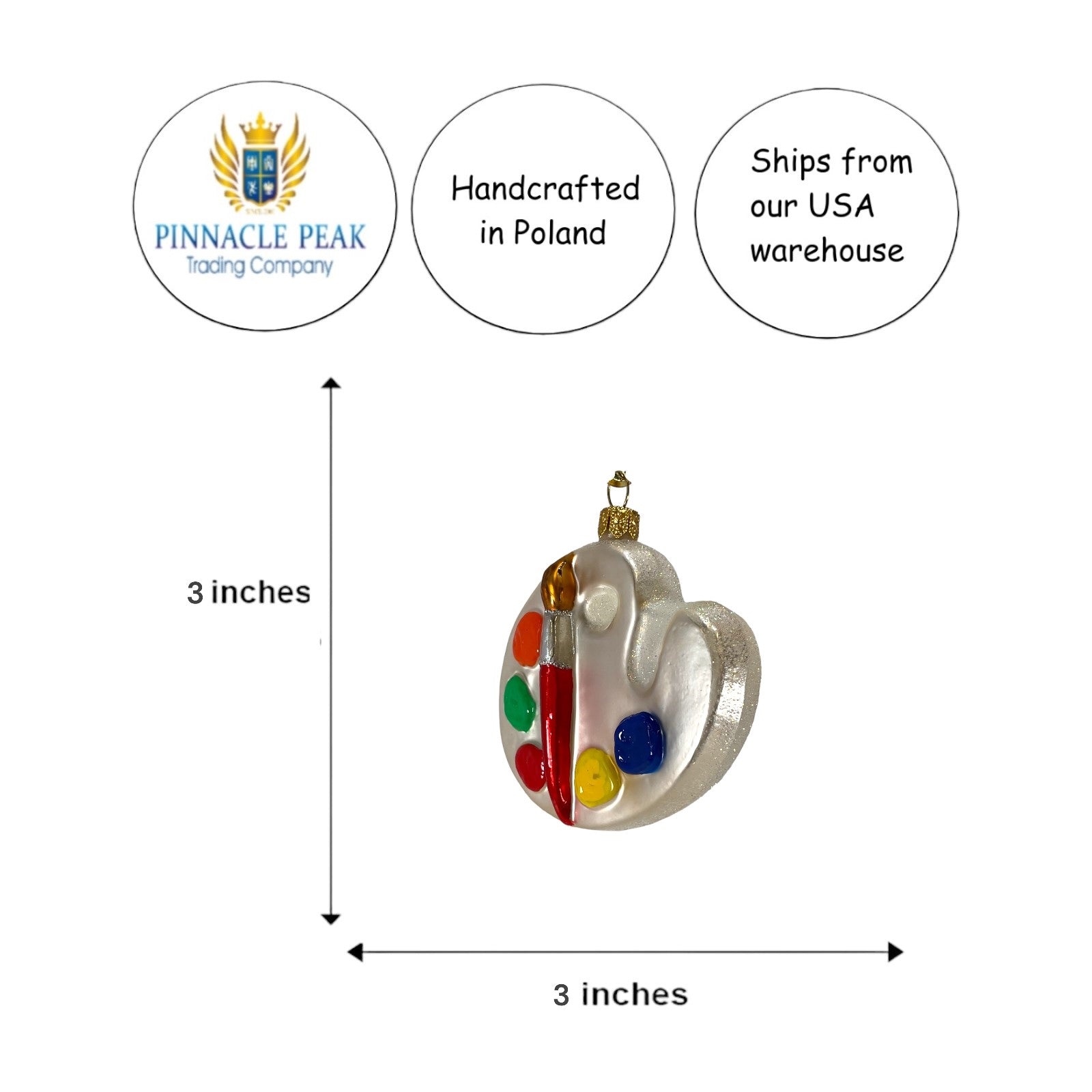 Paint Palette Ornament. Handcrafted in Poland. Hand-painted by Polish artisans. Made from mouth blown glass. Approximately 3 inches tall. Includes original Pinnacle Peak Trading box and packaging. Imported by Pinnacle Peak Trading Company.