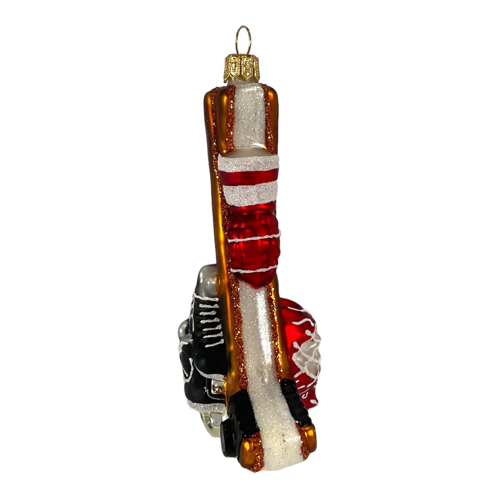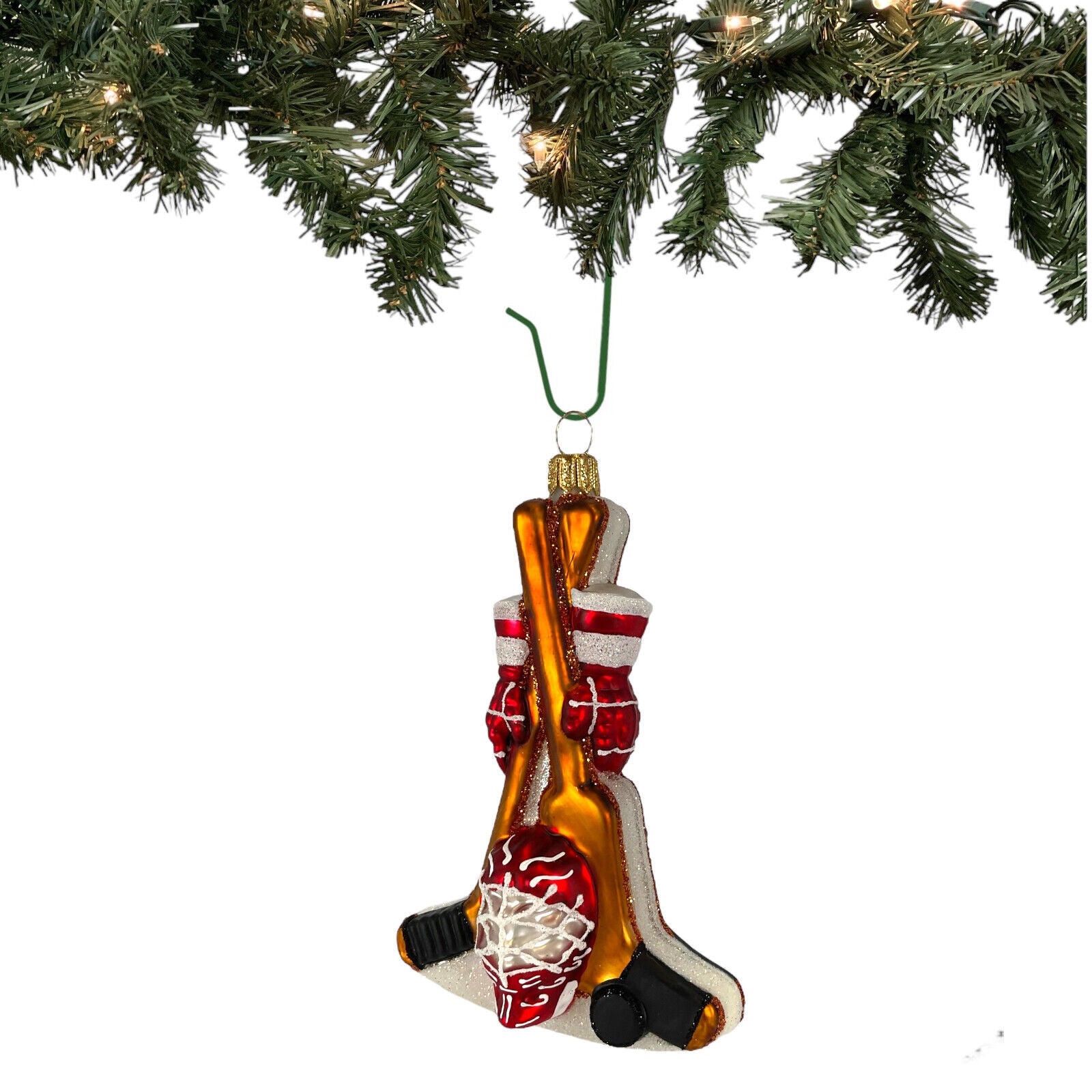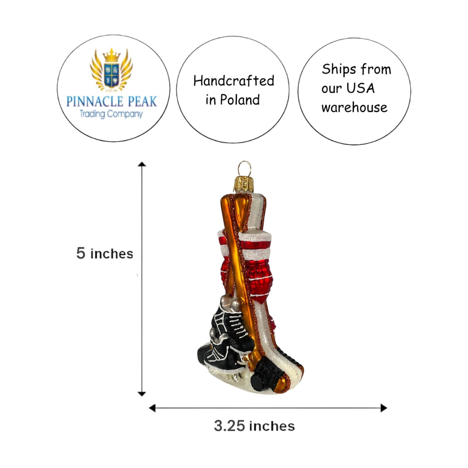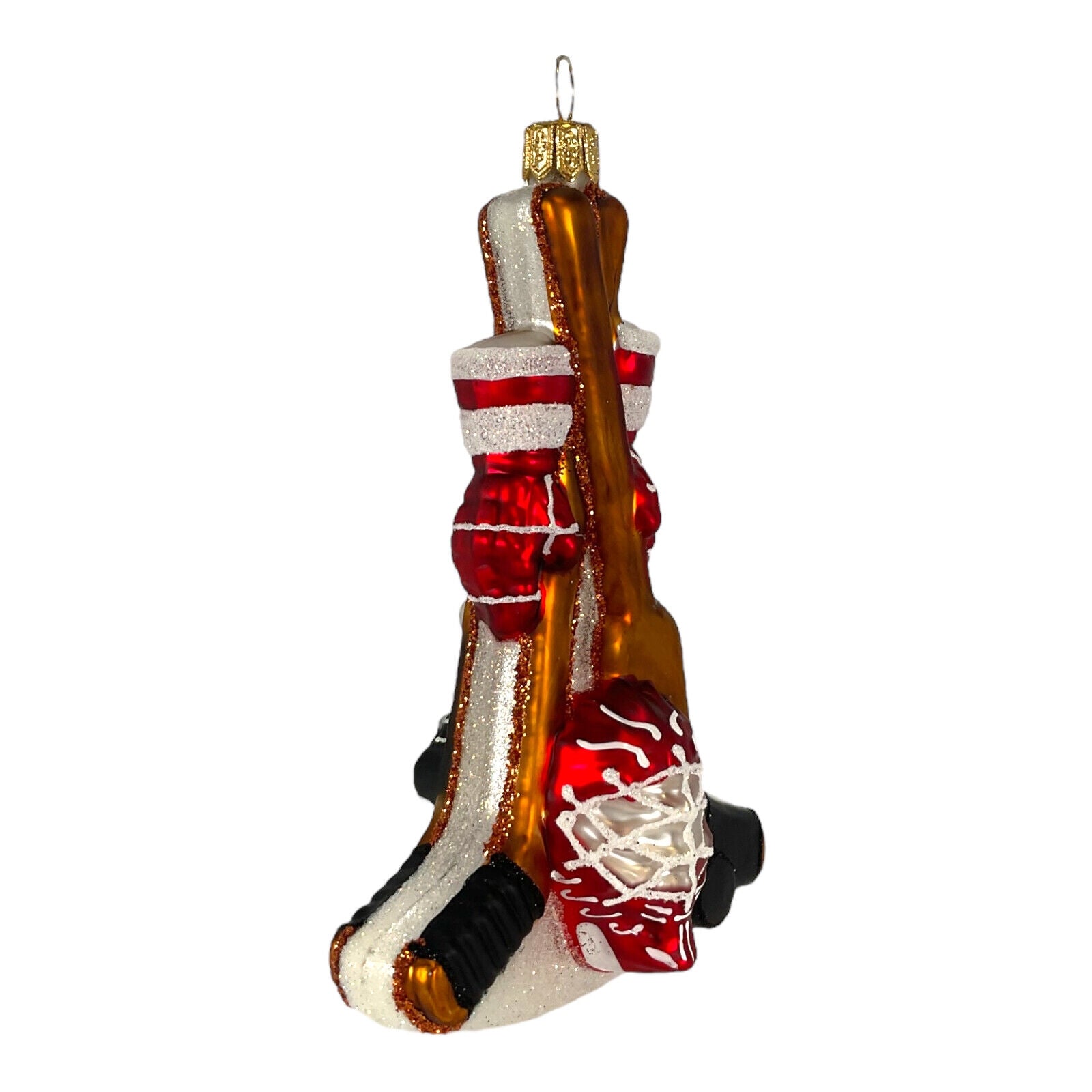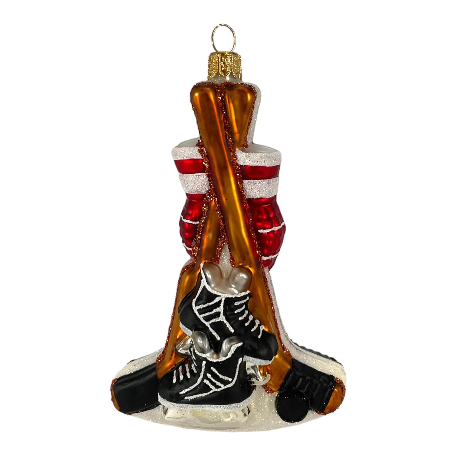 Hockey Equipment Ornament. Handcrafted in Poland. Hand-painted. Made from mouth blown glass. Approximately 5 inches tall (12.7 cm). Approximately 3.25 inches long (8.3 cm). Approximately 1.5 inches wide (3.8 cm). Comes packaged in a gift box. Imported by Pinnacle Peak Trading Company. This ornament features a hockey stick, puck, helmet, gloves and ice skates. The realistic design and bright colors make it the perfect addition to any hockey fan's Christmas tree.