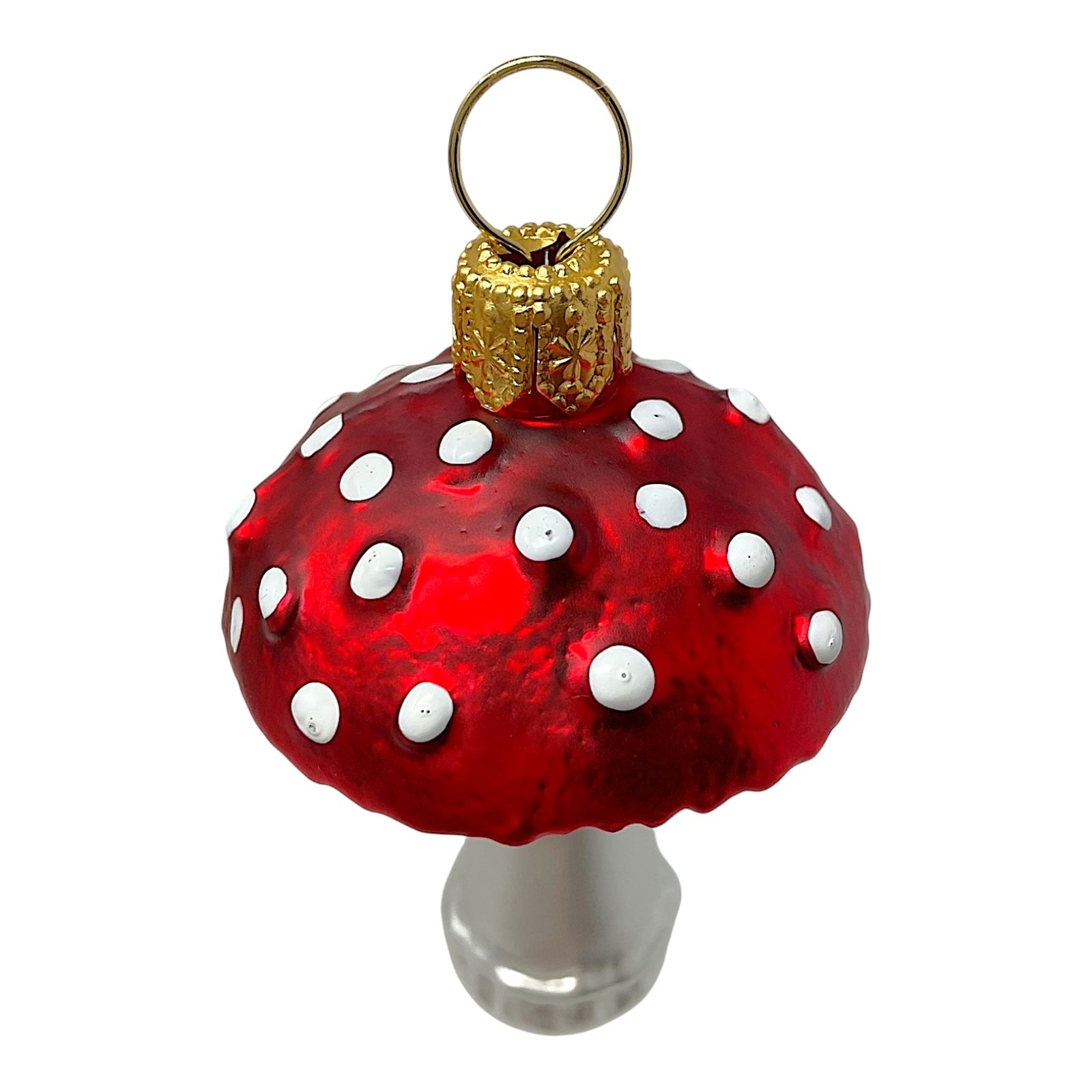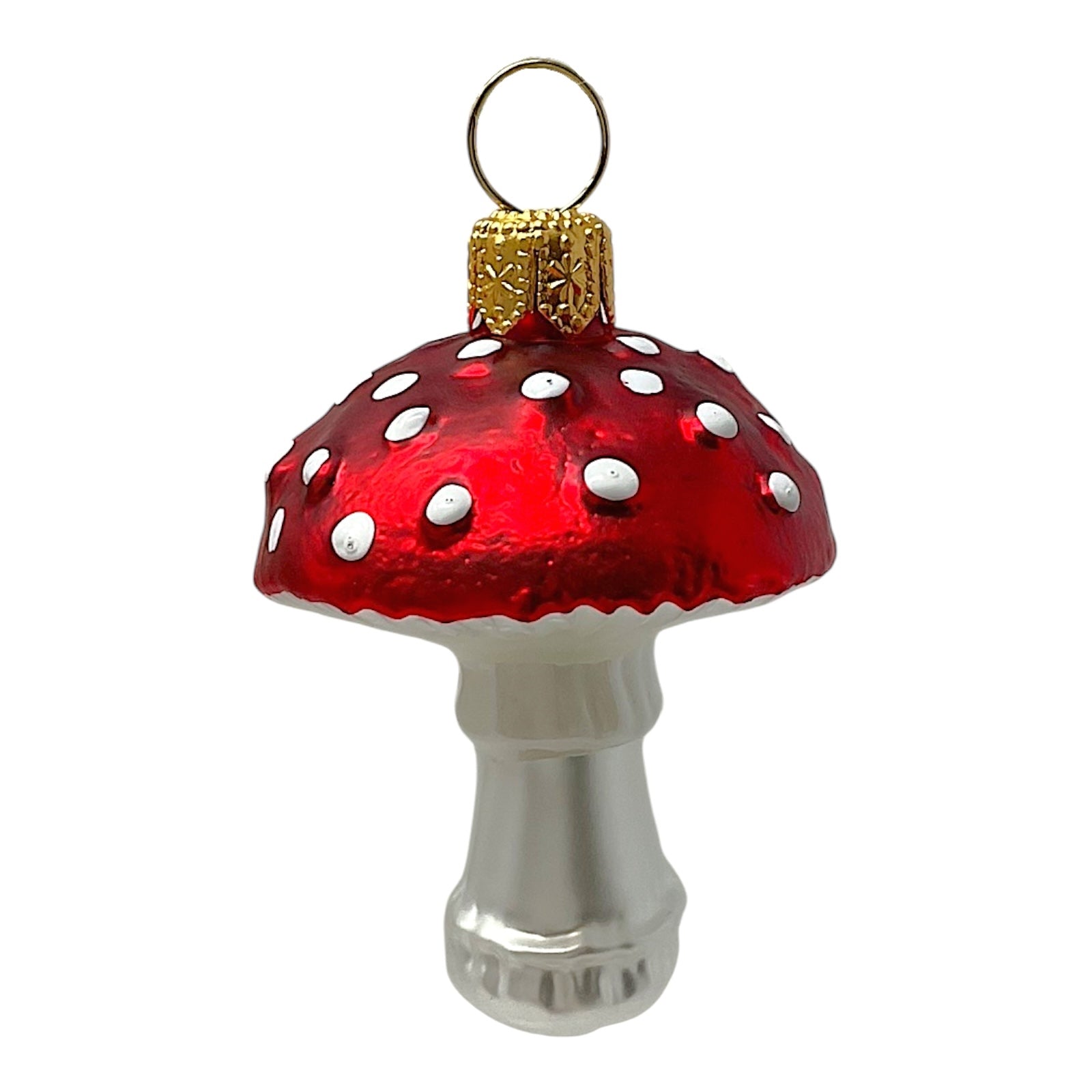 Red Toadstool Ornaments. Set of 2. Handcrafted in Poland. Hand-painted by Polish artisans. Made from mouth blown glass. Approximately 1.25 x 1.25 x 2 inches (LxWxH). Includes original Pinnacle Peak Trading box and packaging. Imported by Pinnacle Peak Trading Company.