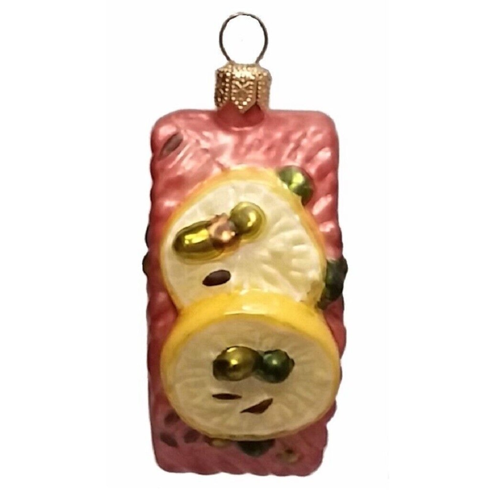 Piece of Salmon with Lemon Ornaments. Set of 2. Handcrafted in Poland. Hand-painted by Polish artisans. Made from mouth blown glass. Approximately 3 inches tall, 1.25 inches wide, and 1.25 inches deep. Includes original Pinnacle Peak Trading box and packaging. Imported by Pinnacle Peak Trading.