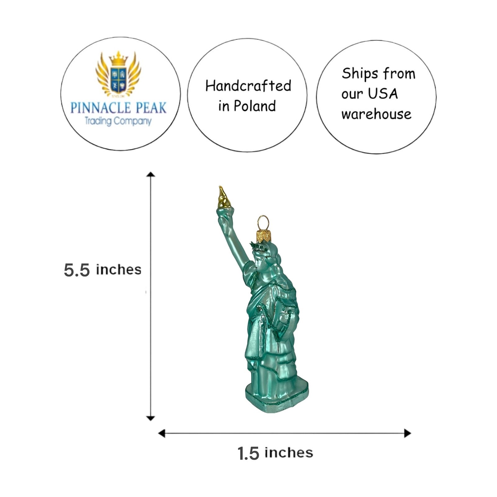 Statue of Liberty Ornament. Handcrafted in Poland. Hand-painted. Made from mouth blown glass. Approximately 1.5 x 1.5 x 5.5 inches (LxWxH). Includes original. Pinnacle Peak Trading box and packaging. Imported by Pinnacle Peak Trading Company.