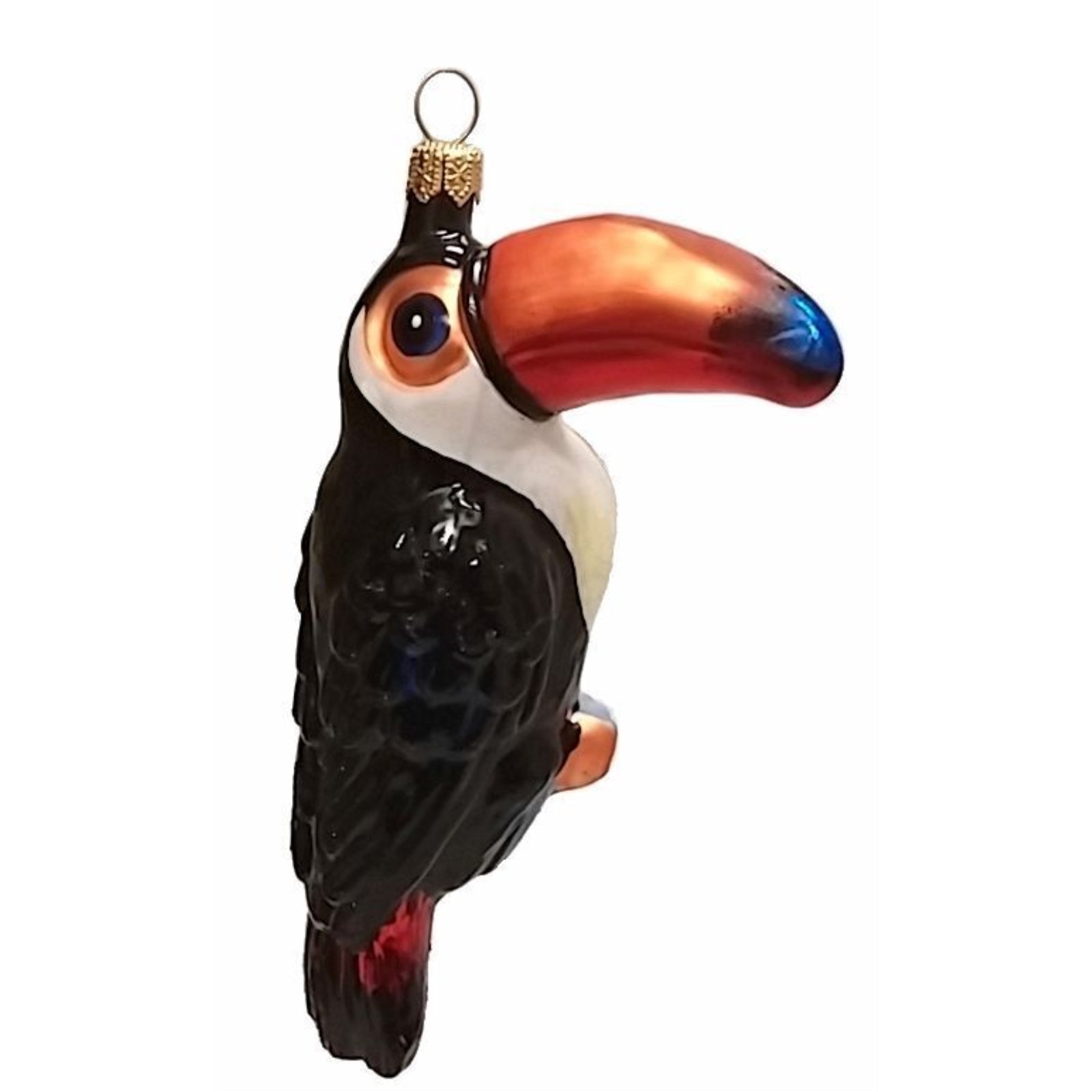 Toucan Ornament. Handcrafted in Poland. Hand-painted by Polish artisans. Made from mouth blown glass. Approximately 2.5 x 1.75 x 5 inches. Includes original Pinnacle Peak Trading box and packaging. Imported by Pinnacle Peak Trading.