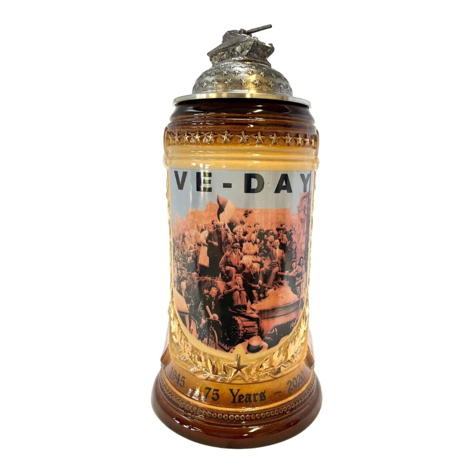VE Day 75th Anniversary Beer Stein. 1,000 piece limited edition. Handcrafted in Germany. Hand painted. Made from stoneware with pewter lid. Approximately 9.75 inches tall (25 cm). .75 Liter. Stamped on bottom with Manufacturers logo. Manufactured for Pinnacle Peak Trading by King-Werks. King-Werks, also know as Wuerfel and Mueller, is one of the few remaining German stein companies that still produce 100% of their steins in Germany with 100% German materials and labor.